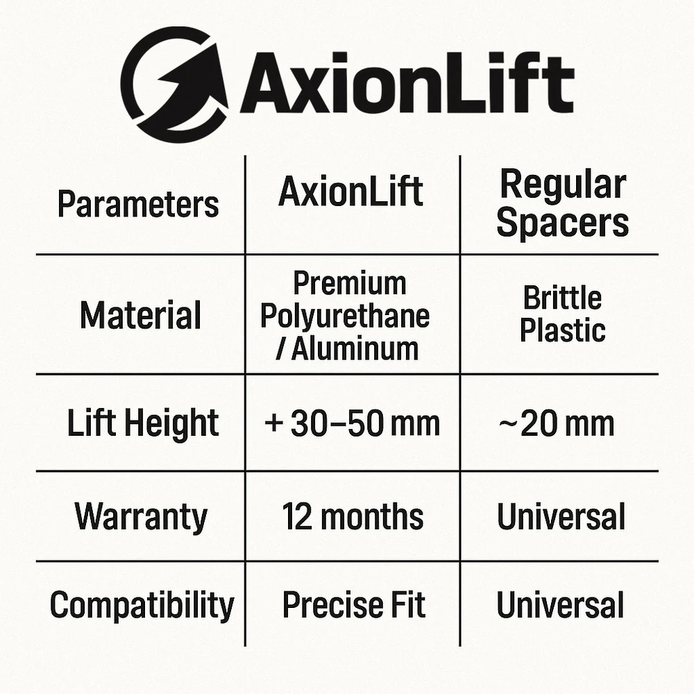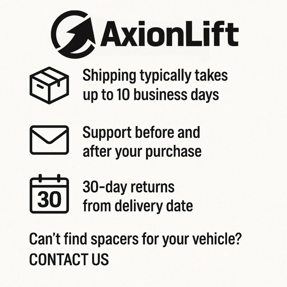 AXIONLIFT VEHICLE COMPATIBILITY: Volkswagen Amarok (2HA / 2HB / S1B), 2010–2021 KIT INCLUDES: 2 pcs Front Strut Spacers - Left & Right 2 pcs Rear Lift Blocks - Left & Right 4 pcs Rear U Bolt Fixing Elements MATERIAL: Aircraft-grade aluminum Steel Shipping & Returns Shipping usually takes up to 10 business days from Ukraine to US/EU. 30-day return policy from the delivery date. Hassle-free returns guaranteed. Support before and after purchase — we’re always here to help! Can’t find spacers for your vehicle? Contact us and we’ll help you pick the right ones.