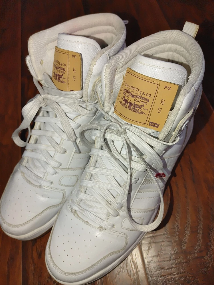 Levi Strauss all white high top sneakers. Size 9.5 men's. Pre-owned. Red brand tag on both shoes and big brand patch on tongue. Original laces and shoes show signs of wear. Some light red tint on inside/outside of one shoe. Attention: Vintage/thrifted items can have loose threads, faded colors, discoloration, pilling, and/or mild odors. Major defects will be listed. Some specialty fabrics, NWT items, or bulkier items may not be washed. All questions related to color, size, or condition prior to purchase.