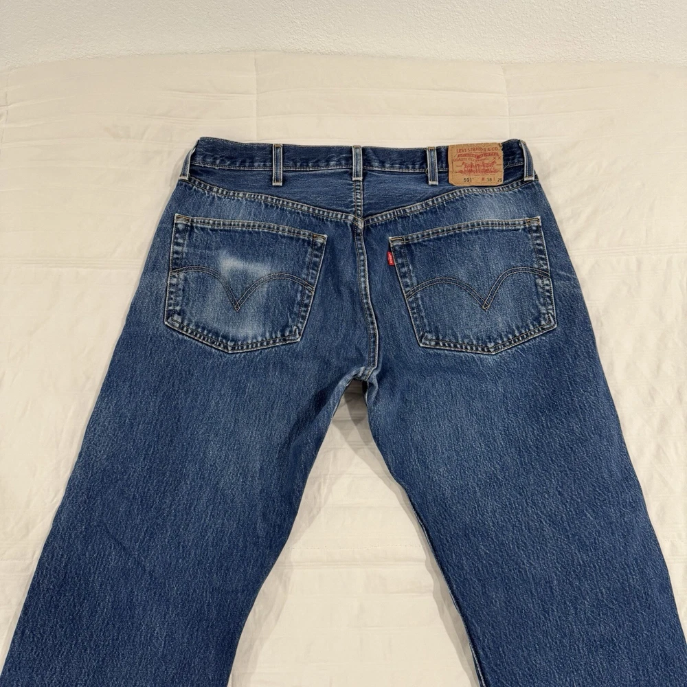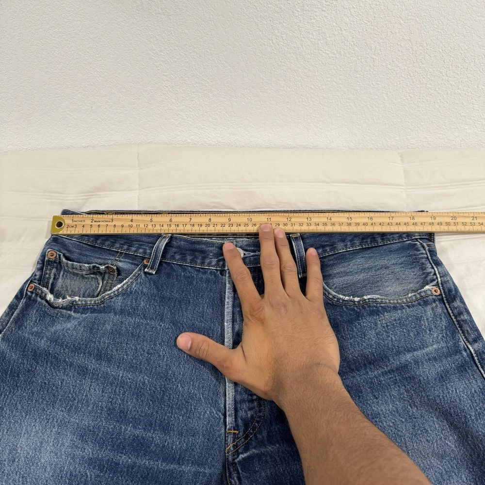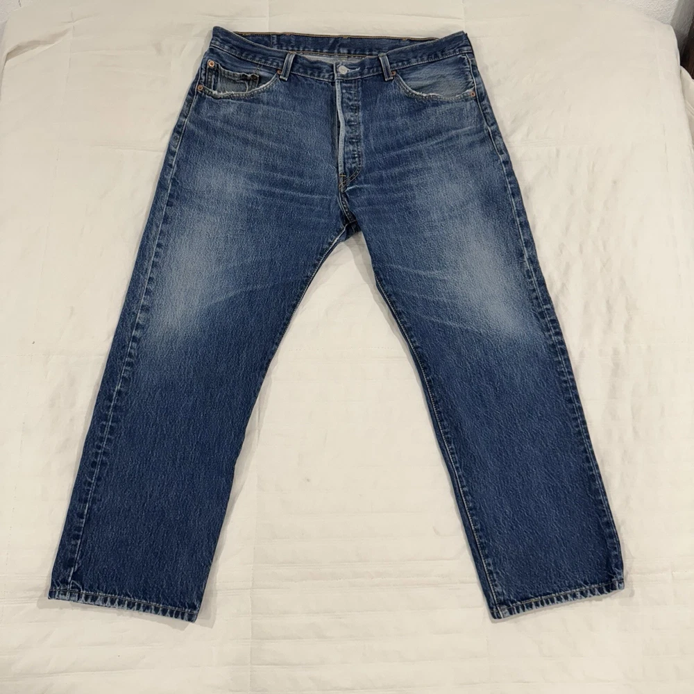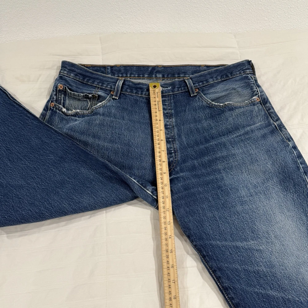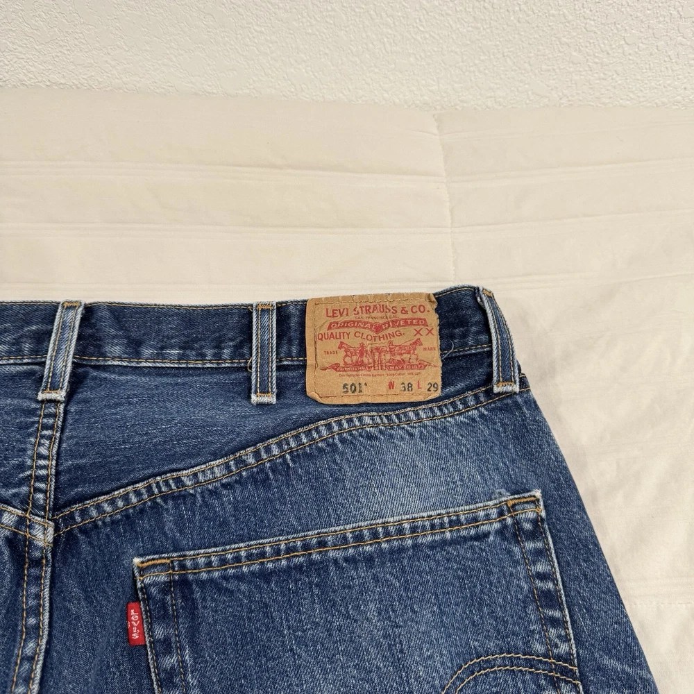 The Levi's 501 Blue Jeans are a vintage pair of denim pants in a medium wash. They feature a straight fit with a 38-inch waist and a 29-inch inseam. Made from cotton denim, these jeans have a classic button closure and a Levi's logo accent. The design includes wallet whiskering and fading for a worn-in look, perfect for a timeless and stylish addition to any wardrobe.