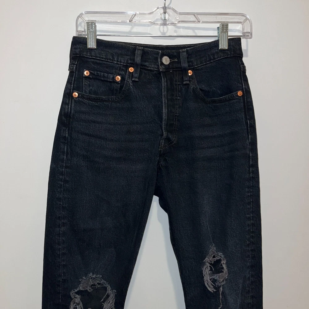 These Levi's jeans embody a timeless style with a modern twist. The distressed details offer a trendy edge while maintaining the classic Levi's fit and comfort. Durable and versatile, these jeans are suited for both casual and semi-formal settings. • Button-fly closure • Classic five-pocket design • Distressed knee accents • High-rise waist • Signature Levi's patch and tab Size 24 Smoke Free Home Great Preowned conditions