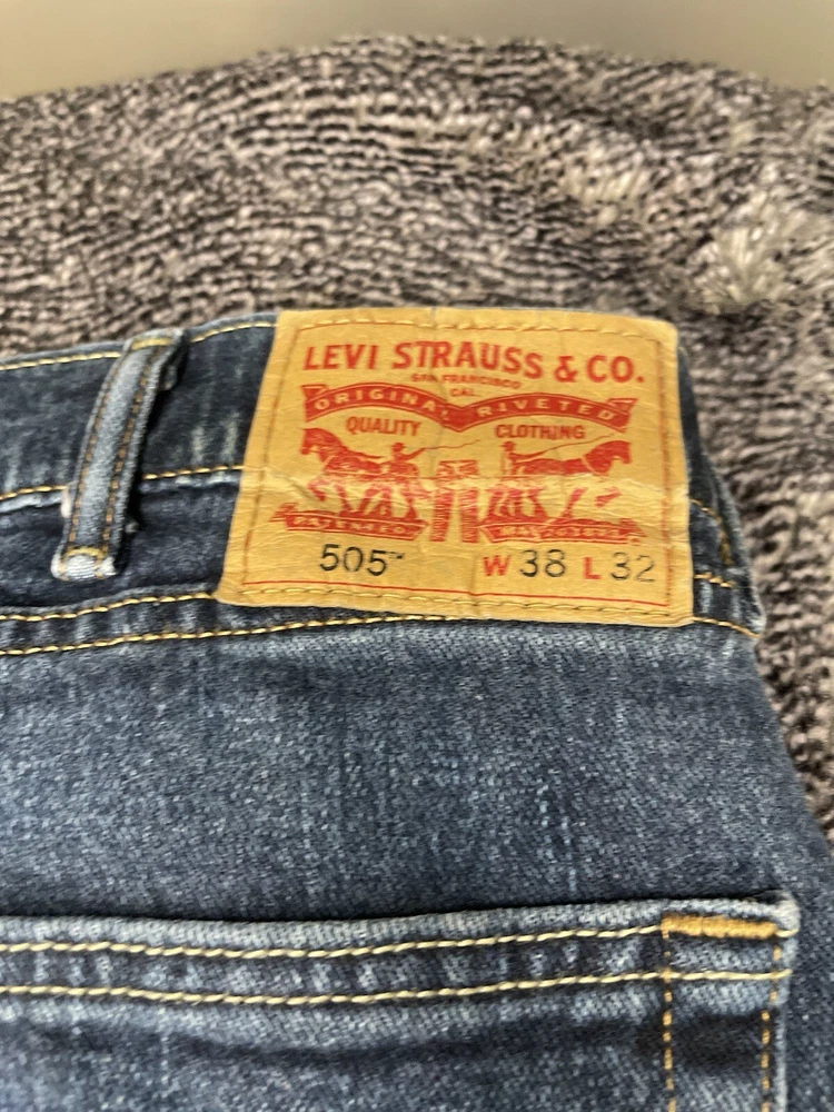 Fit: Regular Waist Size: 38 in Style: Straight Inseam: 32 in Material: Cotton Fabric Wash: Dark Accents: Zipper, Button, Logo gtin13: n/a Garment Care: Machine Washable Type: Jeans Pocket Type: 5-Pocket Design Theme: USA, Cowboy, Biker, Beer, Christmas, City, College, Festival, Holiday, Preppy, Wedding, Winter Rise: Mid (10-12 in) UPC: n/a Size: 38 Country/Region of Manufacture: Unknown Closure: Zip, Button Features: Pockets, Comfort, Easy Care, Lightweight Product Line: Levi's 500 Series Department: Men Pattern: Solid Handmade: No Season: Winter, Summer, Spring, Fall Personalize: No Color: Blue Model: Levi's 505 Vintage: No Brand: Levi's Fabric Type: Denim Size Type: Regular