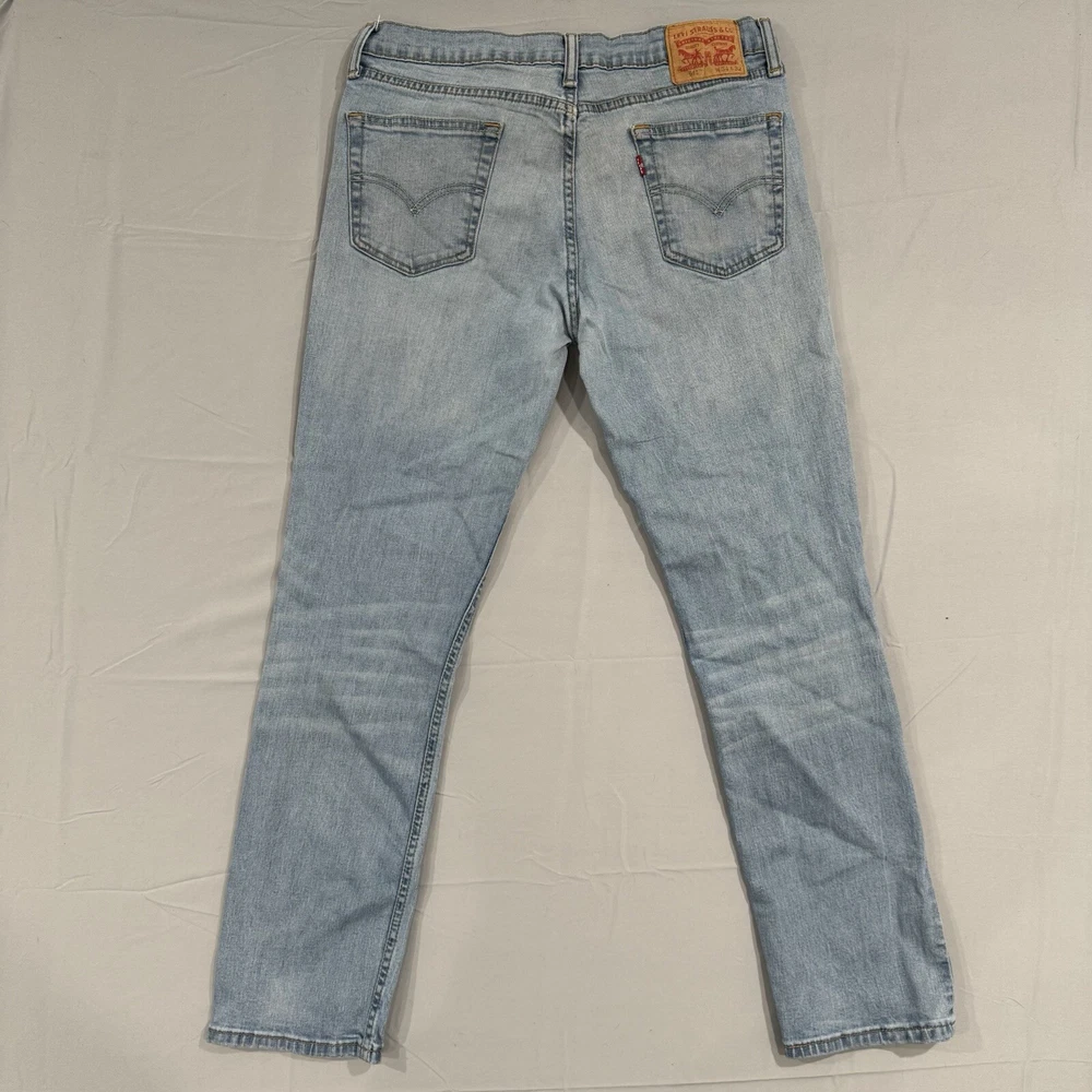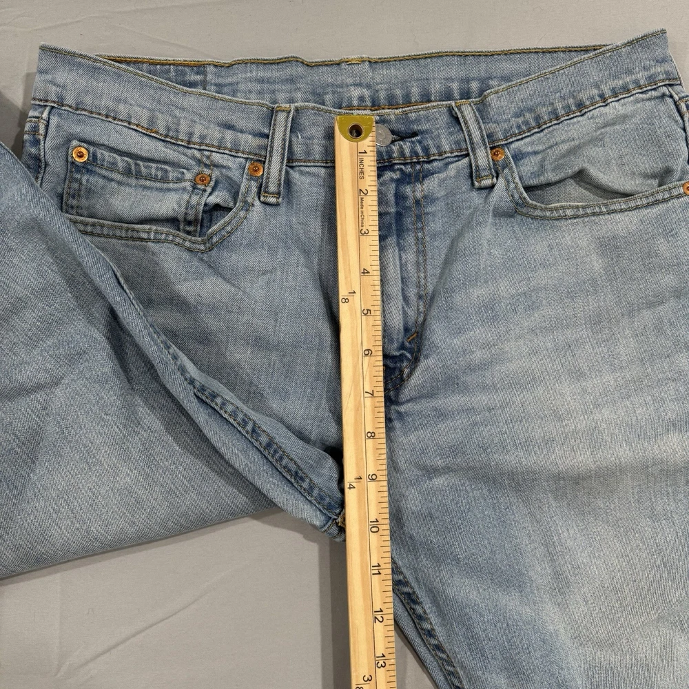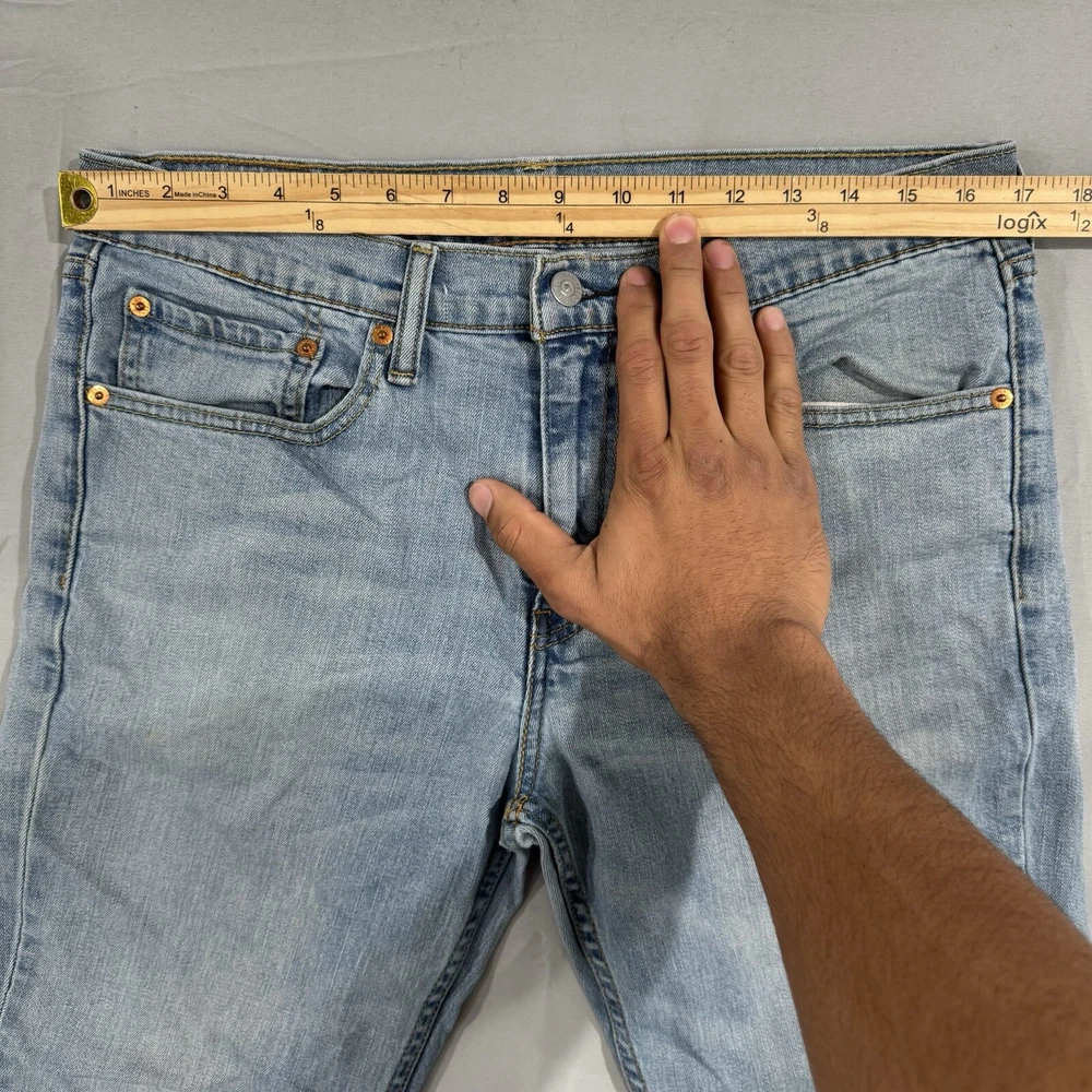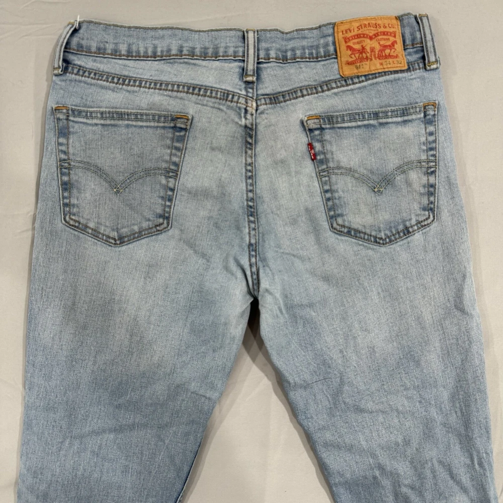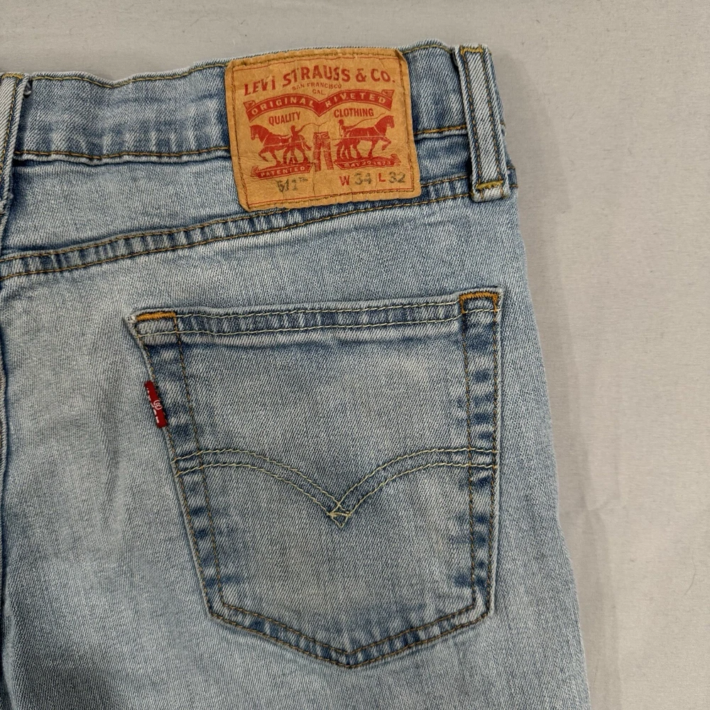 The Levi's 511 Jeans are a men's size 34x32 in a slim straight fit. Made from a denim fabric blend with a medium wash, they feature whiskering and fading details for a worn-in look. These jeans have a mid-rise and a 5-pocket design with belt loops. The Levi's 511 model is designed to be slimming and stylish, perfect for a casual yet put-together outfit. Made in Cambodia as part of the Levi's 500 Series, these jeans embody a classic American style with a touch of urban flair.