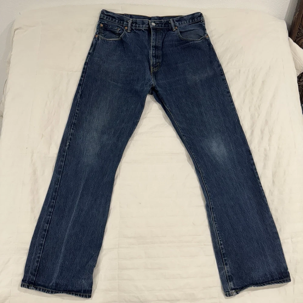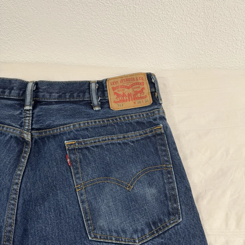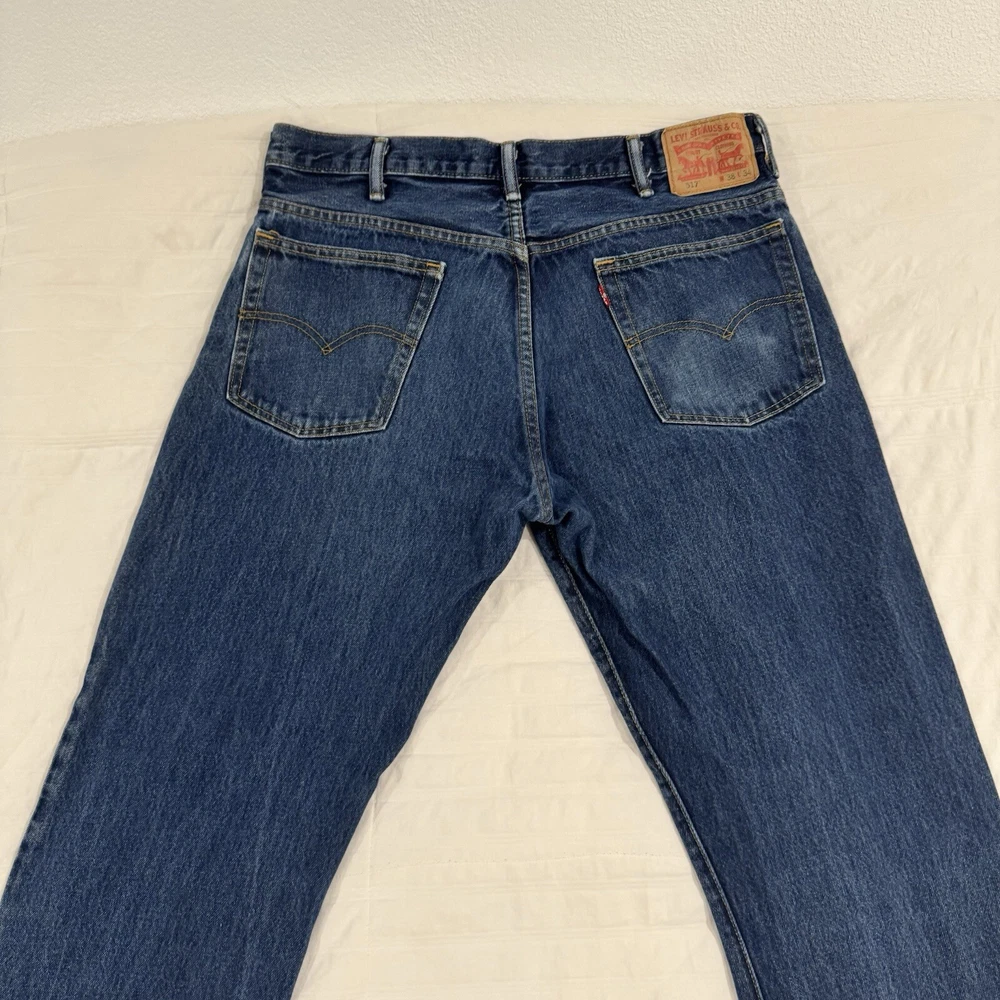 The product is a pair of Levi's 517 men's jeans in a size 38 waist and 34 inseam. They are crafted from blue denim with a dark medium wash, featuring a bootcut style and fading details. The jeans also have a unique wallet print design, adding a touch of individuality to the classic Levi's brand. Perfect for those looking for a regular fit in a stylish and comfortable pair of denim jeans.