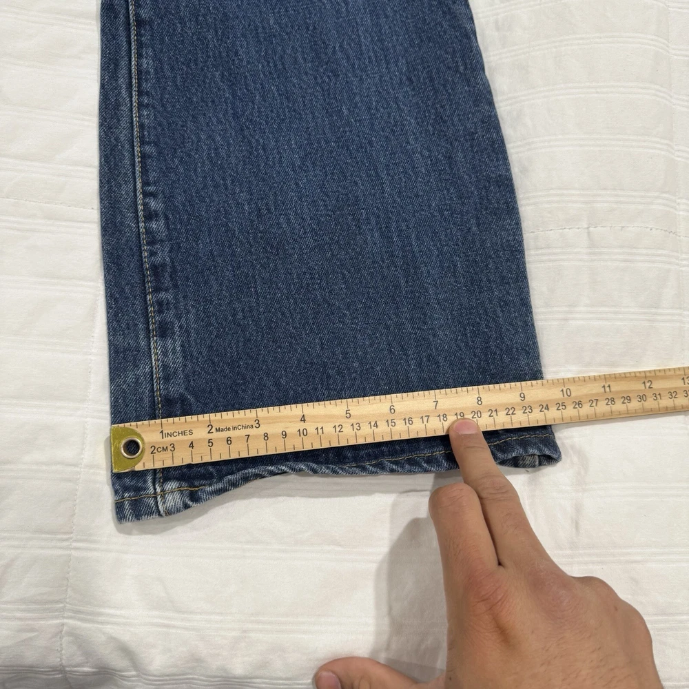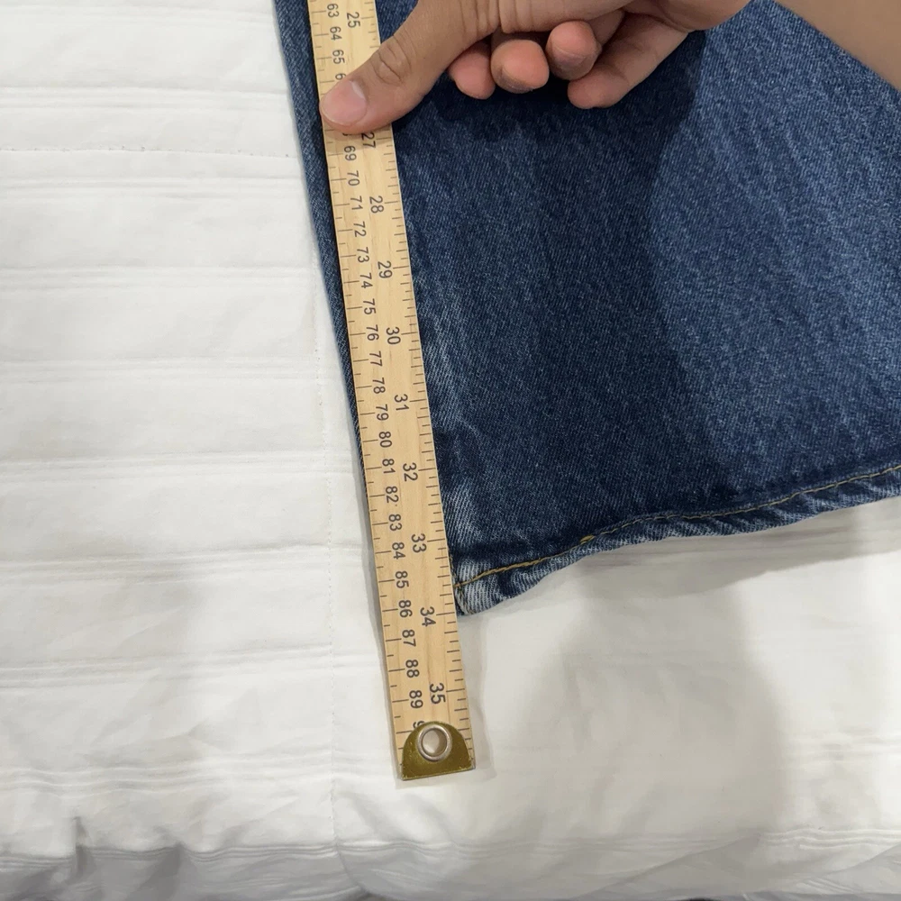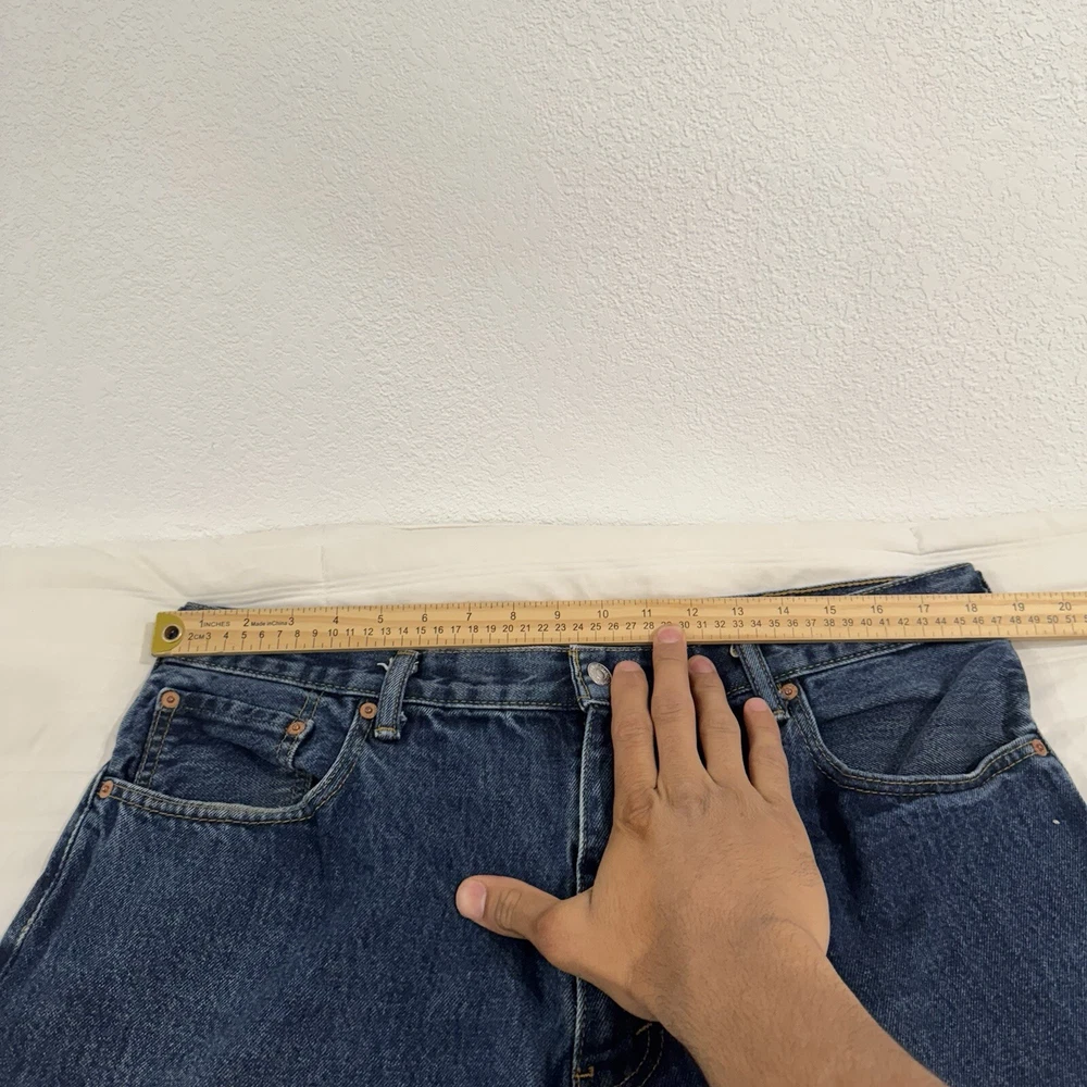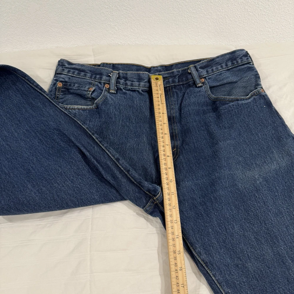 The product is a pair of Levi's 517 men's jeans in a size 38 waist and 34 inseam. They are crafted from blue denim with a dark medium wash, featuring a bootcut style and fading details. The jeans also have a unique wallet print design, adding a touch of individuality to the classic Levi's brand. Perfect for those looking for a regular fit in a stylish and comfortable pair of denim jeans.
