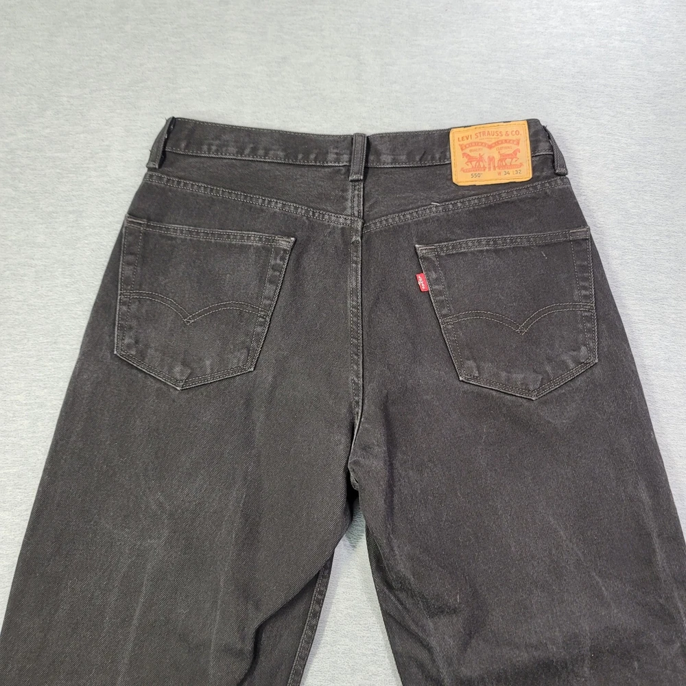 The Levi's 550 Men's Jeans in size 34x32 are made of black cotton denim with a relaxed fit and straight leg style. These mid-rise jeans feature a zip closure and are part of the Levi's 500 Series, perfect for a grunge or skate-inspired look. The brand Levi's is known for its quality and timeless designs, making these jeans a versatile and stylish addition to any wardrobe.