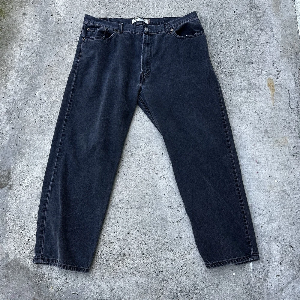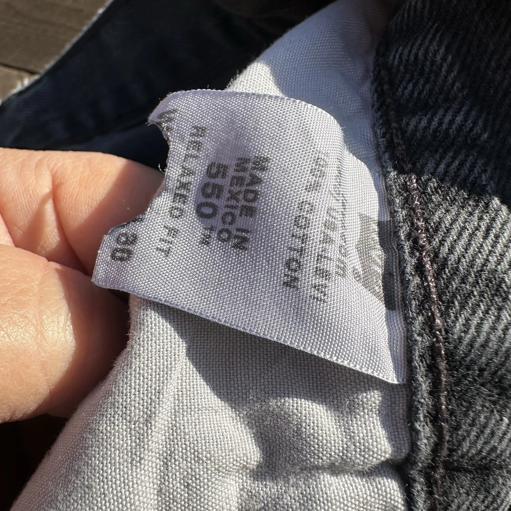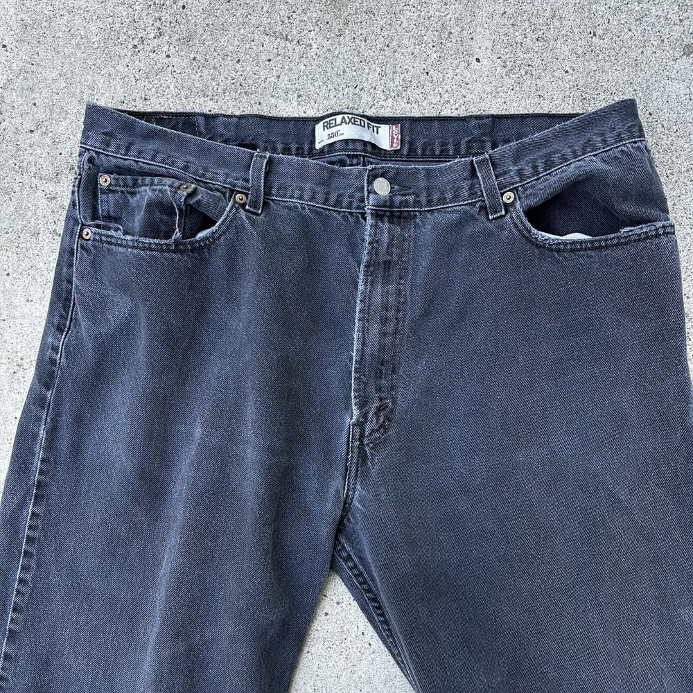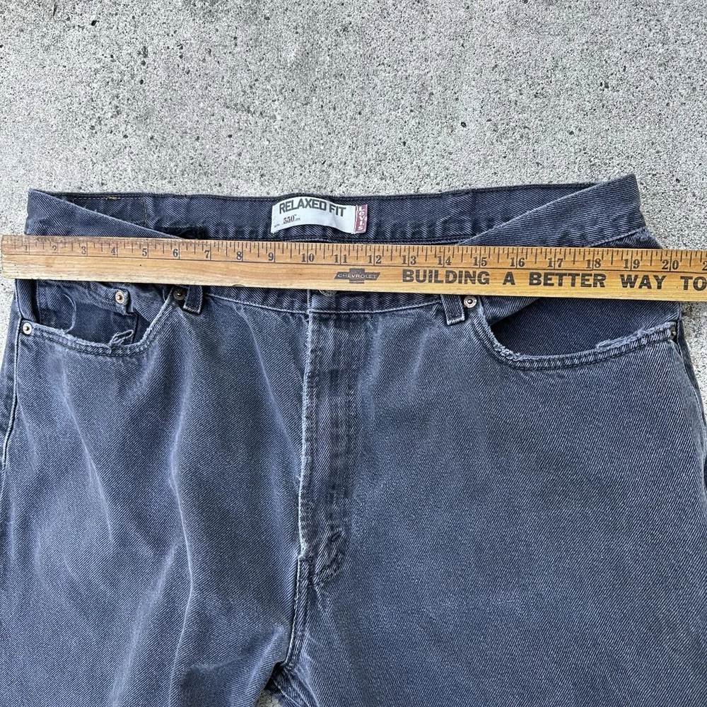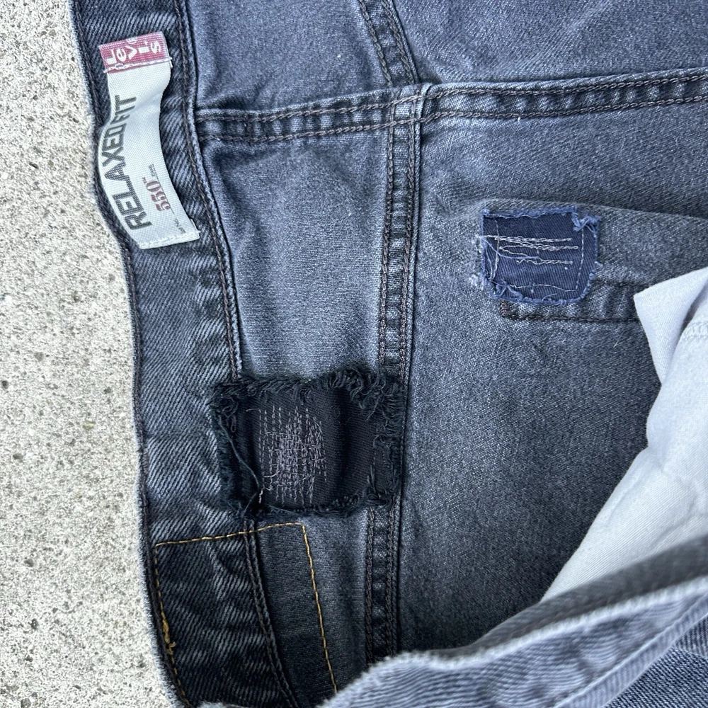 Levi's 550 Jeans for men in black, size 40x30, featuring a relaxed straight fit. Made of medium wash denim with a high rise and a zipper/button closure. The fabric is cotton denim, and the brand is Levi's. The style is part of the Levi's 500 Series, specifically model Levi's 550, and the country of manufacture is Lesotho. These pants have 3 patches for repairs. Nice fade and super comfortable and broken in.