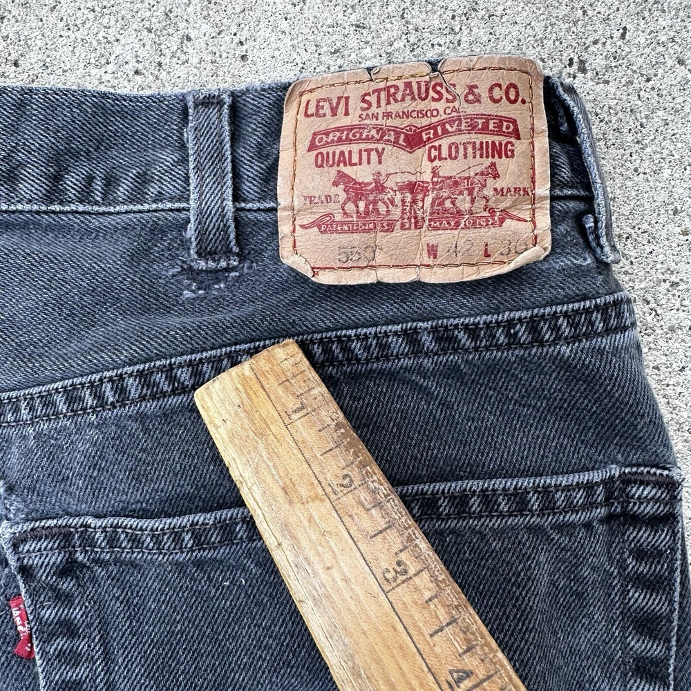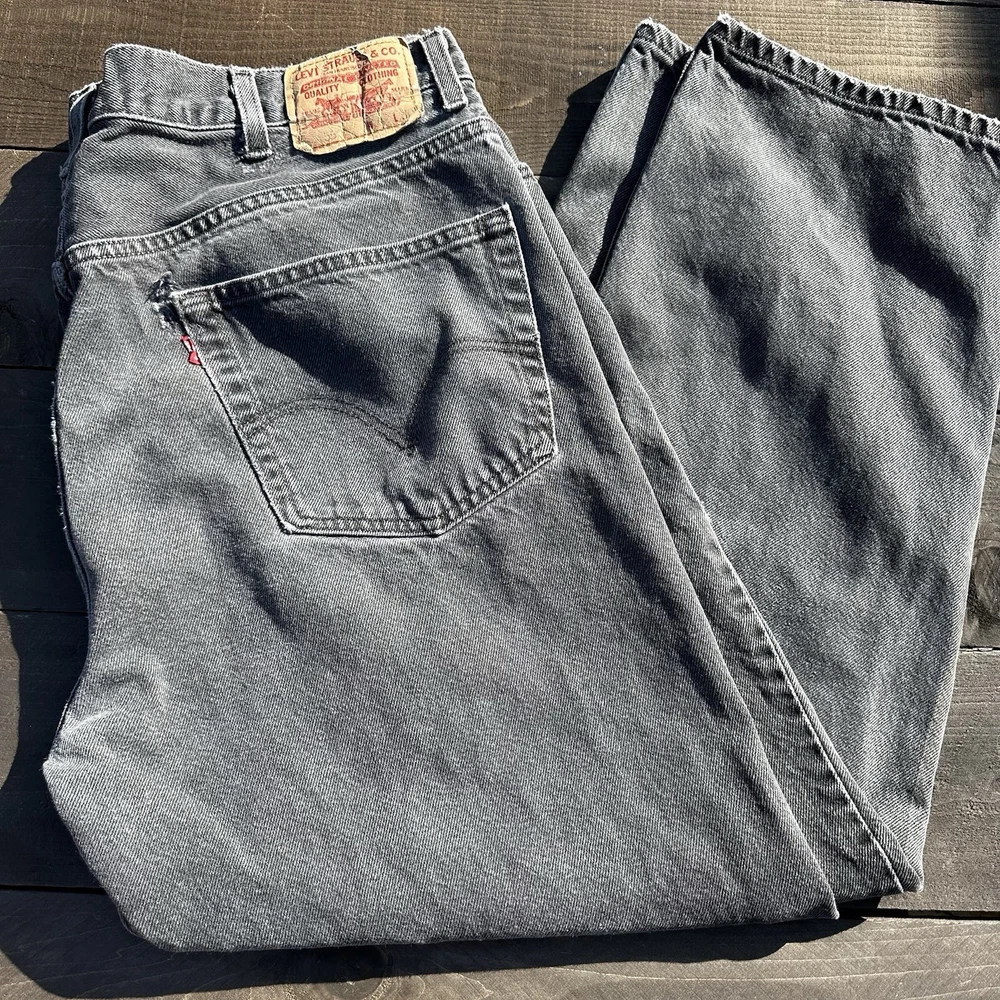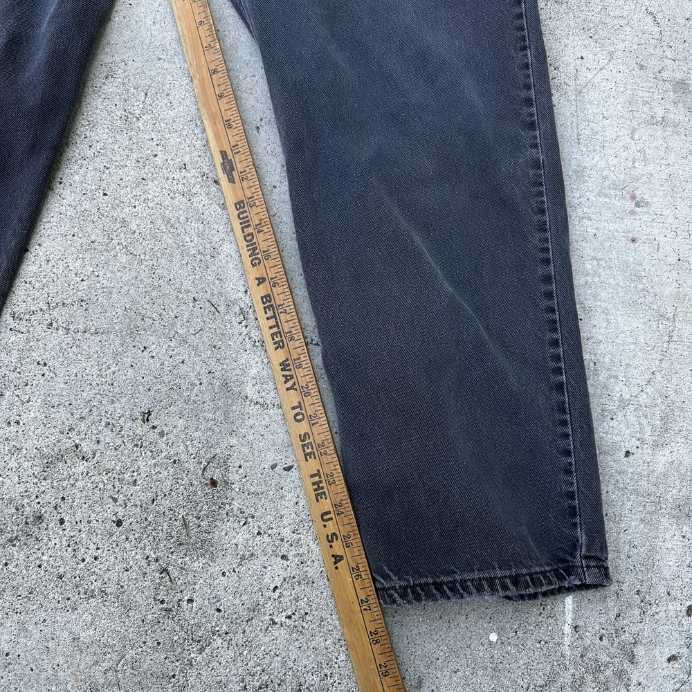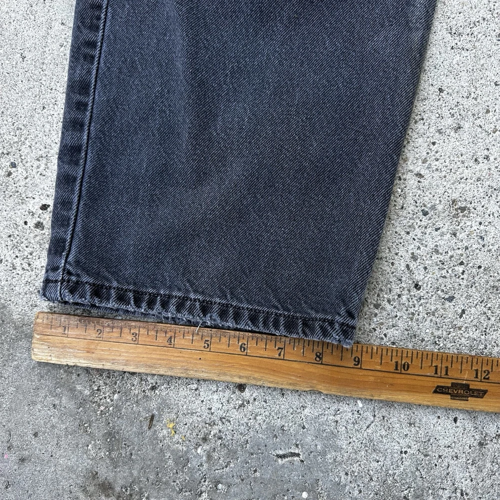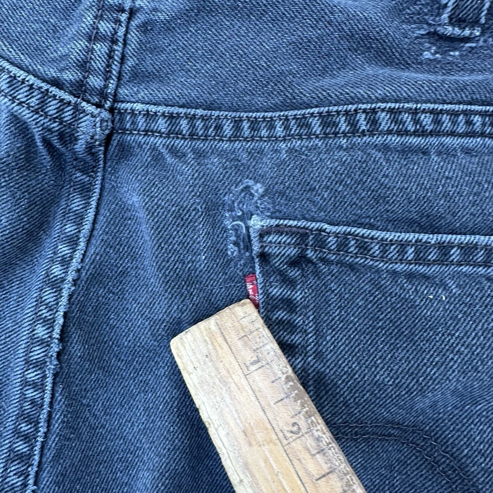 Levi's 550 Jeans for men in black, size 40x30, featuring a relaxed straight fit. Made of medium wash denim with a high rise and a zipper/button closure. The fabric is cotton denim, and the brand is Levi's. The style is part of the Levi's 500 Series, specifically model Levi's 550, and the country of manufacture is Lesotho. These pants have 3 patches for repairs. Nice fade and super comfortable and broken in.