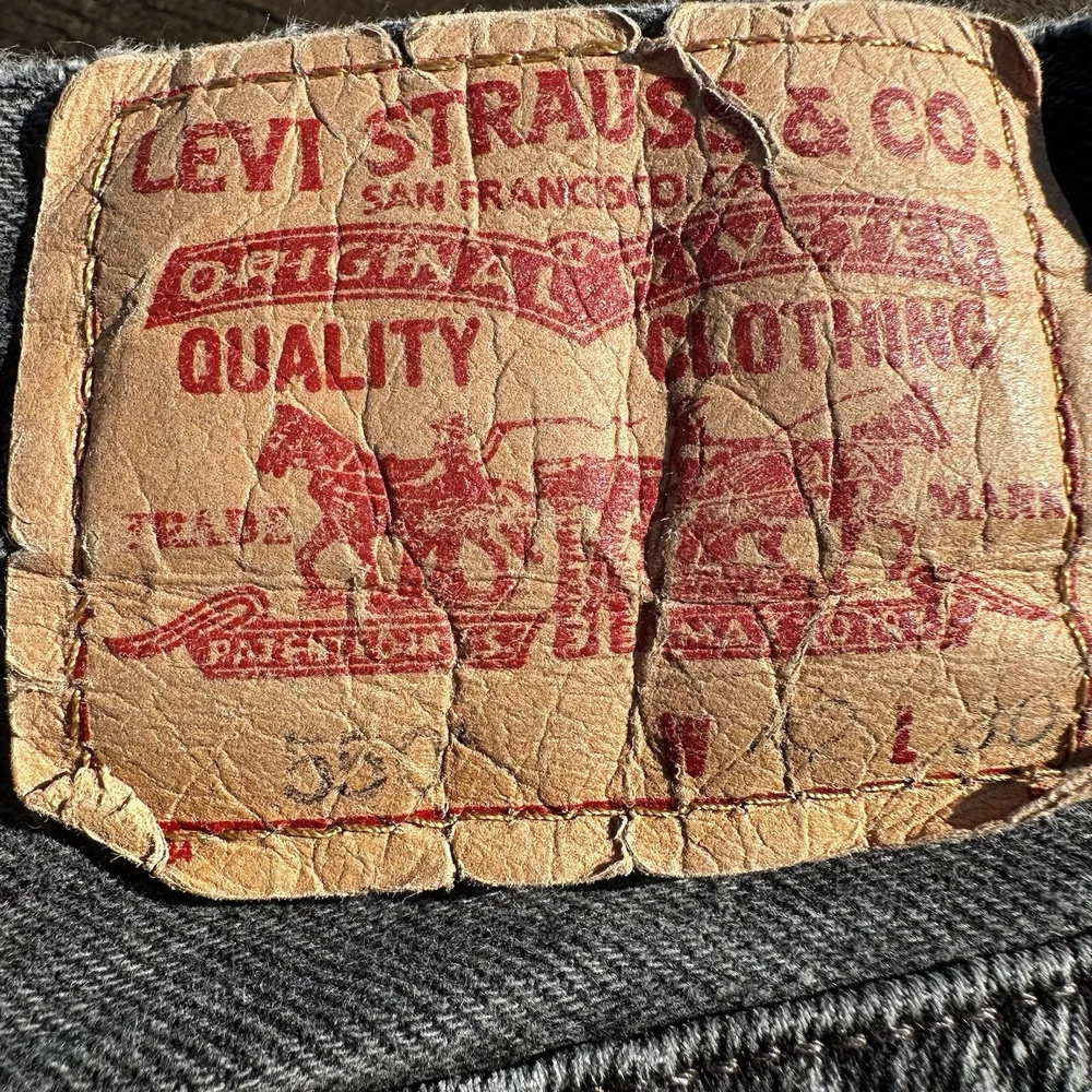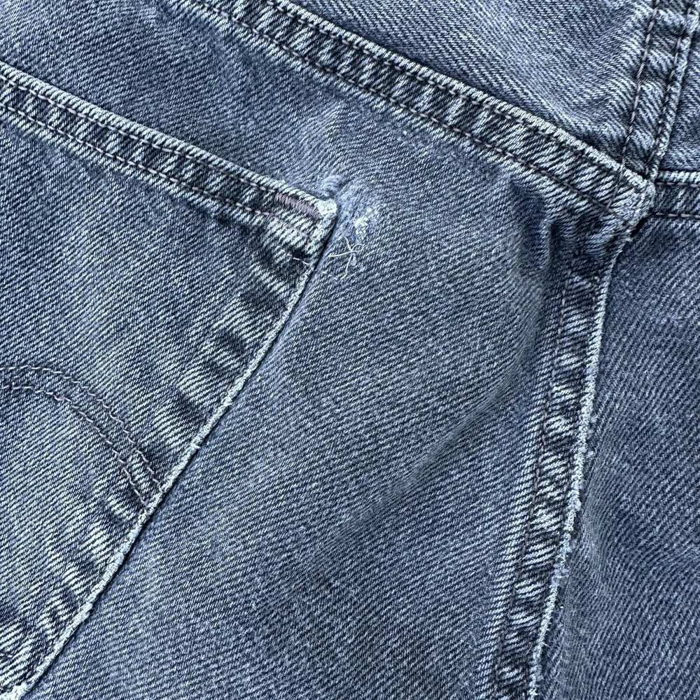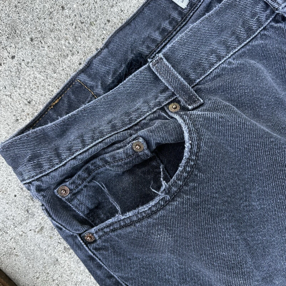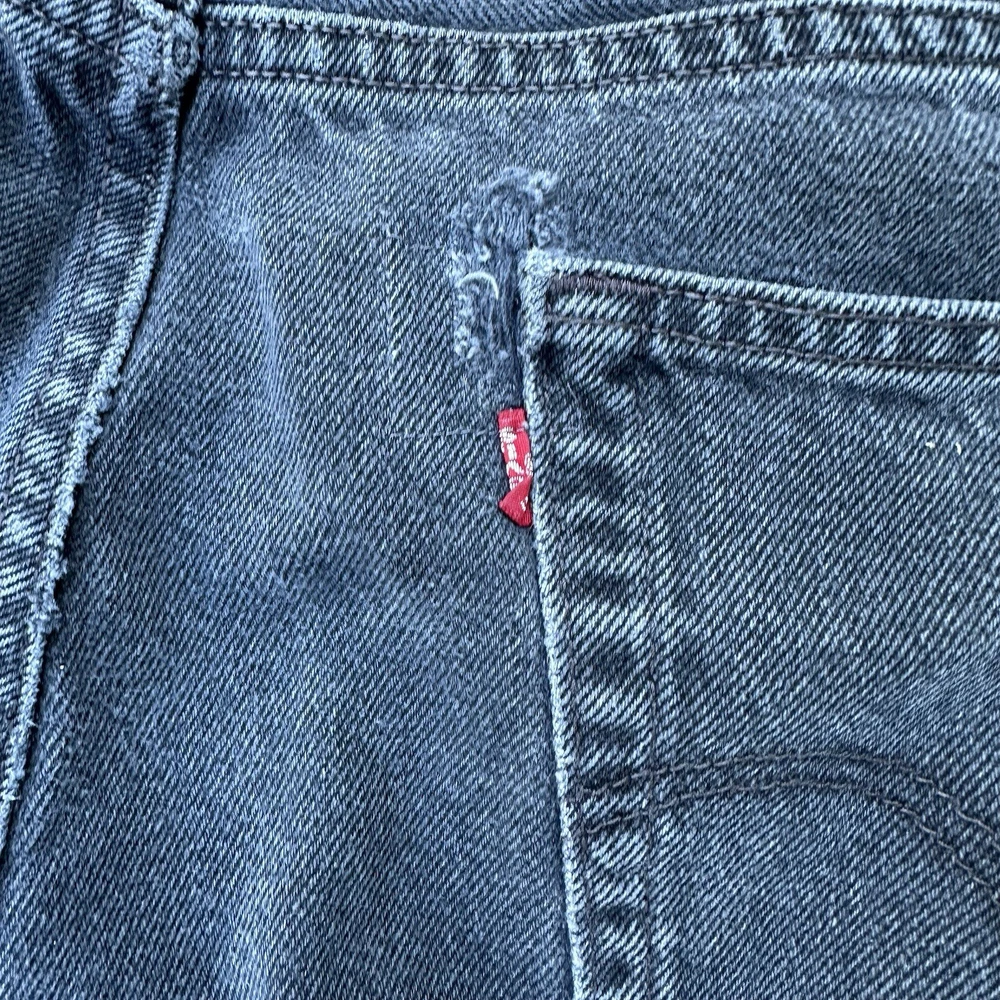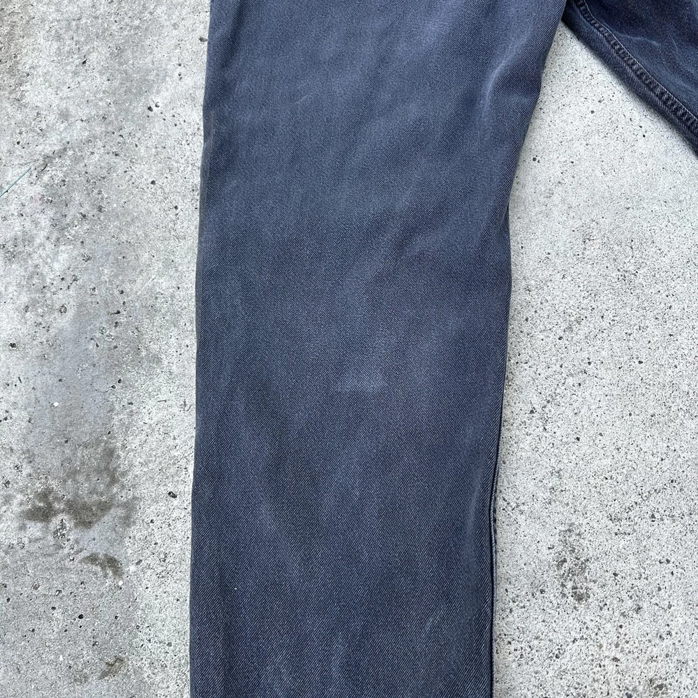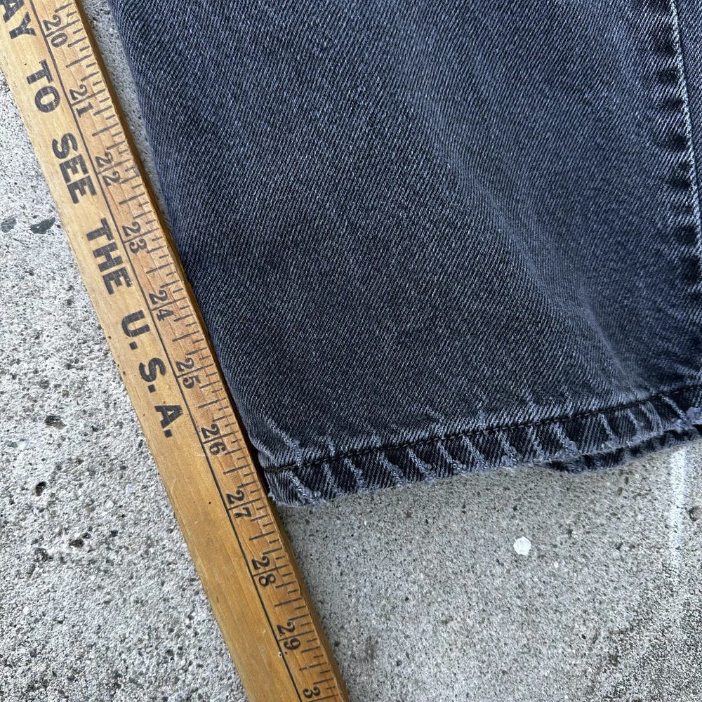 Levi's 550 Jeans for men in black, size 40x30, featuring a relaxed straight fit. Made of medium wash denim with a high rise and a zipper/button closure. The fabric is cotton denim, and the brand is Levi's. The style is part of the Levi's 500 Series, specifically model Levi's 550, and the country of manufacture is Lesotho. These pants have 3 patches for repairs. Nice fade and super comfortable and broken in.