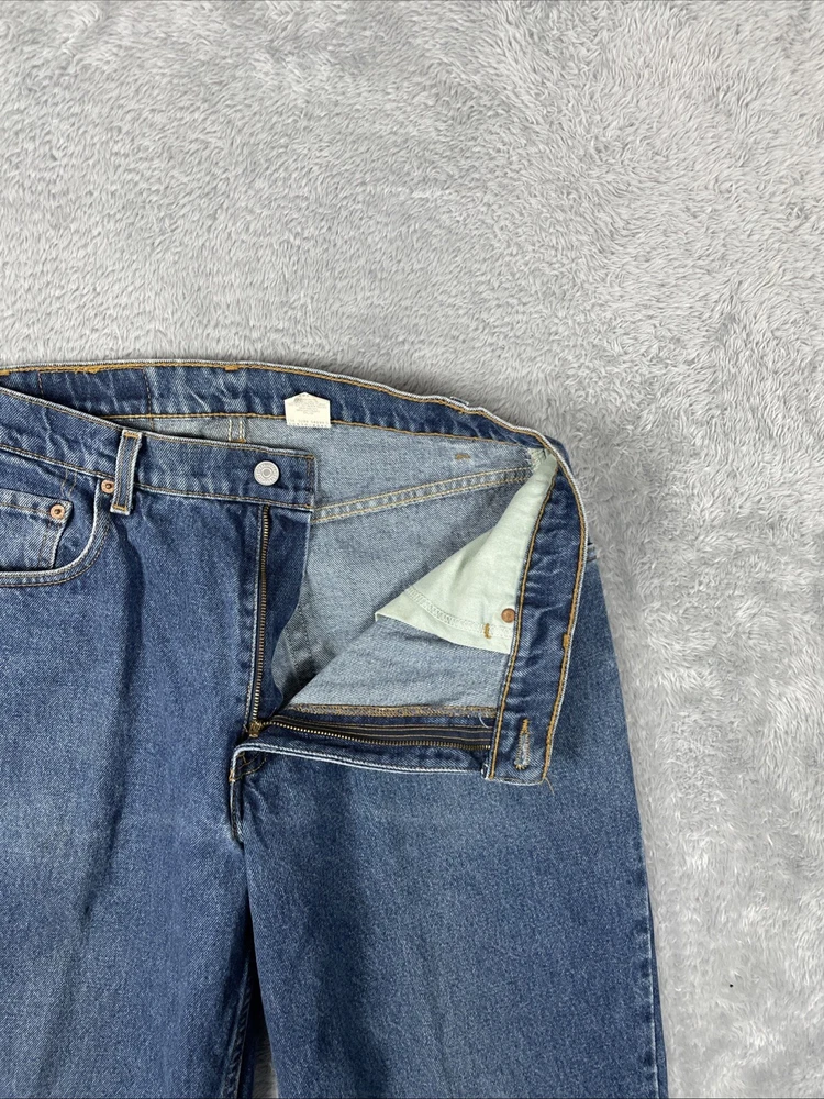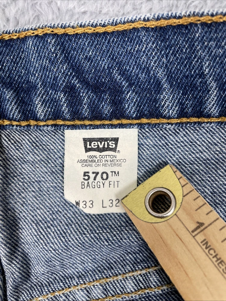 Levis 570 Jeans Men's 33x32 Blue Vtg. Baggy Fit 100% Cotton Pants Mexico Made Tag size is - 33 x 32 *ACTUAL measures are* - ~33 x 31.5 See photos for actual measurements. Condition is used: Acceptalbe used condition with stains on the thighs, a worn spot on the back pocket, and some loose decorative stitching on the back pocket Please look carefully at all photos. The photos are an important part of the description. If you have questions, please ask. Returns are accepted within 30 days of purchase. The item must be returned in exactly the same condition as received. Items will be inspected, serial numbers checked, etc. Shipping fees are not refundable.
