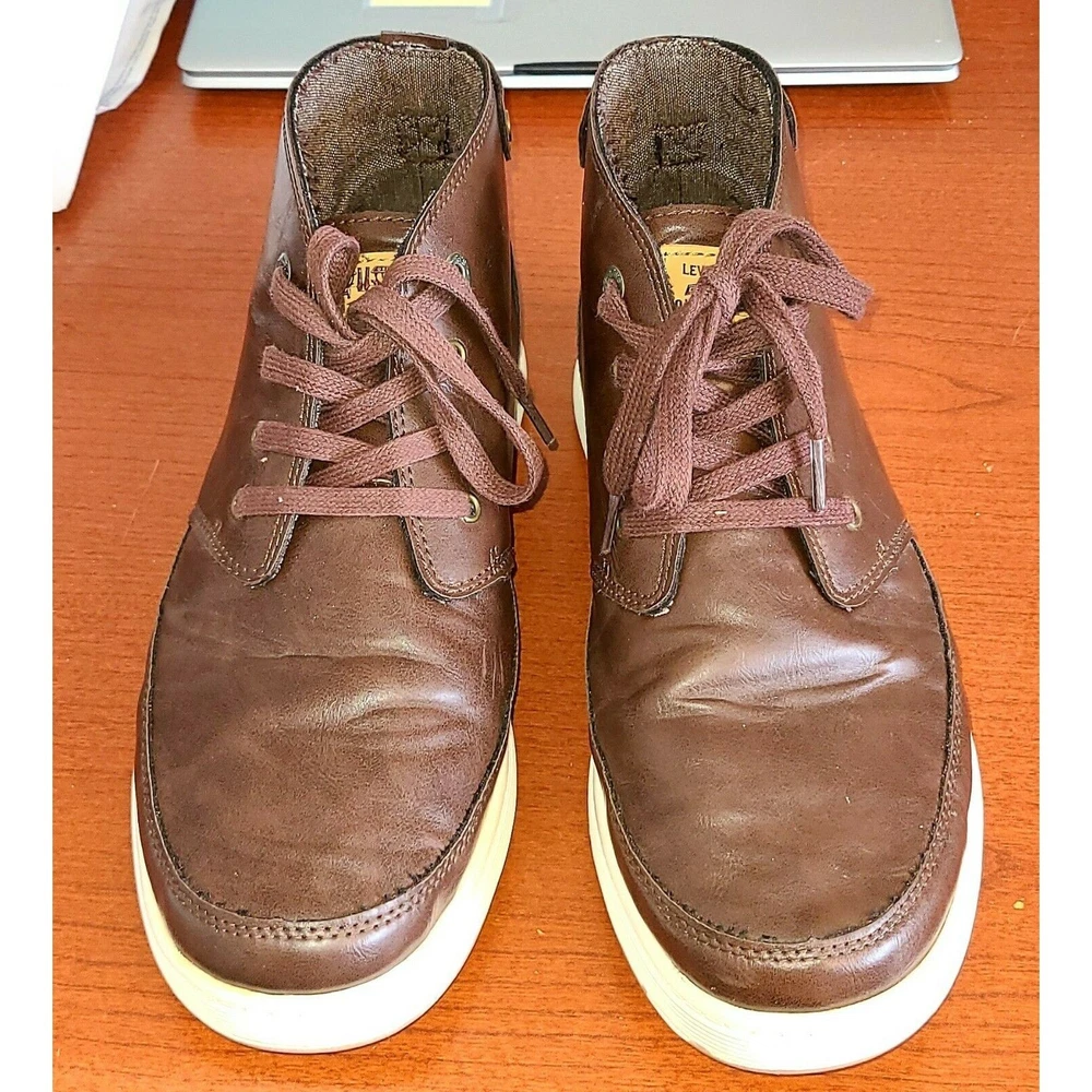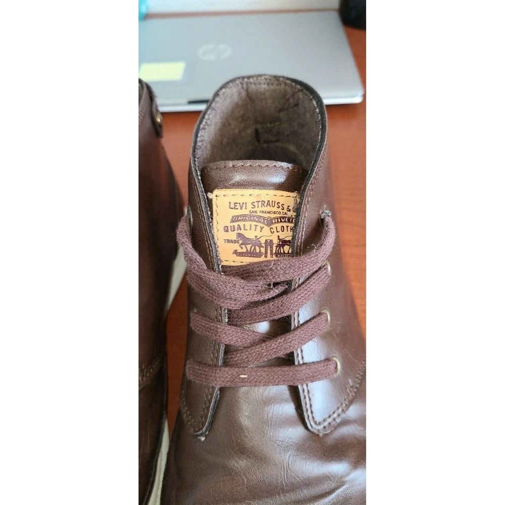 The Levi's Atwater Waxed shoe is a rare collector's item with an upside-down label. It is a casual chukka-style shoe for men with a round toe shape and lace-up closure. The shoe is made of leather and comes in brown color. It has a UK shoe size of 8.5, US shoe size of 9.5, and EU shoe size of 43. The shoe is of medium width (M) and is branded by Levi's.