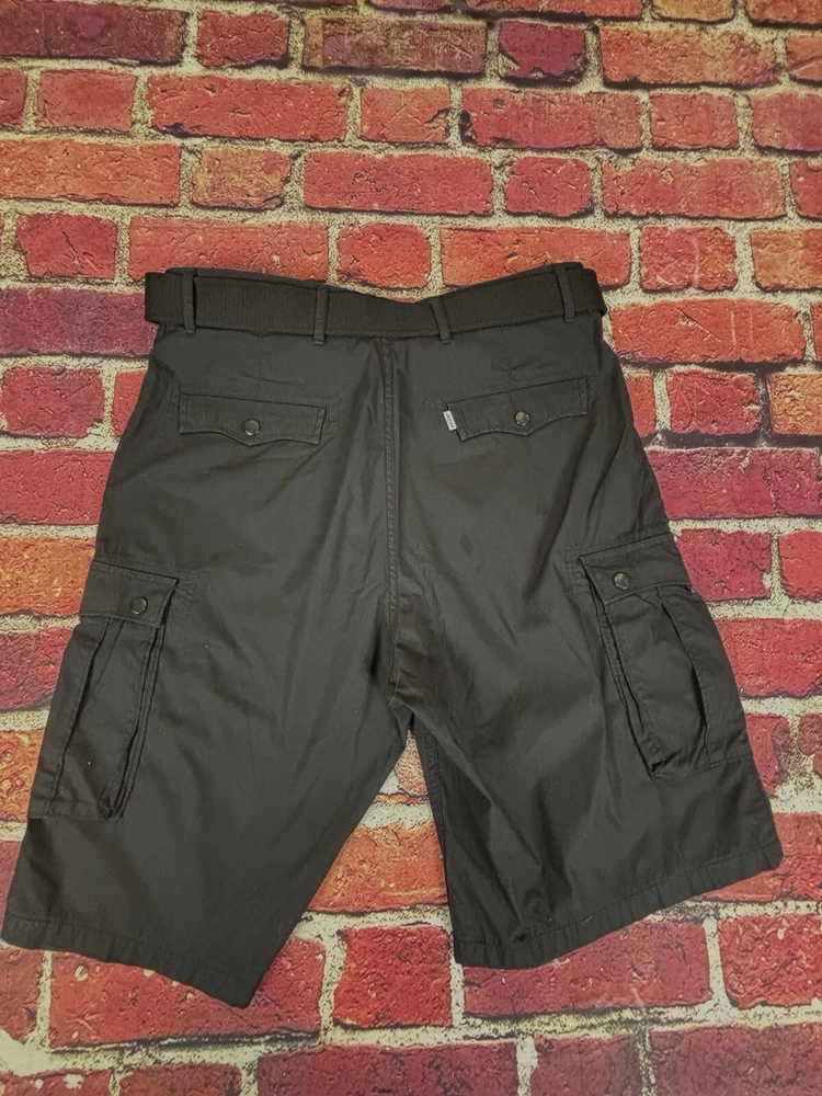 Levi's White Cargo Chino Shorts in size 34 with a canvas belt feature a relaxed fit, flat front, and cargo pocket. Made of cotton twill fabric, these shorts have a 11-inch inseam and a high rise waist. They are designed for various occasions including travel, casual wear, work, and business. The shorts also include a logo accent and are machine washable, making them suitable for summer, fall, and spring.