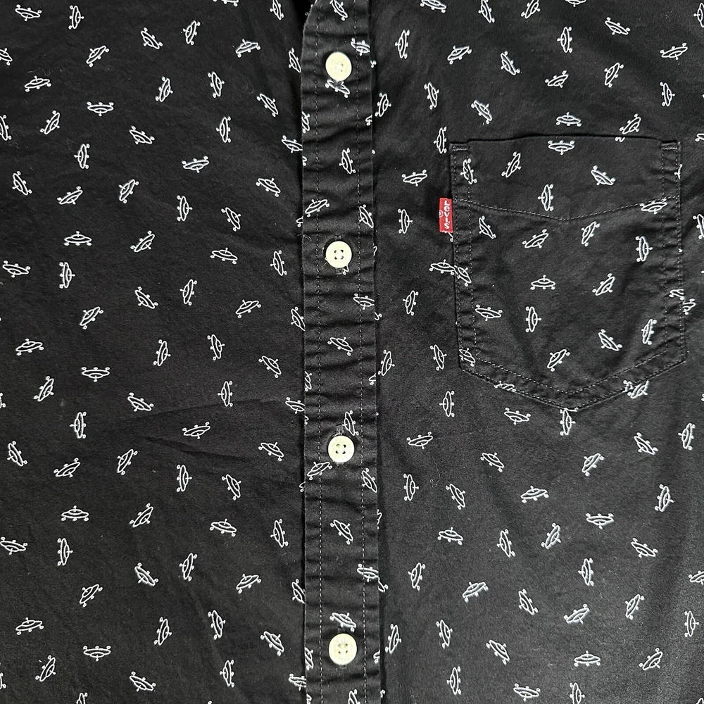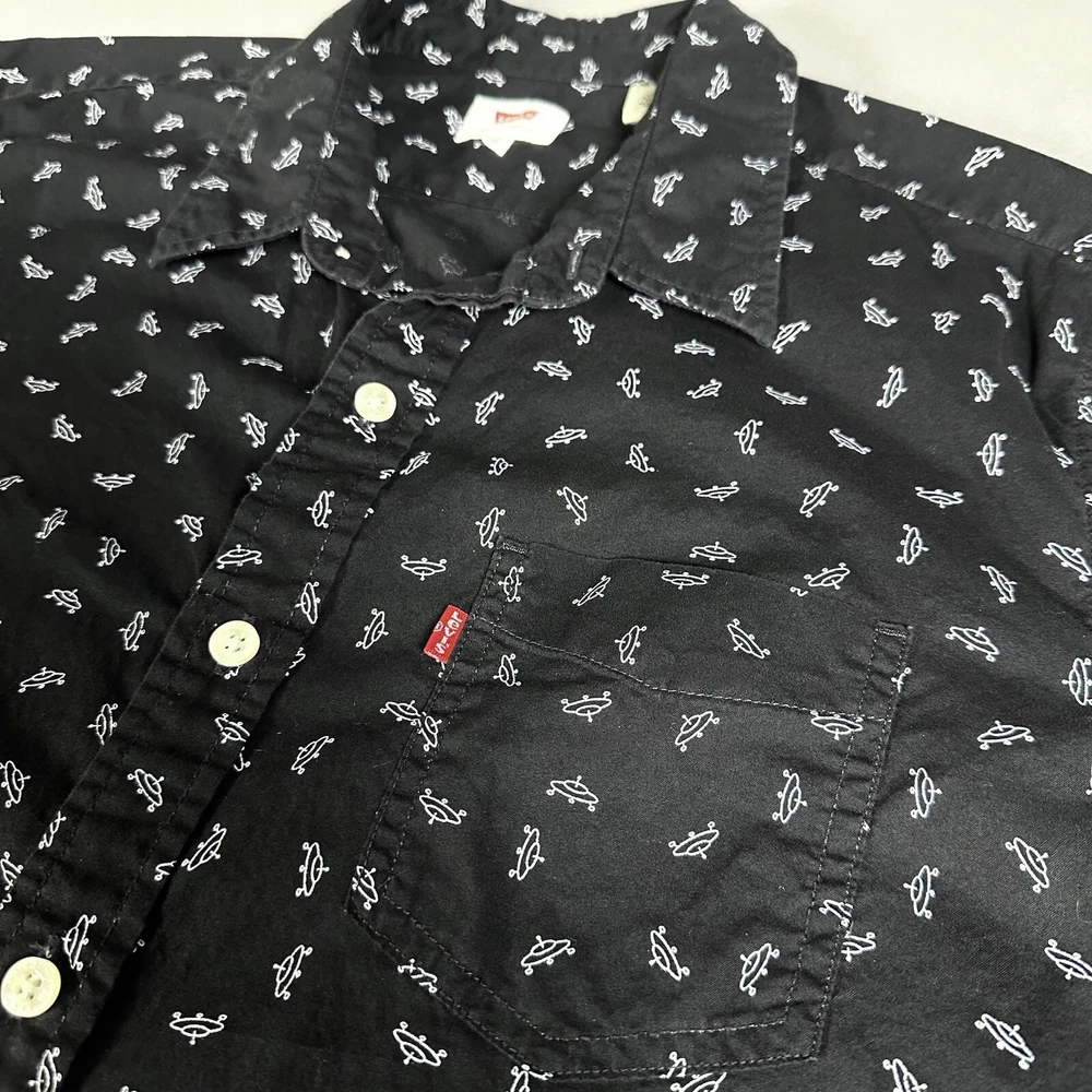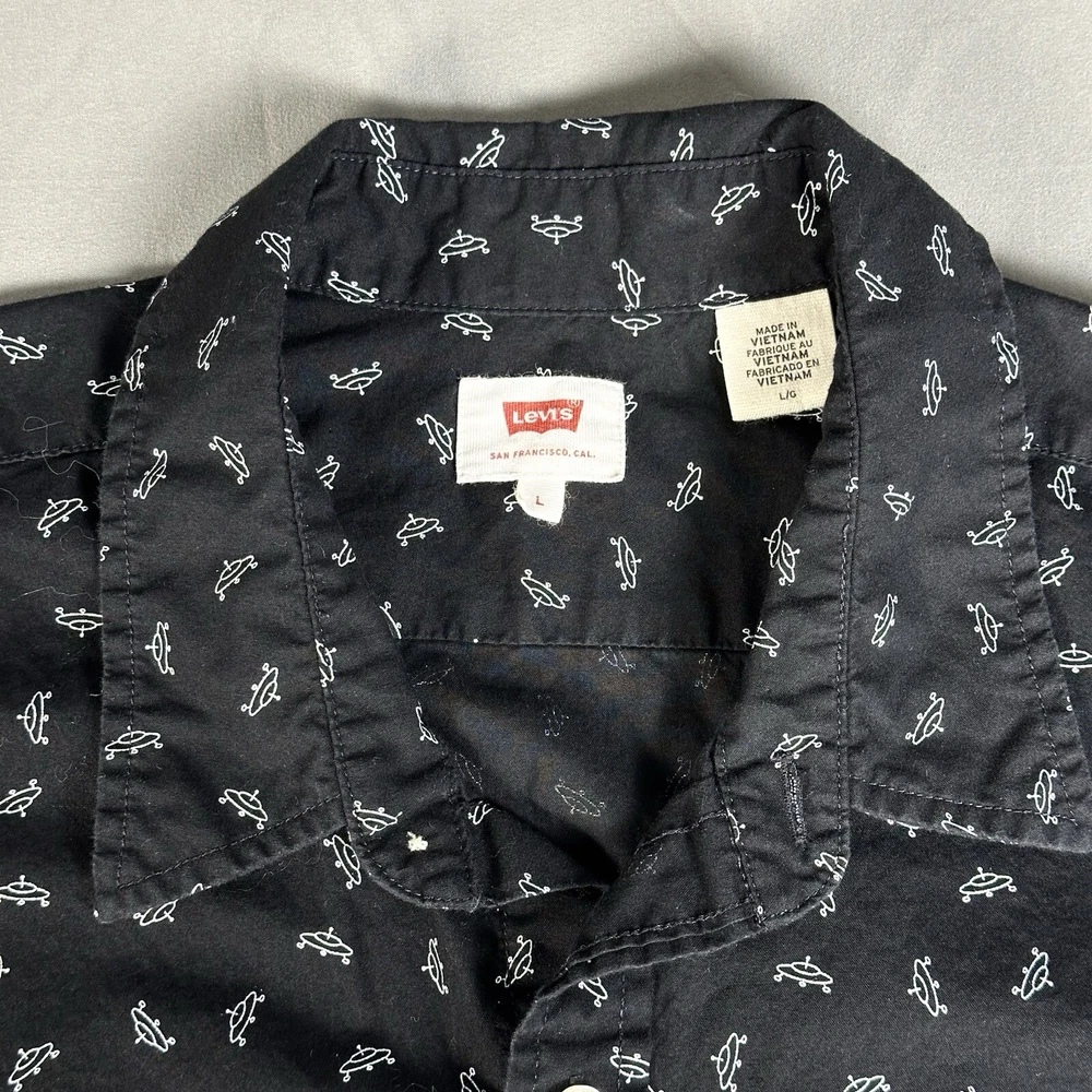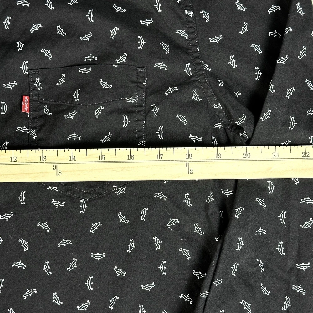 Featuring a graphic print of white flying saucers, this black button-up shirt is perfect for any casual occasion. Made of lightweight cotton fabric, it is machine washable and suitable for all seasons. Lay-Flat Measurements Length: 28” Chest: 20” Sleeve: 24” Shipping: All items are packed with care. I do use recycled packing and shipping materials whenever possible. If you have any issues with your purchase, please reach out as soon as possible. Clothing and accessories have a 30-day return window, returned in the same condition sent, with original tags and labels as applicable. Return shipping paid by buyer. Thank you for your business and let me know if you have any questions!