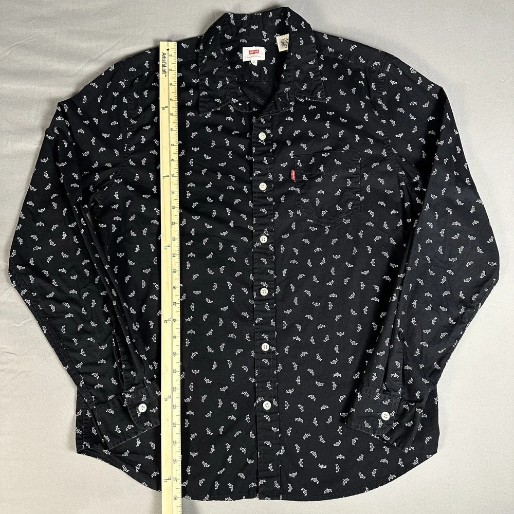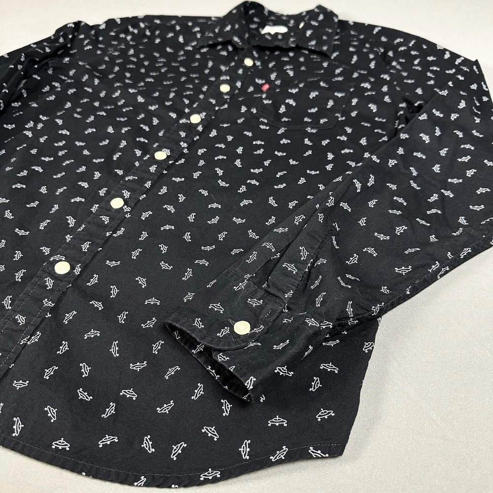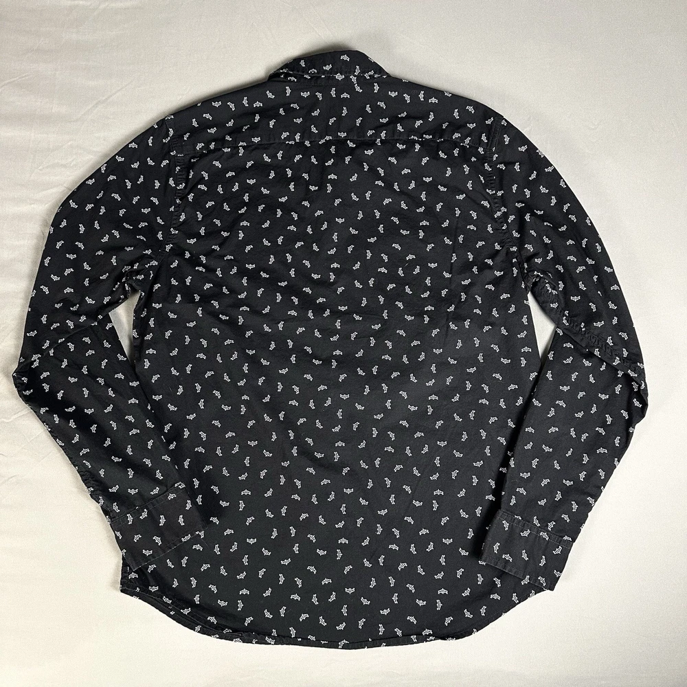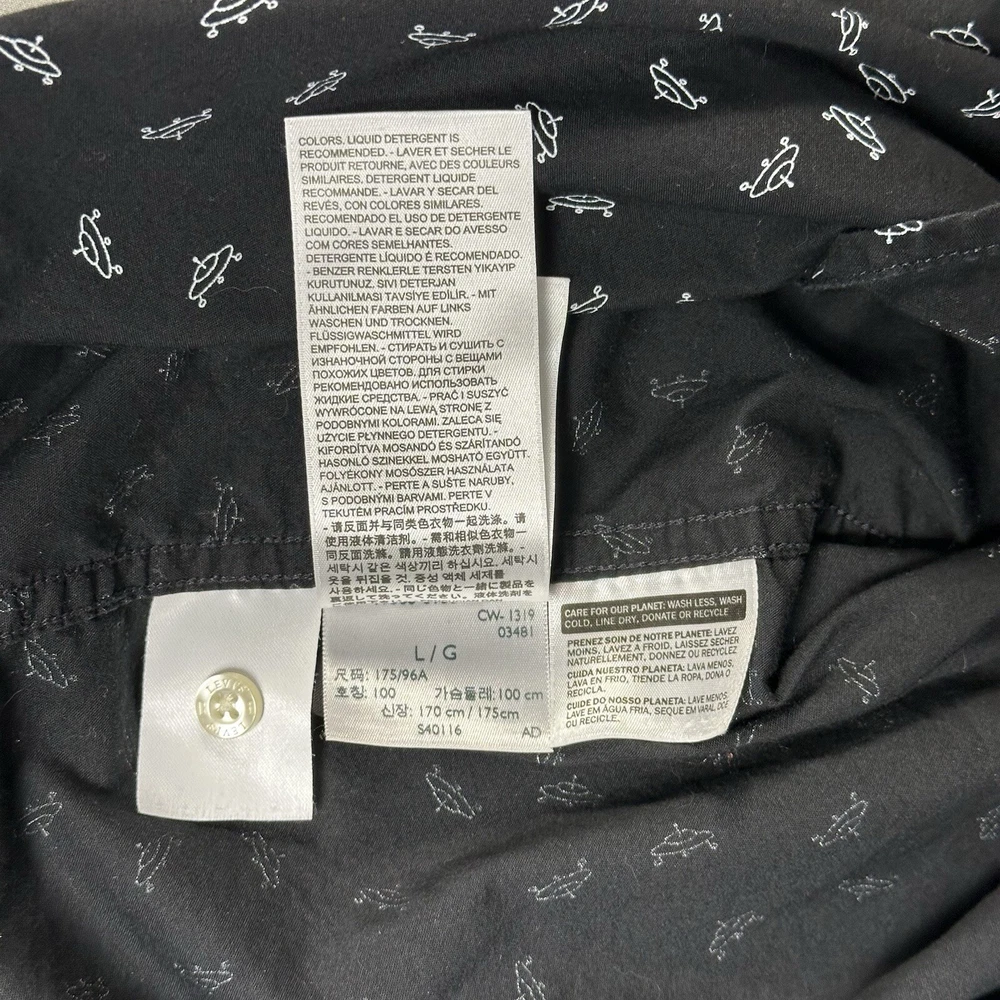 Featuring a graphic print of white flying saucers, this black button-up shirt is perfect for any casual occasion. Made of lightweight cotton fabric, it is machine washable and suitable for all seasons. Lay-Flat Measurements Length: 28” Chest: 20” Sleeve: 24” Shipping: All items are packed with care. I do use recycled packing and shipping materials whenever possible. If you have any issues with your purchase, please reach out as soon as possible. Clothing and accessories have a 30-day return window, returned in the same condition sent, with original tags and labels as applicable. Return shipping paid by buyer. Thank you for your business and let me know if you have any questions!