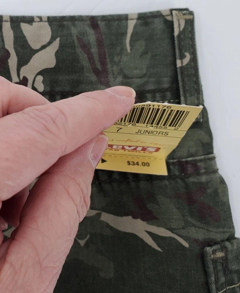 Levi's Camo Tab Twills Denim Skirt Junior's Size 7 Brand New Cute. It has front pockets with ties, with an all over camo print and it's made of 55% ramie and 45% cotton. Please check measurements to ensure fit. The waist measurement is 31 inches and the length from the top to the bottom in the front is 13 inches. The tag on the back is disconnected at the top, but still attached at the bottom see the picture.