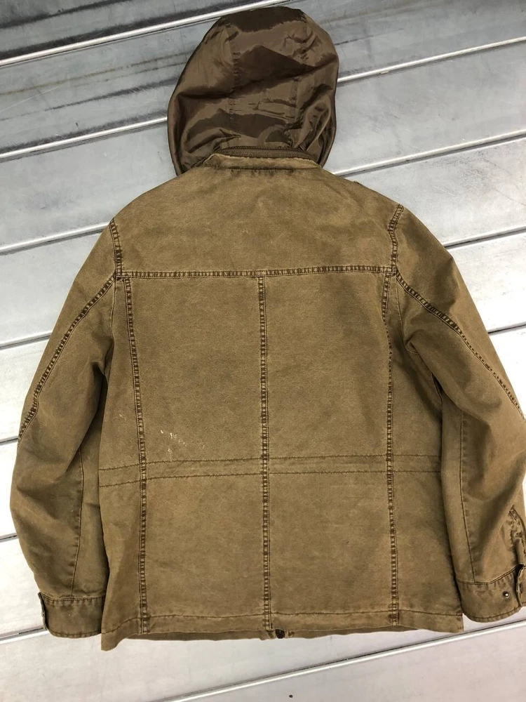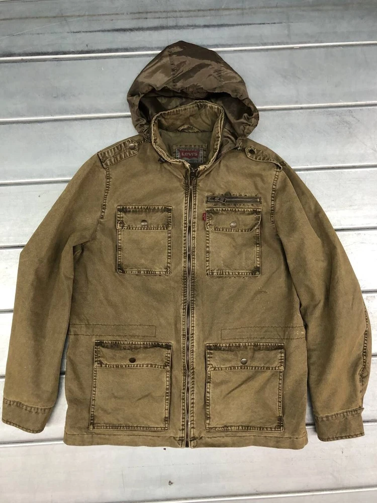 Levis Denim Utility Jacket Mens Medium Green Hooded Full Zip Very good condition, some marks one the jacket show in photo, please see pic for details and measurements T3