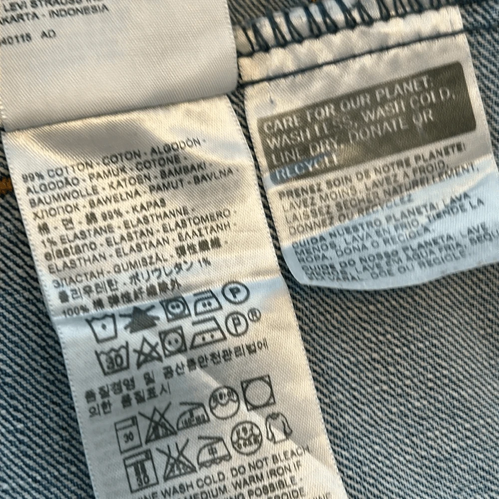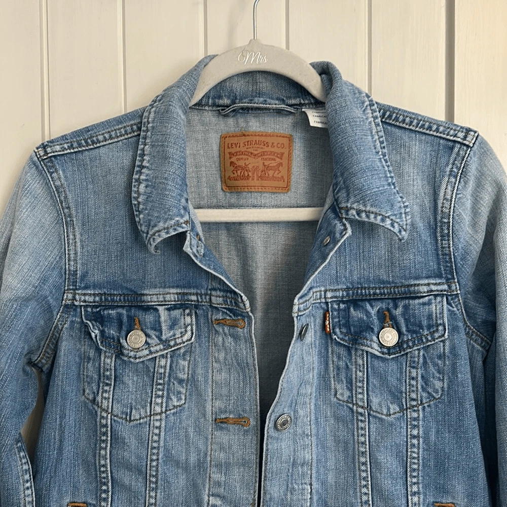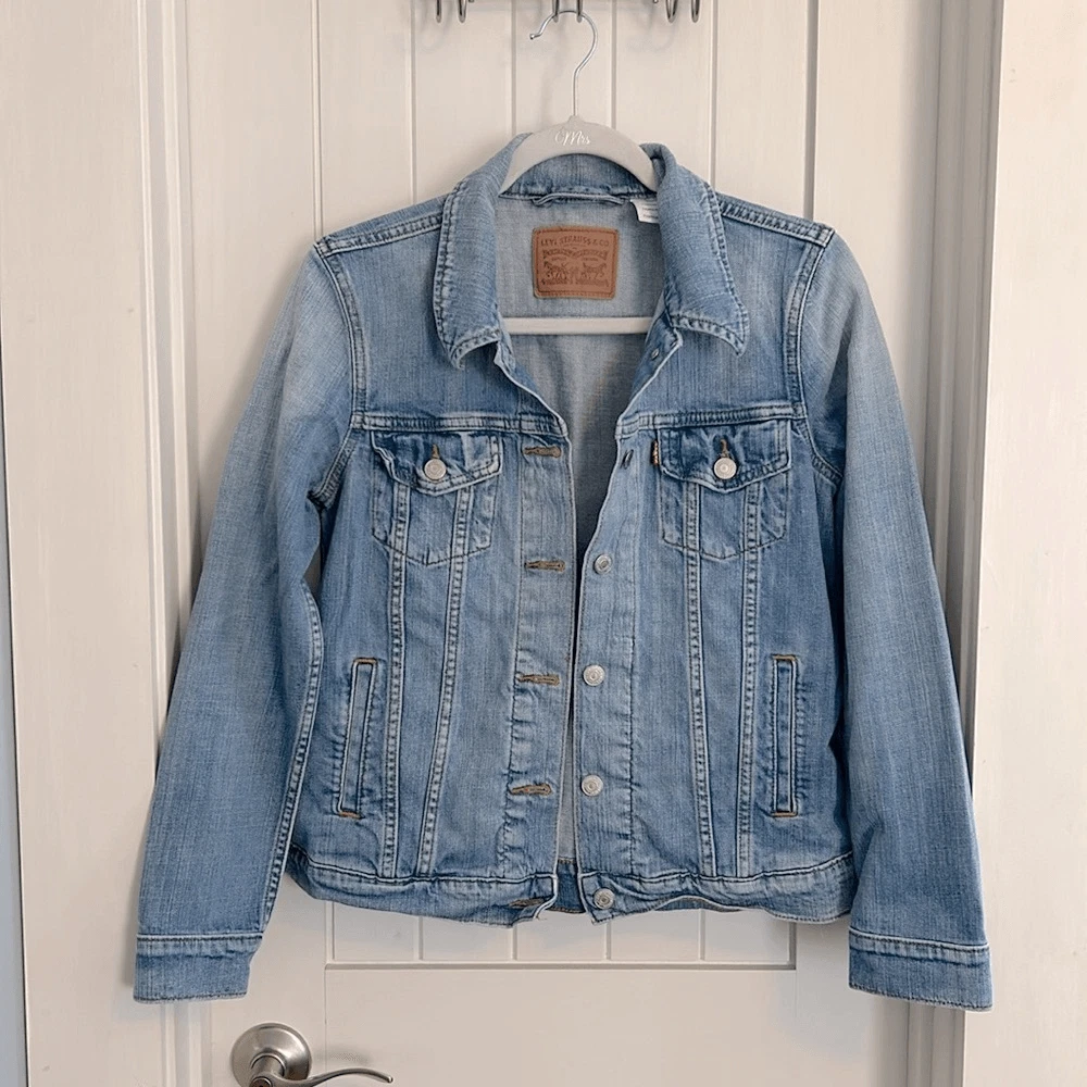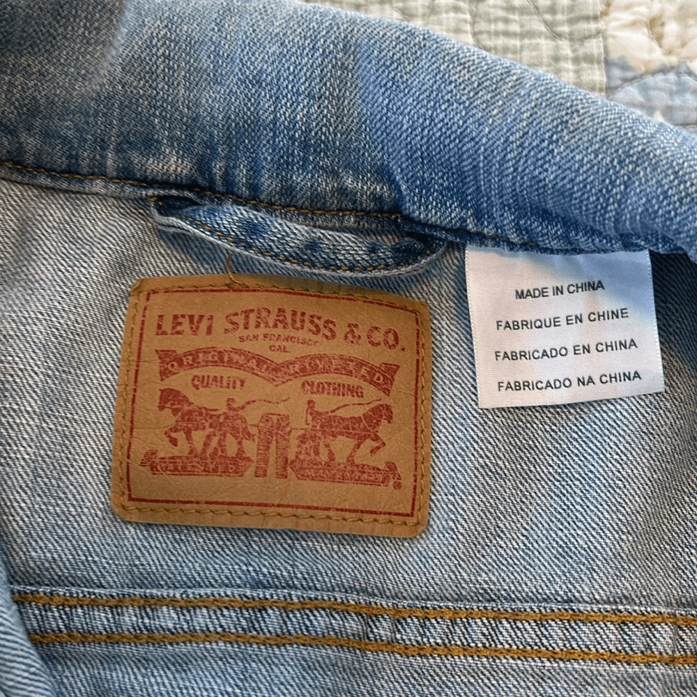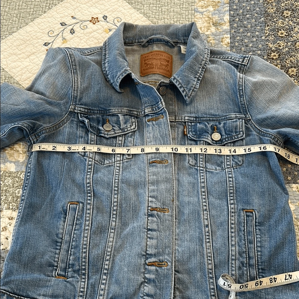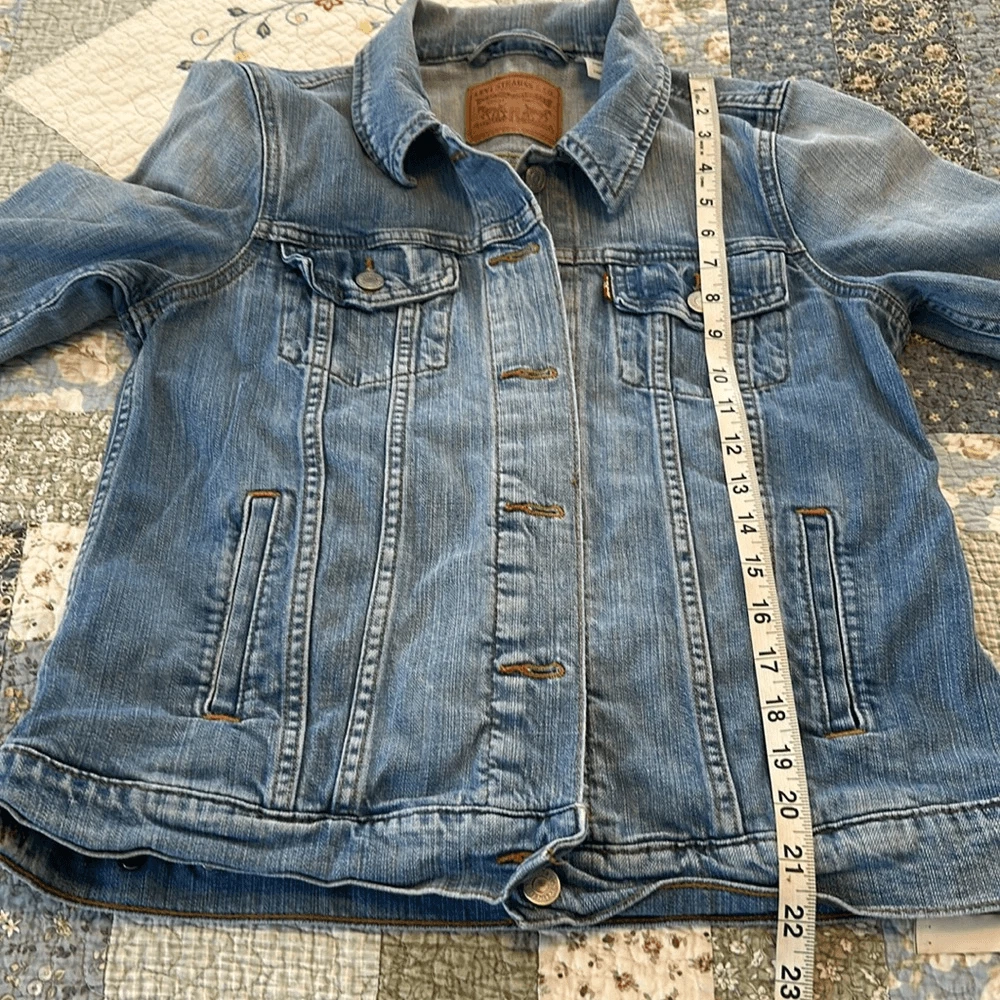 Levi’s Distressed Denim Jean Trucker Jacker Size Medium Measurements in photos Cotton Elastane Excellent condition