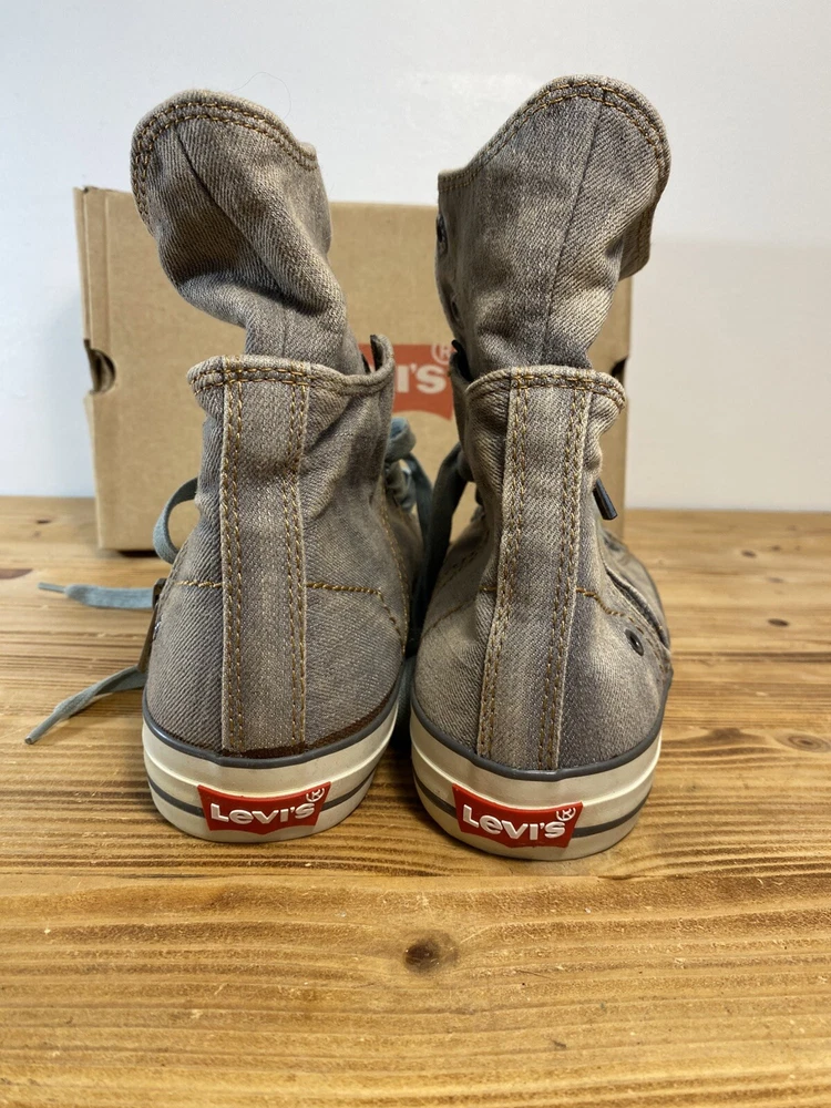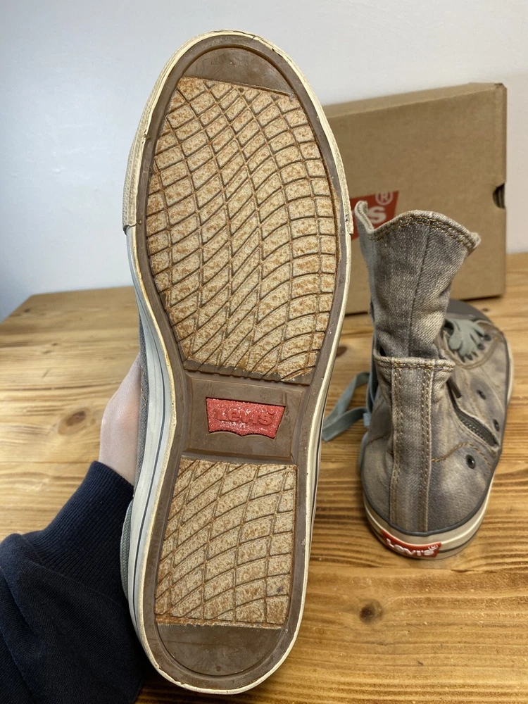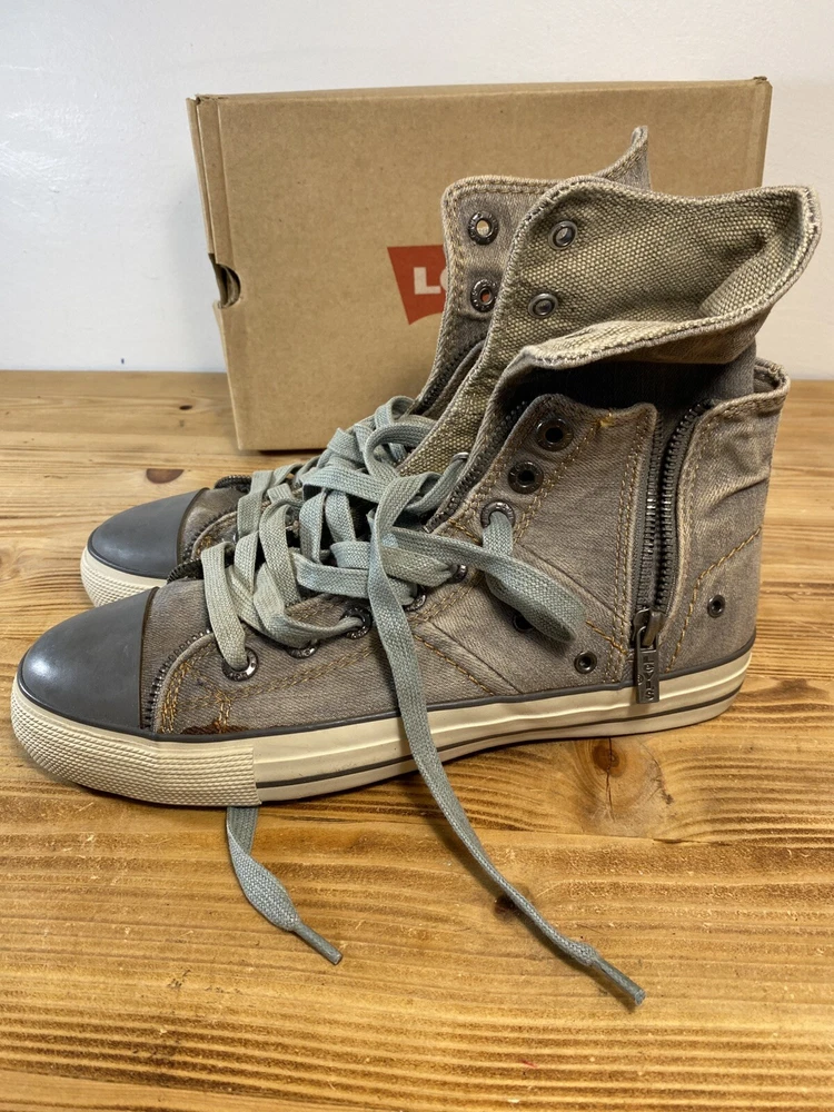 on top of the left shoe there is a small mark. Possibly a glue mark when they were fitting the soul.?? Elevate your sneaker game with these Levi’s High Top Sneakers. These stylish shoes feature a solid pattern and a round toe shape that is perfect for any casual or activewear occasion. The zip closure and double layer fold-down design add a touch of punk and rock style to your outfit, making them perfect for those who want to make a statement. The sneakers are made with a durable canvas upper and lining material, making them breathable and cushioned for all-day wear. The rubber outsole provides comfort and support, while the standard shoe width and adjustable features make them suitable for any foot size. With a retro and grunge music-inspired theme, these sneakers are perfect for those who want to add a touch of the 80s and 90s to their wardrobe.
