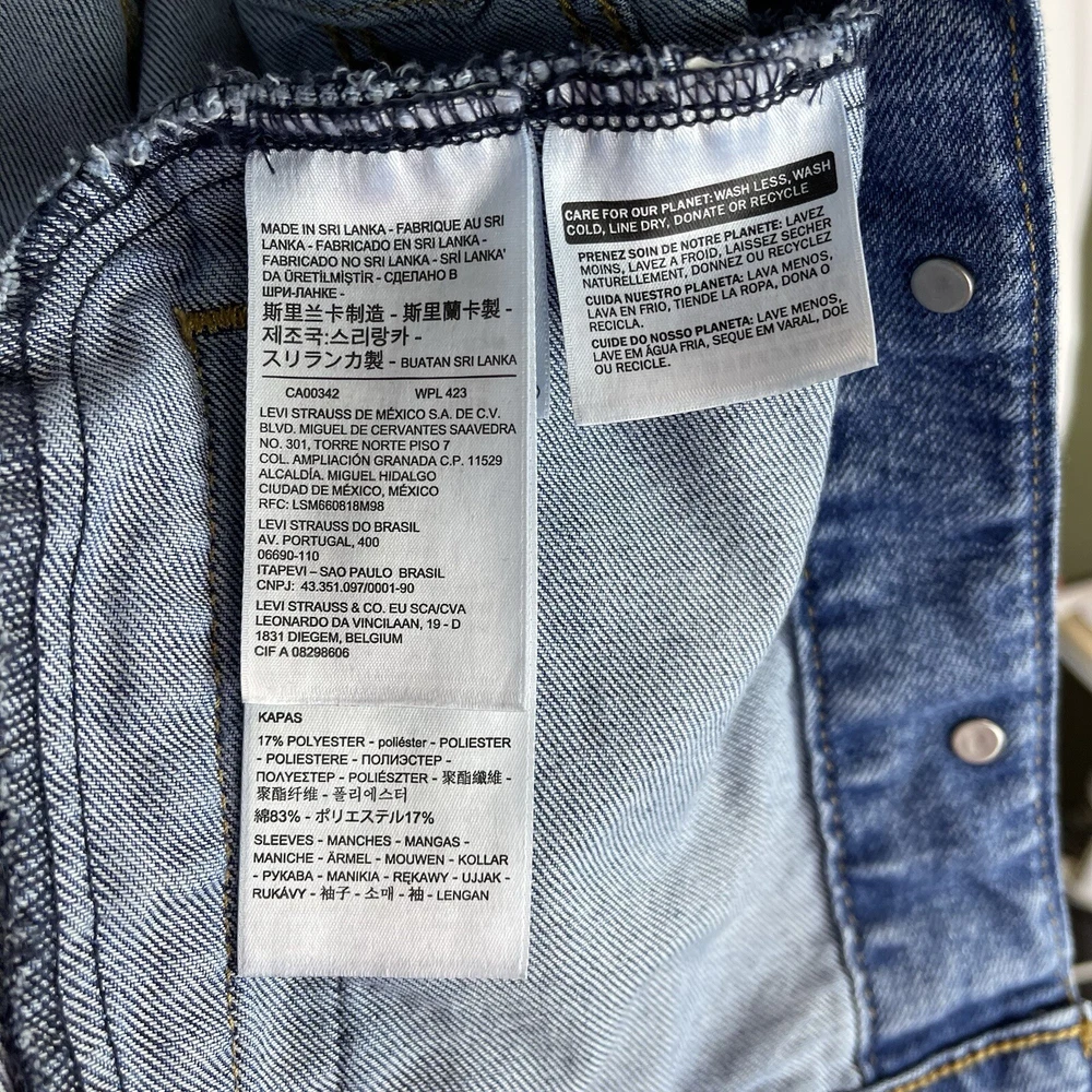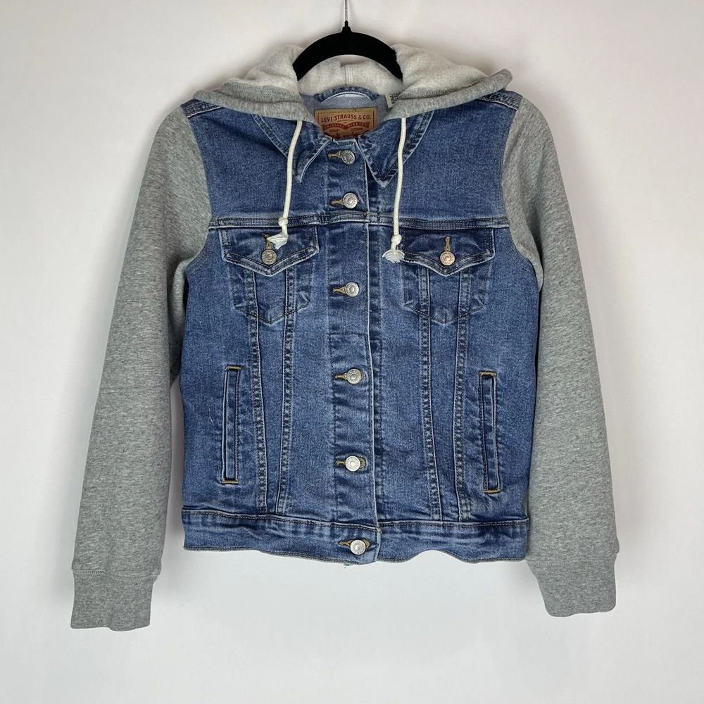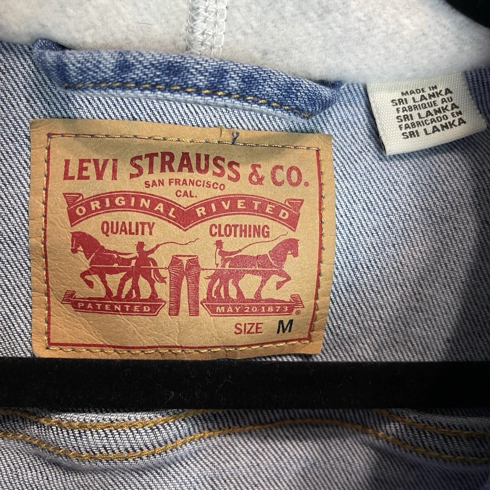 This Levi's Trucker Jacket is a must-have for any fashion-forward woman. The jacket is made of high-quality cotton denim and features a button closure with a hood and pockets. The jacket comes in a medium size and has a solid blue color with accents of buttons and logos. The jacket is perfect for any occasion, whether it's for travel or casual wear. It has a retro and classic style that is suitable for any theme, including cars, biker, motorcycle, American, grunge, cowboy, and preppy. The jacket is machine washable and easy to maintain. Get this Levi's Trucker Jacket today and add a touch of style to your wardrobe! This jacket looks to run small. Please see measurements to help with the fit. Measurements: Pit to Pit: 17 inches Length of Jacket: 21 Inches Size: M - but looks to run small Washed and Dried for you!
