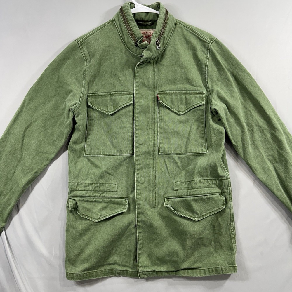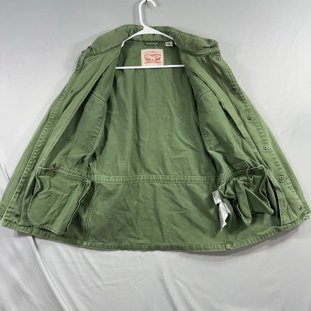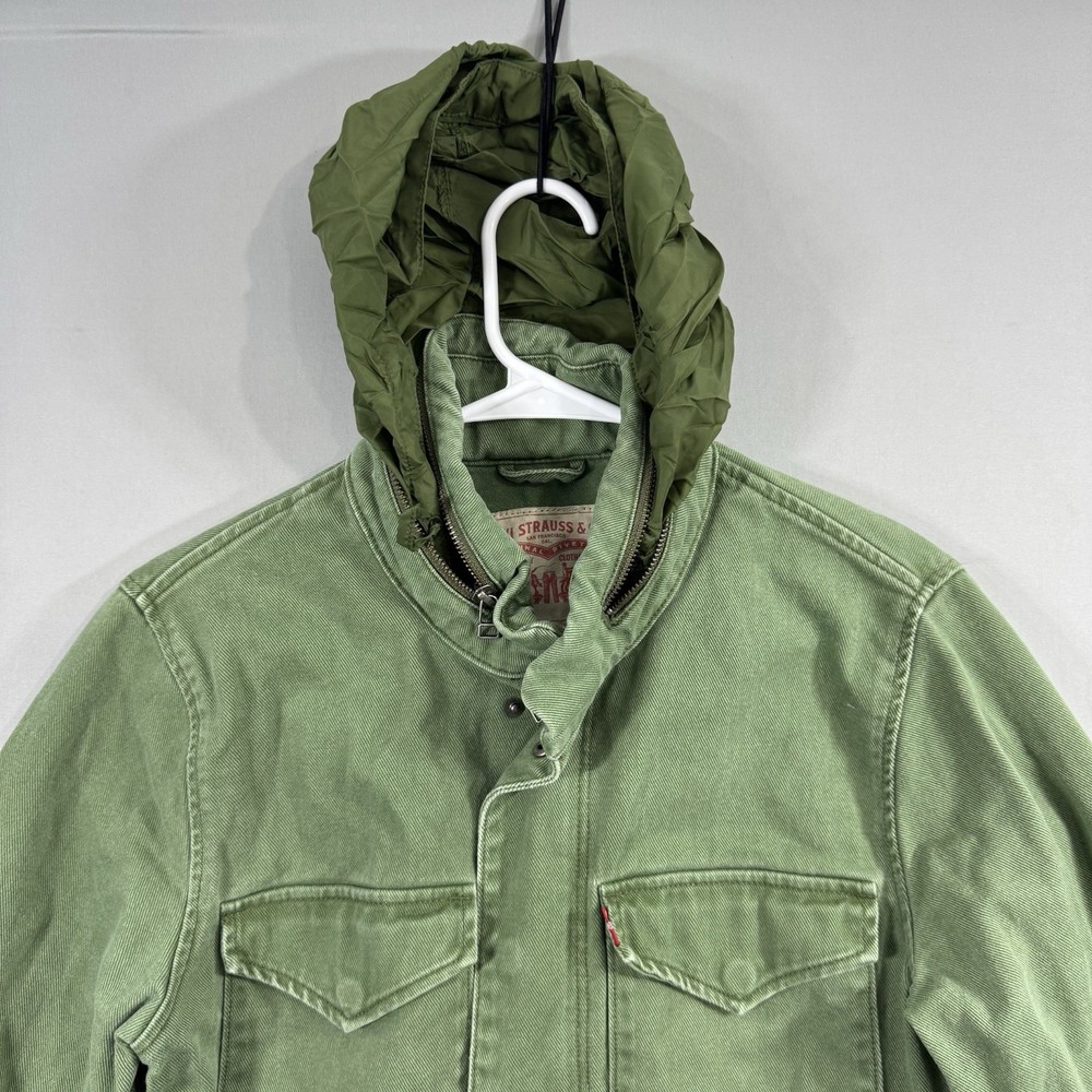 Crafted for durability and comfort, this Levi's men's chore coat is an ideal addition to your outdoor wardrobe. The sturdy cotton canvas construction ensures longevity, while the solid green color offers versatility. Designed with practicality in mind, it features a hood, multiple pockets for essentials, and a secure snap, button, and zip closure to guard against the elements. The jacket's long length, stand-up collar, and regular fit cater to a classic military jacket silhouette, complemented by the distinctive Levi's logo accent. Whether you're walking, hiking, or engaging in any outdoor activity, this jacket provides a blend of functionality and style without compromising on comfort. It's a piece that effortlessly combines the robustness of army and biker themes with a touch of USA-inspired outdoor flair.