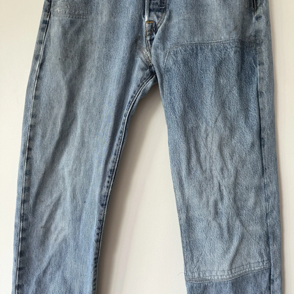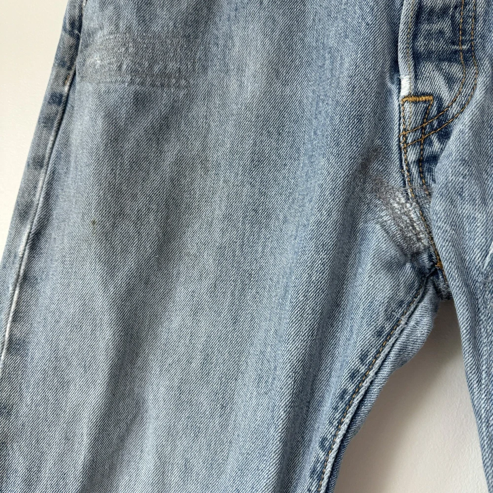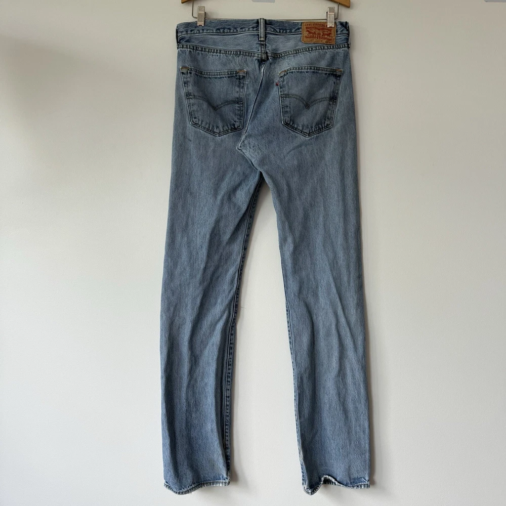 Elevate your style with these Levi's 501 Button Fly Jeans in a light blue wash. The classic, straight-leg style is complemented by accents of a button and Levi's logo. The denim fabric is easy to care for, stretchy for comfort, and even has reflective features for added safety. With 5-pocket design and a waist size of 32 inches, these jeans are perfect for men looking for a regular fit. The vintage-inspired jeans have a solid pattern and are machine washable for easy care. With a country of origin in Egypt, these Levi's 501s are a part of the USA, 80s, and 90s-themed product line. Perfect for any season, these handmade jeans have a rise of mid, inseam of 36 inches, and feature a classic, straight-leg style. Full measurements: Waist flat: 16" Hips flat: 20.5" Front rise: 10.5" Thigh flat: 11" Inseam: 36" Leg opening flat: 7.5"