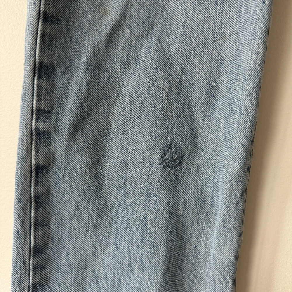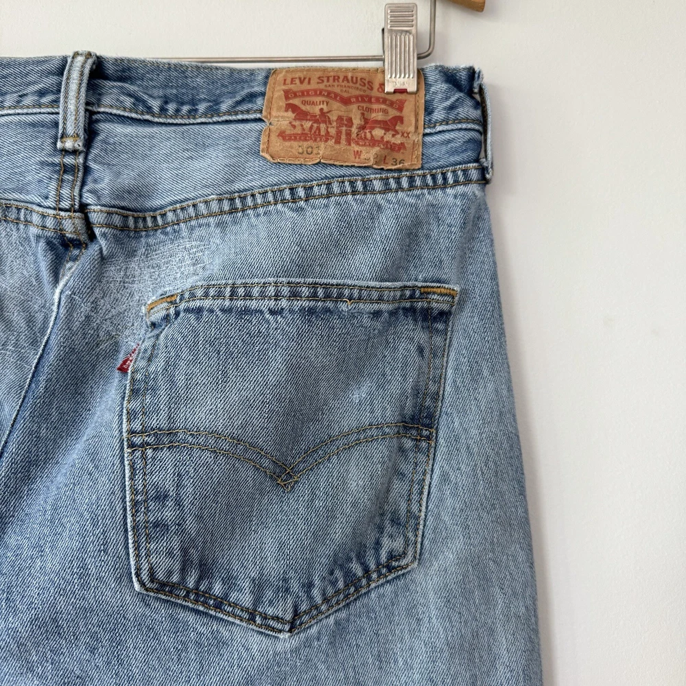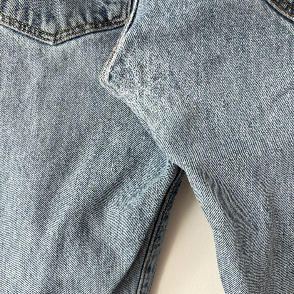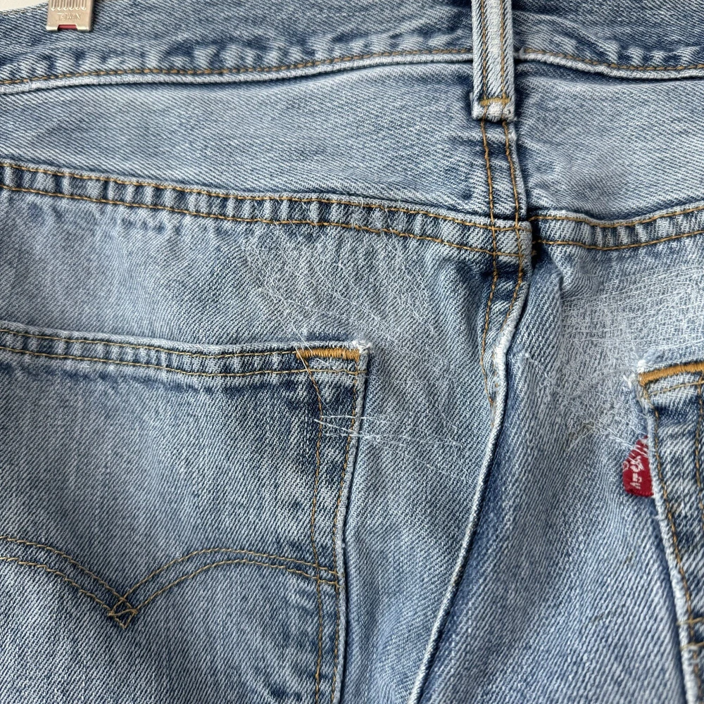 Elevate your style with these Levi's 501 Button Fly Jeans in a light blue wash. The classic, straight-leg style is complemented by accents of a button and Levi's logo. The denim fabric is easy to care for, stretchy for comfort, and even has reflective features for added safety. With 5-pocket design and a waist size of 32 inches, these jeans are perfect for men looking for a regular fit. The vintage-inspired jeans have a solid pattern and are machine washable for easy care. With a country of origin in Egypt, these Levi's 501s are a part of the USA, 80s, and 90s-themed product line. Perfect for any season, these handmade jeans have a rise of mid, inseam of 36 inches, and feature a classic, straight-leg style. Full measurements: Waist flat: 16" Hips flat: 20.5" Front rise: 10.5" Thigh flat: 11" Inseam: 36" Leg opening flat: 7.5"