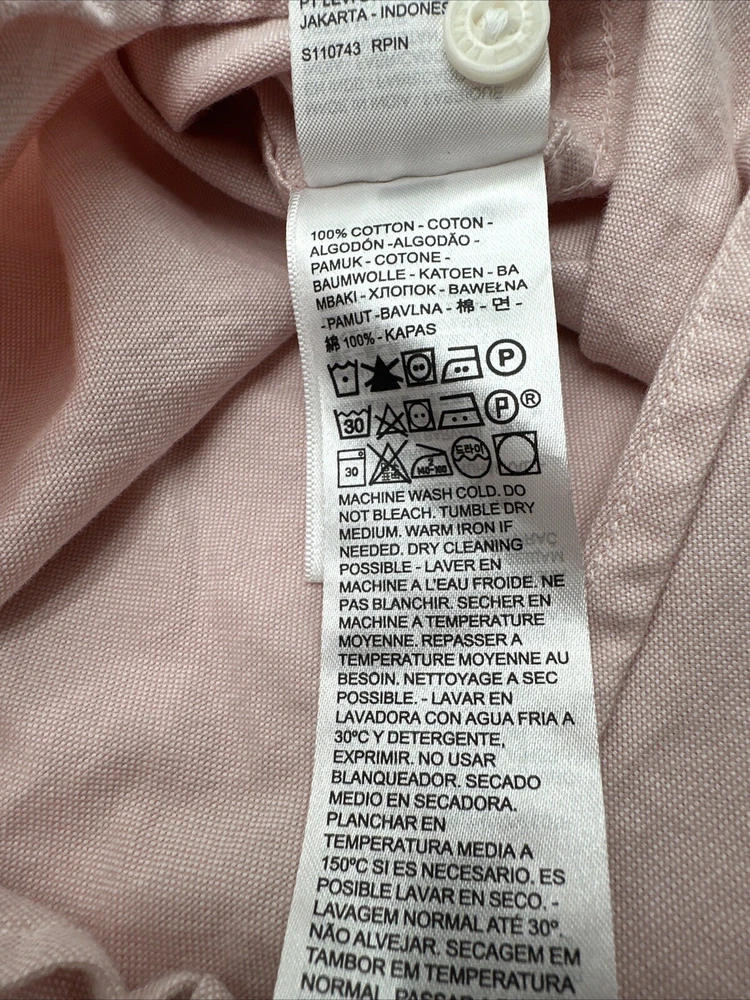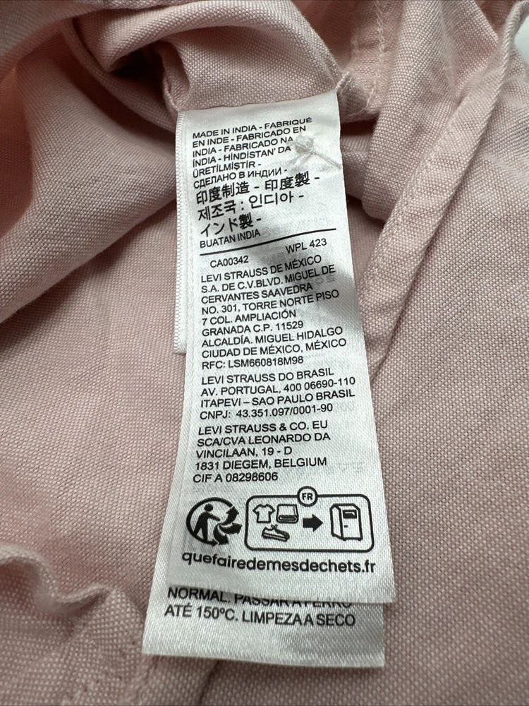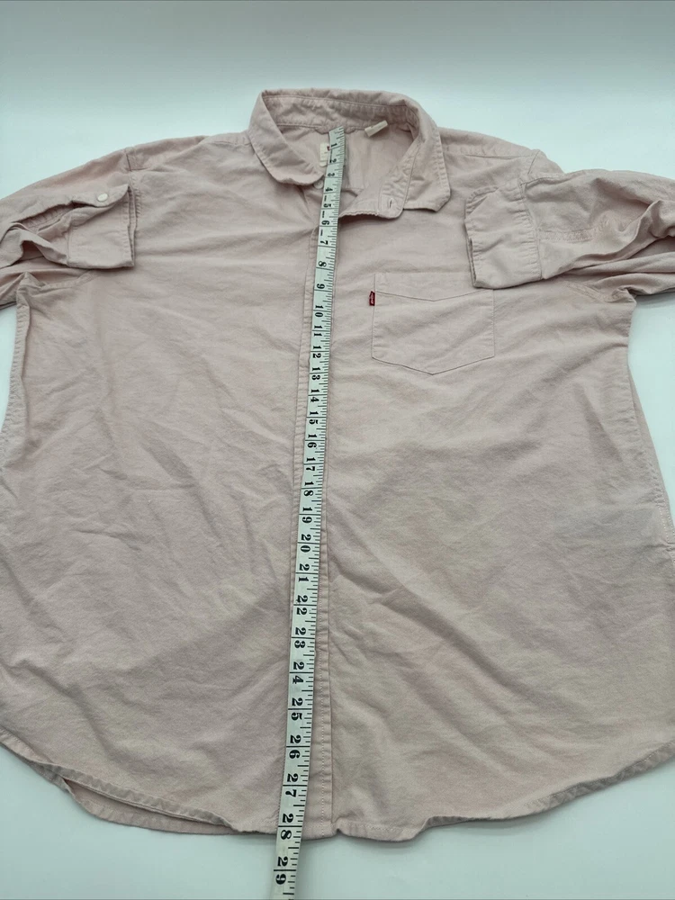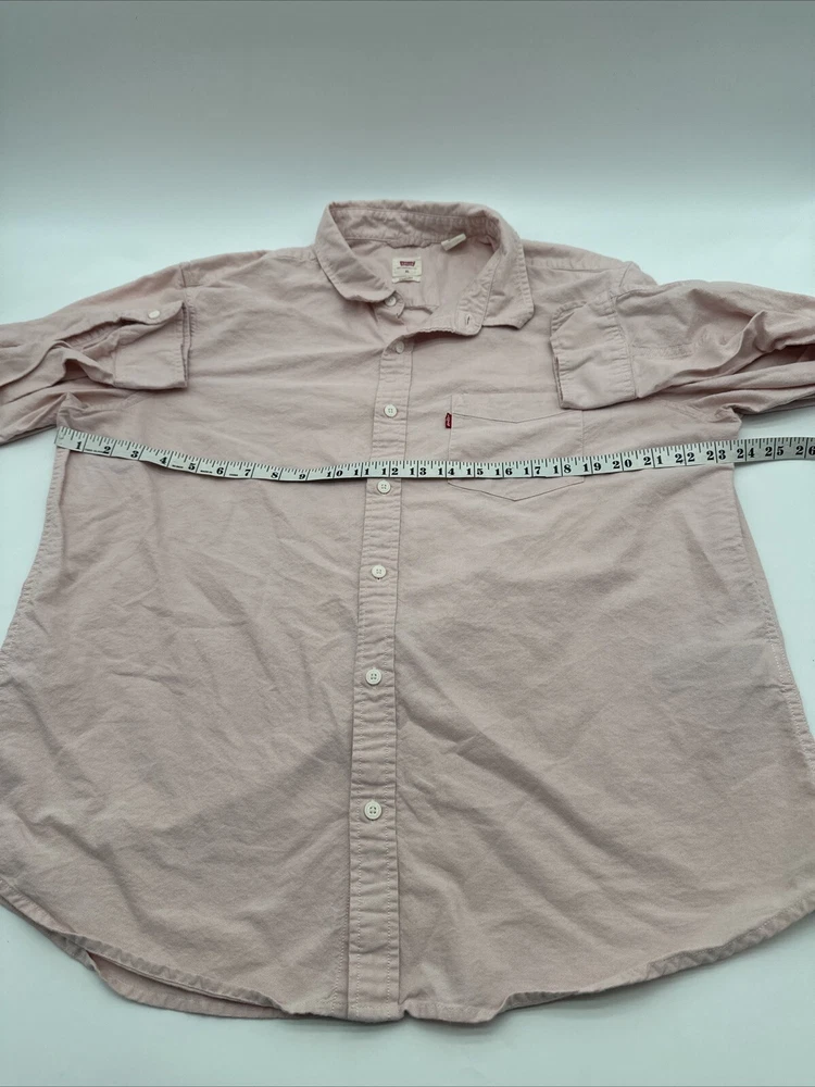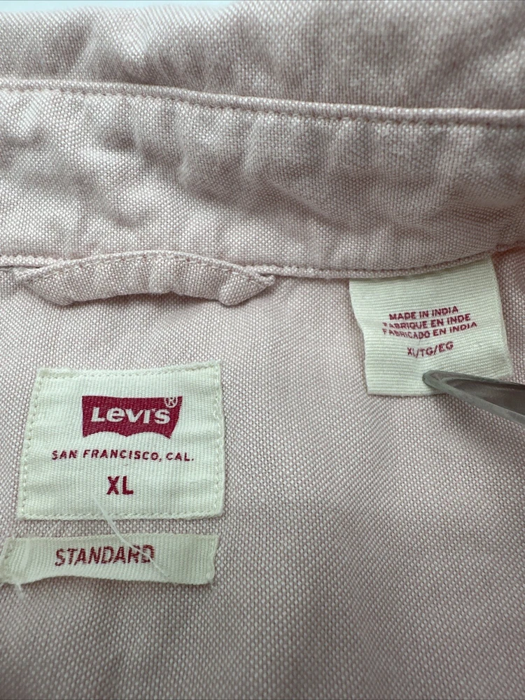This is a Levi's men's button-up shirt in size XL, featuring a solid pink color. It has long sleeves, a collared neckline, and a regular fit. Made of cotton in India, this classic shirt is easy to care for and has a button closure. *Check the images above for the flaws and measurements of the item.