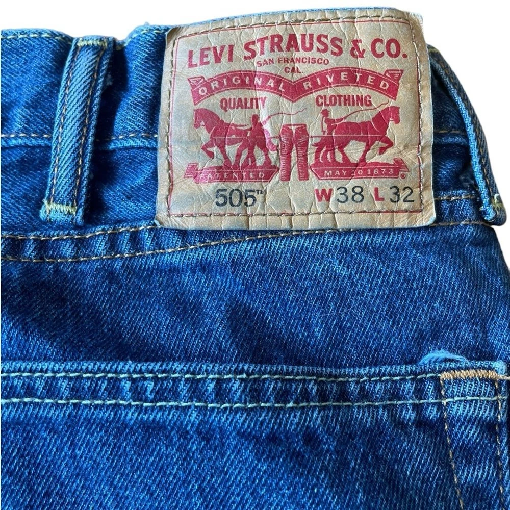 Levis Mens 505 Straight Leg Blue Jeans Size 38 Excellent condition No rips stains or thinning of material See photos for flat lay measurements. Inseam looks closer to 30 than 32