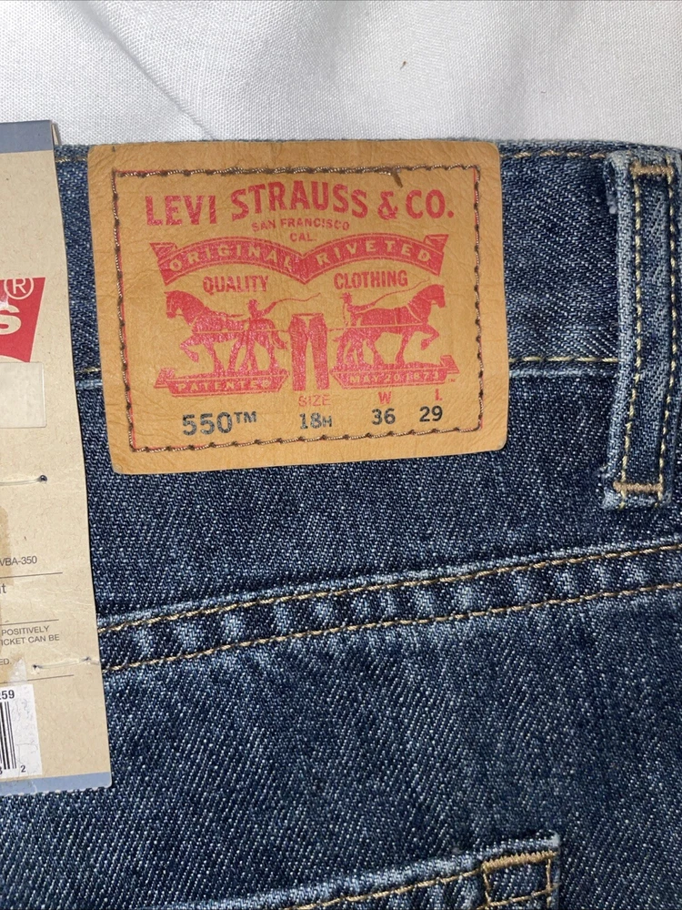 The Levi's Men's 550 Relaxed Fit Jeans in size 36 waist and 29 inseam are crafted from dark stonewash denim with a solid pattern. The jeans feature a zip closure, classic 5-pocket design, and a relaxed fit for comfortable wear. Made of cotton, this Levi's 550 model in a straight style is designed for a regular size type, ideal for men looking for a timeless and versatile addition to their wardrobe.