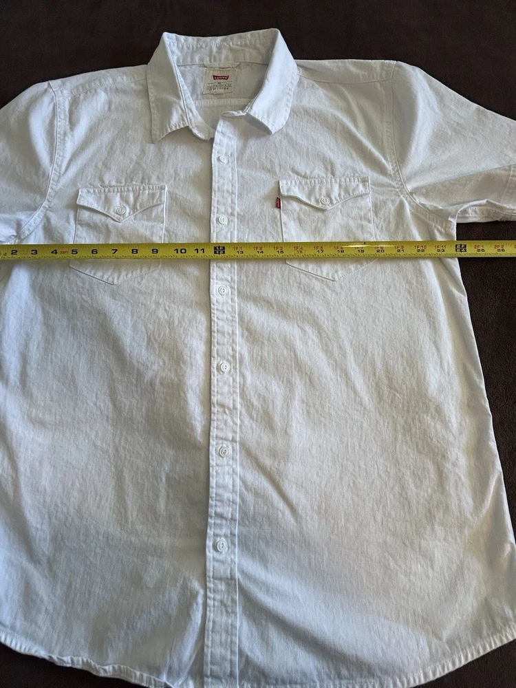 Elevate your wardrobe with this Levi's men's button-up shirt in a classic white color. Made with 100% cotton material, this shirt features a solid pattern, short sleeves, and a spread collar. The shirt is perfect for both casual and workwear occasions and is available in size 2XL. The shirt has a regular fit and is machine washable for easy maintenance. It also includes pockets and accents such as buttons and the Levi's logo. The shirt is suitable for various themes such as grunge, cowboy, classic, retro, and preppy. This Levi's button-up shirt is a must-have for any man's wardrobe.