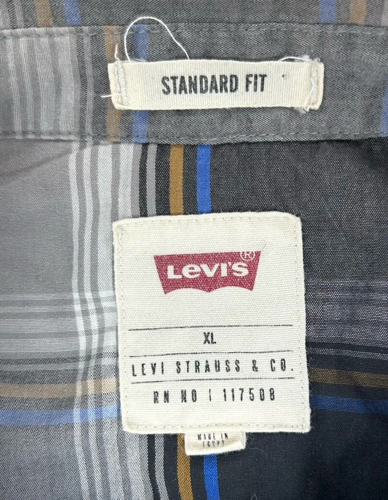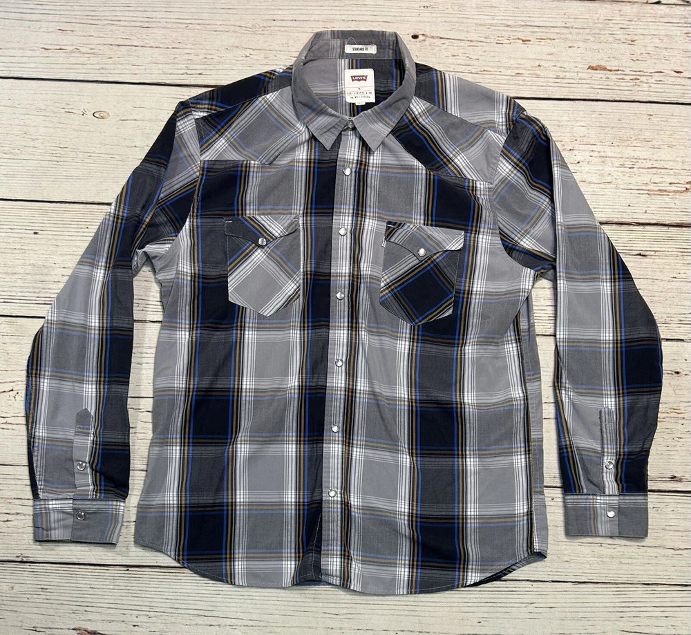This Levi's shirt is a must-have for any casual occasion. With a plaid pattern and multicolor design, it features long sleeves and a collared neckline with a point collar style. The shirt has a regular fit and is available in size XL. It is made of a knit fabric type and includes flap pockets as accents. The closure is a snap button-up and it is machine washable for easy care. The shirt is suitable for all seasons and is perfect for outdoor activities. The brand is Levi's and the shirt is not personalized or handmade. It is a standard fit and is suitable for men of all ages. Check pictures for condition and measurements for size.