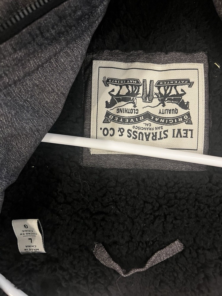 Levi's Puffer Jacket in black, size L for men. Made of 100% polyester with a zip closure and stand-up collar. Features embroidered logo accents, pockets, and breathable insulation. Excellent used condition. No rips, tears or holes. Comes from a smoke free and dog free home. Jacket has spent most its life hung up on a closet. Like new.