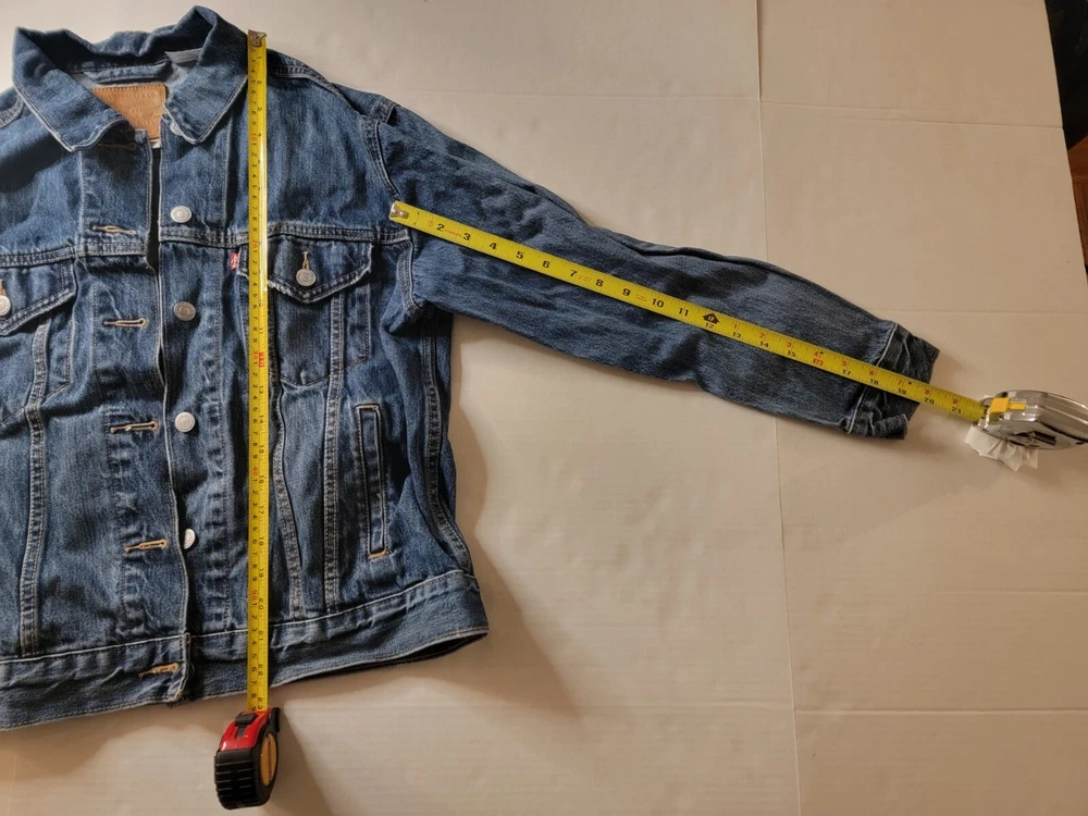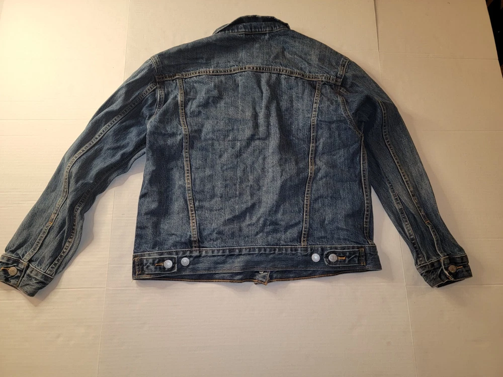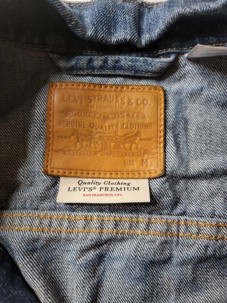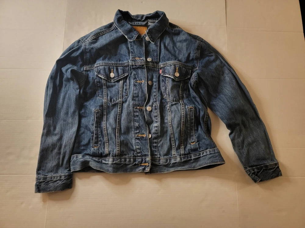 This Levi's Strauss Jean Button Jacket for women is a must-have addition to your wardrobe. The jacket is made of a cotton blend denim fabric that is both comfortable and durable. It features a solid blue pattern and a biker style that is perfect for casual and workwear occasions. The jacket has long sleeves, a button closure, and Levi's logo accents. It also has pockets to keep your essentials close by. The jacket is machine washable and comes in size medium. It is suitable for fall and spring seasons. Please refer to the photos for the jacket/coat length. This Levi's Trucker jacket is not only fashionable but also practical. So, add this USA-themed jacket to your collection today!