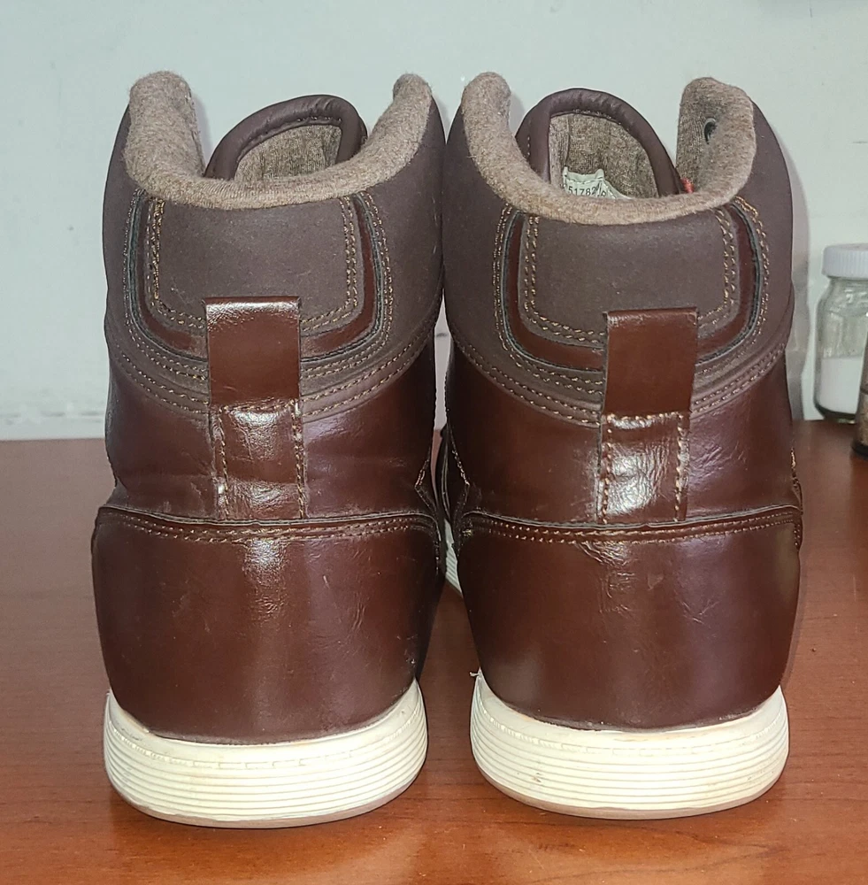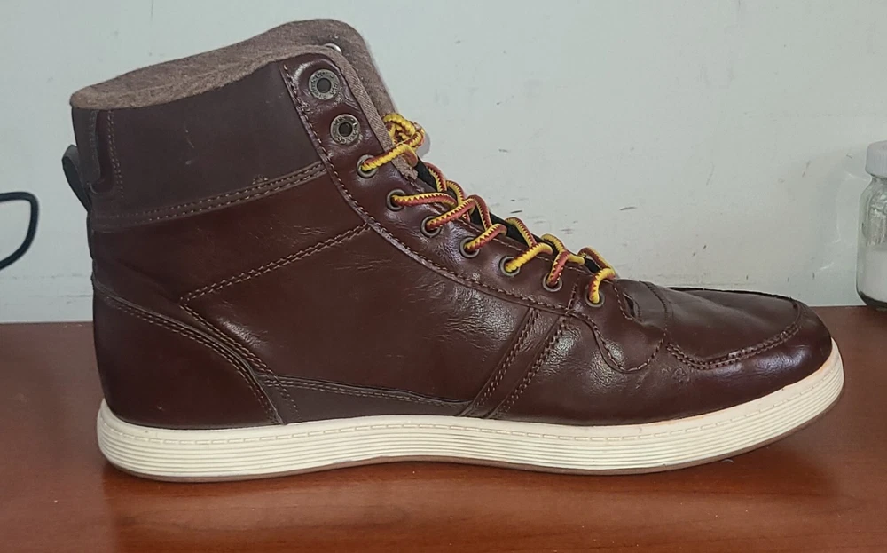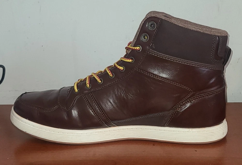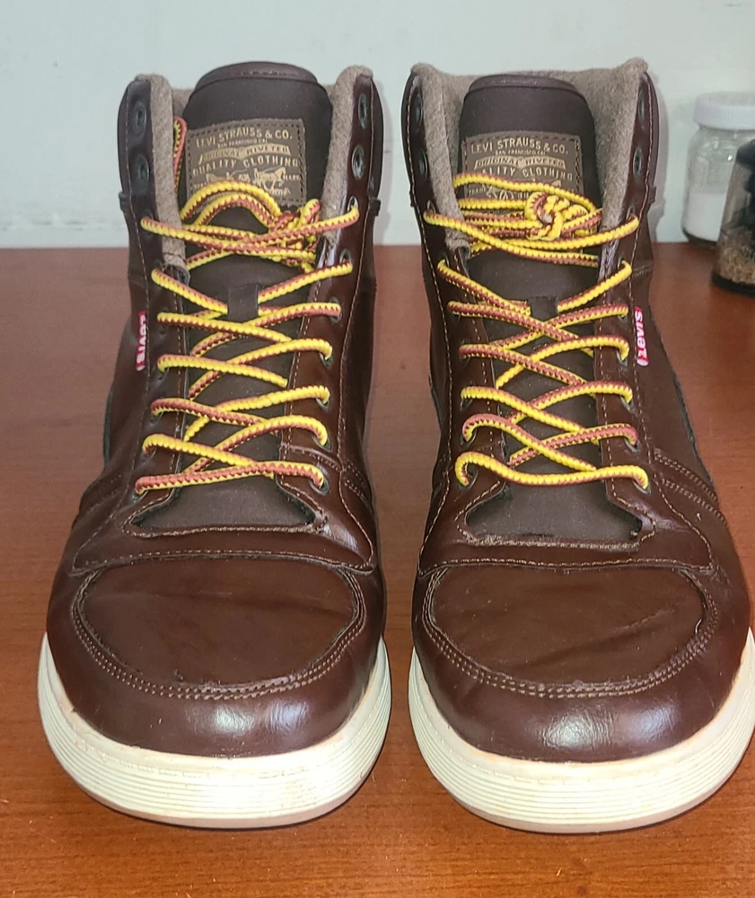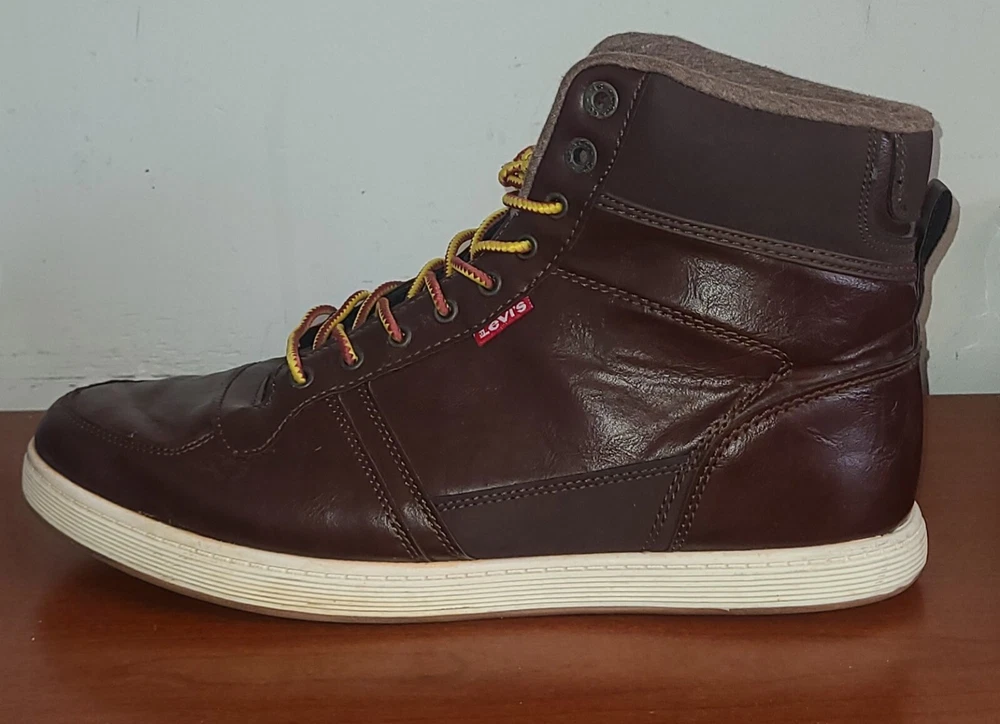 Elevate your style with these brown high top sneakers from Levi's Strauss. Designed with a solid pattern and faux leather fabric, these shoes feature a lace-up closure and logo accents for a touch of sophistication. Perfect for travel, sports, or casual occasions, these sneakers offer comfort and versatility for any season. With a UK shoe size of 11, US shoe size of 12, and EU shoe size of 46.5, these Levi's sneakers are a great addition to any men's shoe collection. The synthetic lining material and insole provide a comfortable fit, while the medium shoe width ensures a snug and secure fit. Whether you're dressing up or dressing down, these shoes are a must-have for any fashion-forward individual.