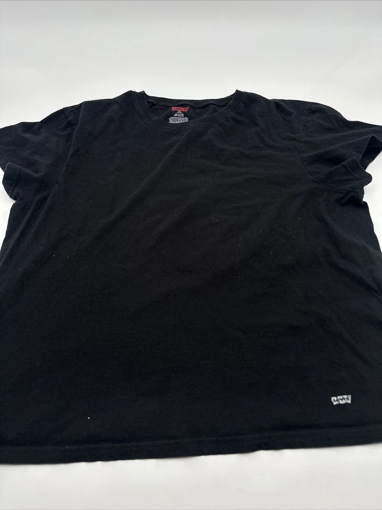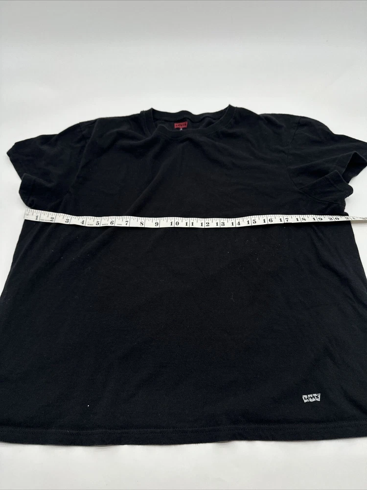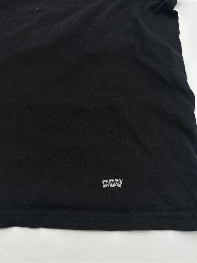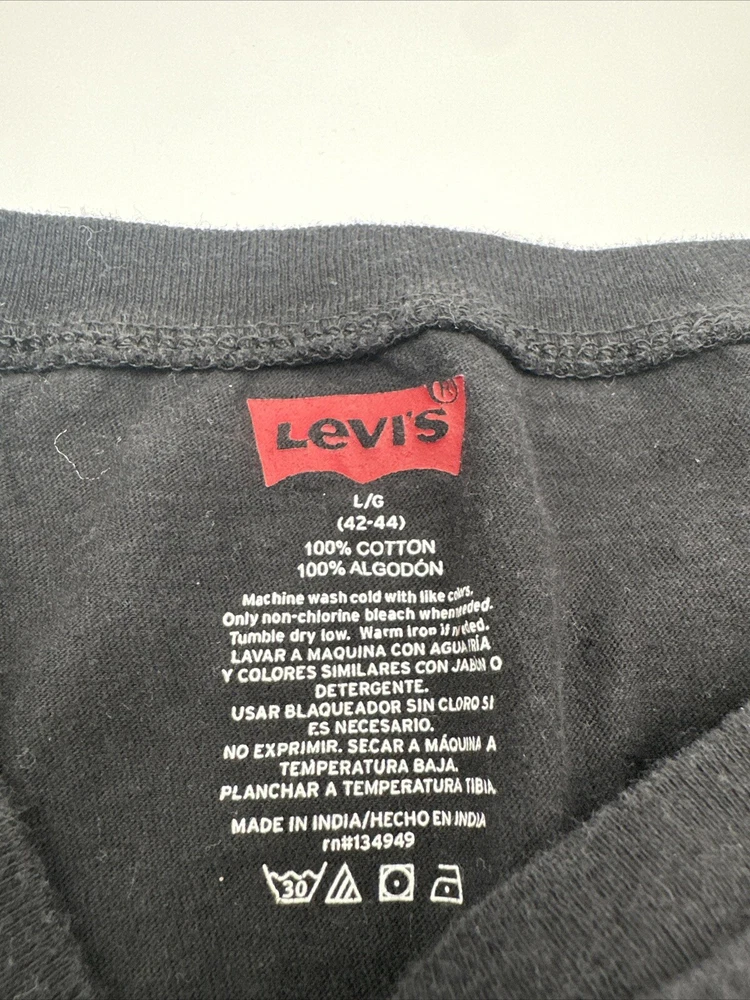 This Levi's T-Shirt is a classic designer piece for men in size Large. Made with 100% cotton material, it features a solid black color with a logo accent on the chest. The shirt has a regular fit and short sleeves, with a round neckline. It is perfect for everyday wear and can be paired with any outfit. The shirt is made in India and is of high quality. Check pictures for flaws and measurements