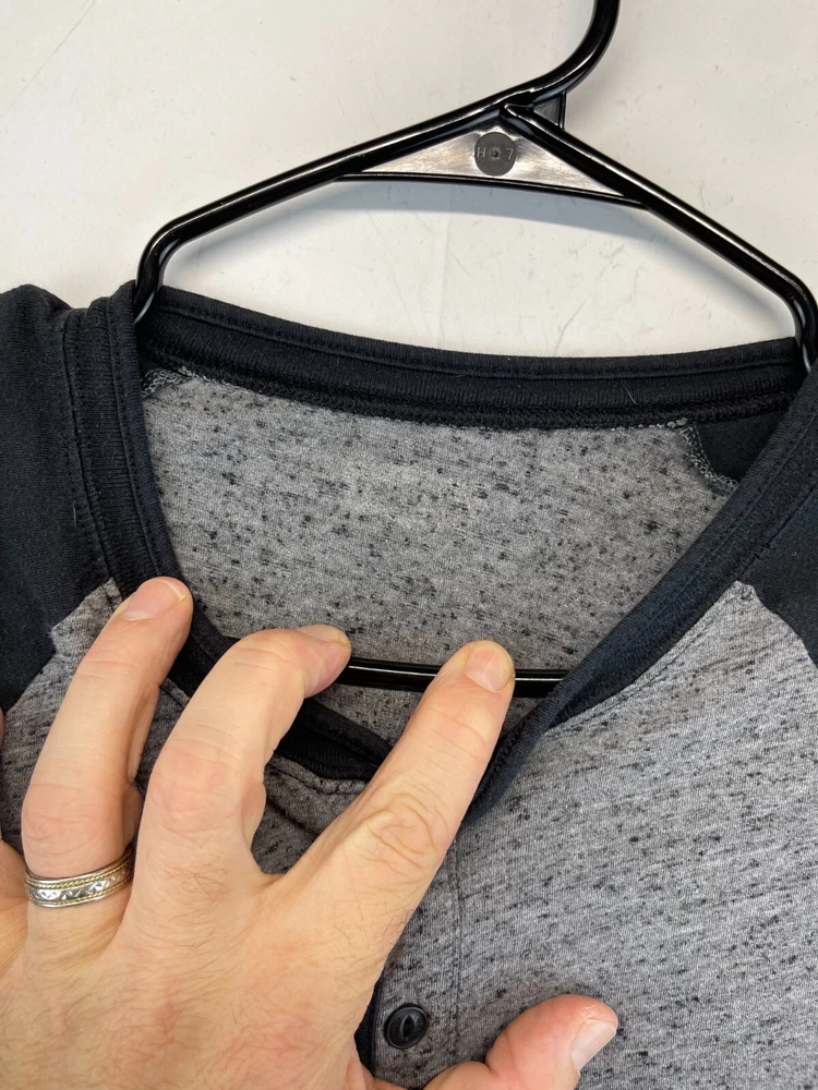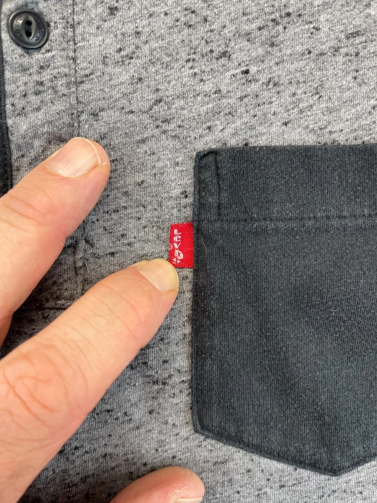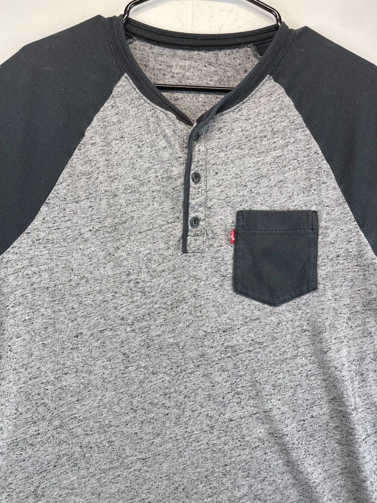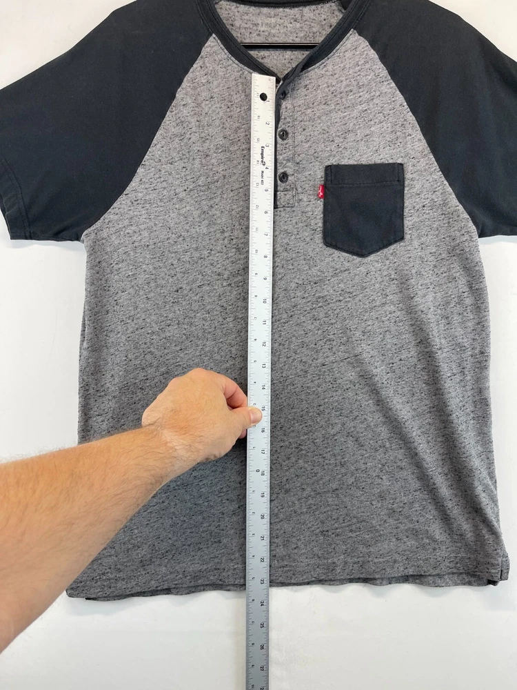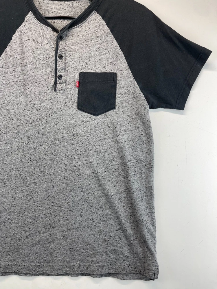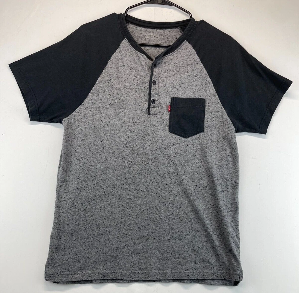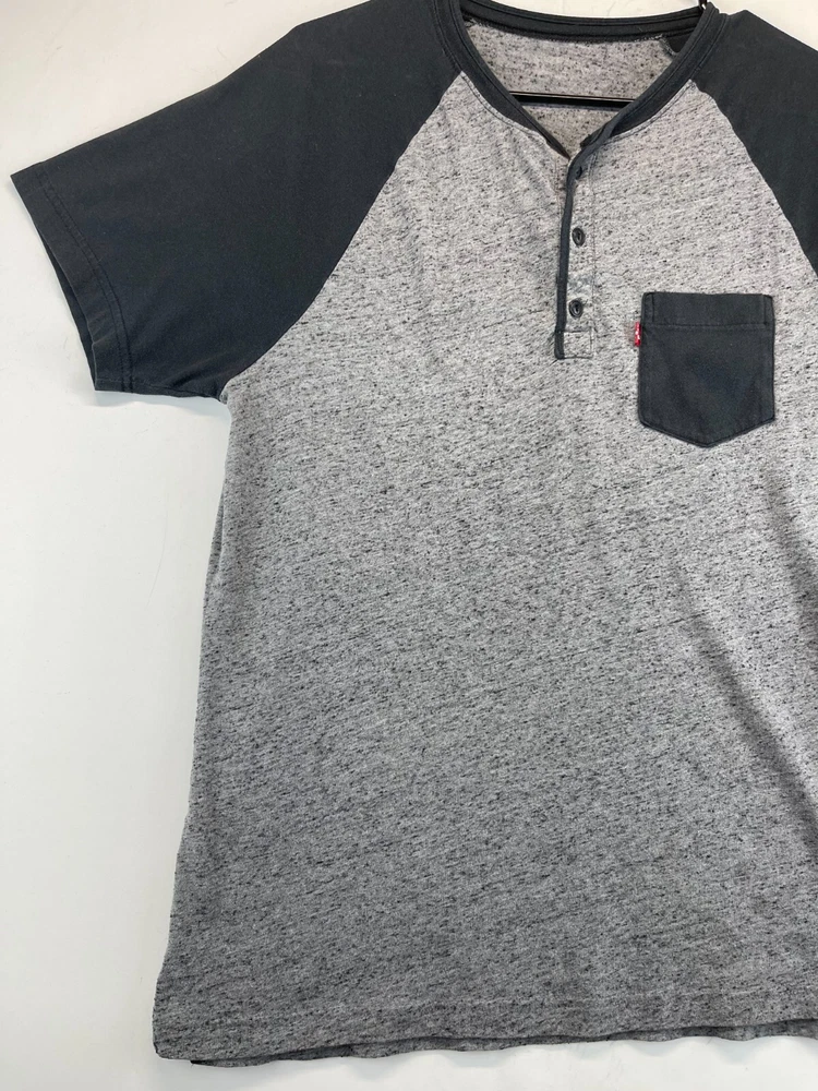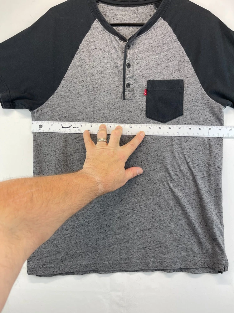 This Levi's T-Shirt for men features a solid pattern with a gray and black Henley neckline. The short sleeve T-shirt is made of comfortable cotton knit fabric that is easy to care for and suitable for all seasons. It has a regular fit with a button accent and is available in size See photos for measurements. The T-shirt is perfect for outdoor and classic themes and is a must-have for any wardrobe. Very good preowned condition. The tag has been worn away and as such, PLEASE SEE ALL PHOTOS FOR MEASUREMENTS. For clothing specifically, see photos for all measurements and/or any issues if applicable. All clothing has been washed and comes from a smoke free environment. I am available for questions. I accept or negotiate reasonable offers. Have an amazing day. Thank you.