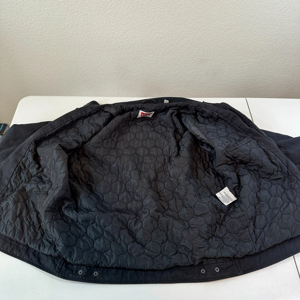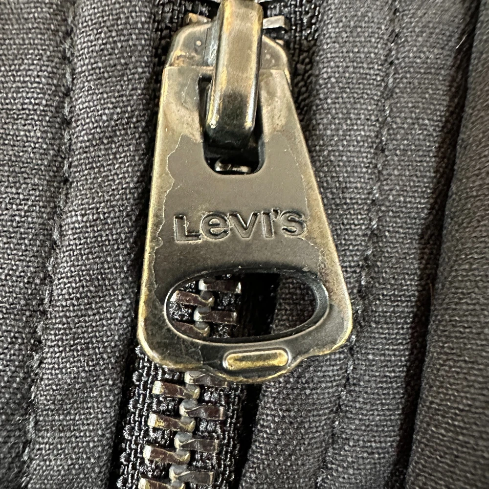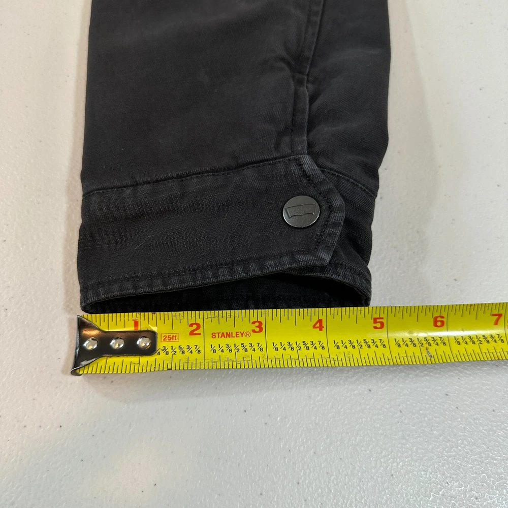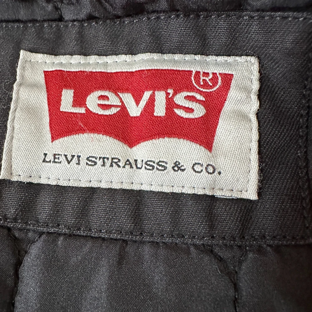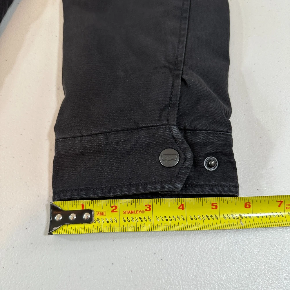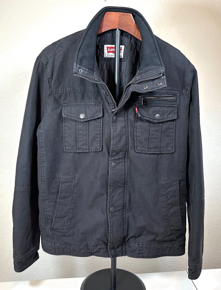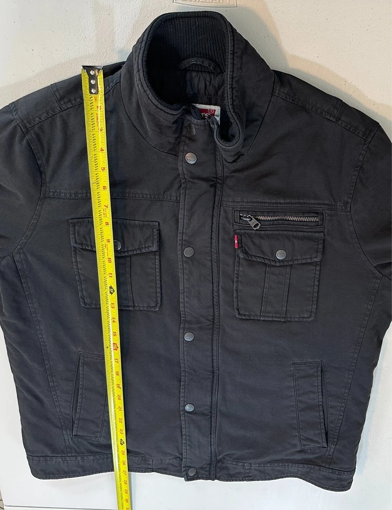 Levi's Trucker Jacket 5 Pocket Black Chore Barn Coat Fall Christmas Men's Size Large Approximate Measurements (inches): Length: 27" Pit to Pit: 24" Sleeve: 26" Shoulder: 18.5" Cuff: 4.75" - 5.5" 100% Cotton shell 100% Polyester lining & filler Machine Washable This jacket is medium to heavy weight, weighing ~2 lbs 8oz itself. Features: - 5 outer pockets; 1 zippered chest pocket, 2 snap closure chest pockets & 2 slip side pockets. - 1 interior chest pocket, left side. - Full zip closure w/ additional snap closure. - Quilted liner Pre-loved & in great condition! Some minimal wear on surface of zipper pull. See photos for close ups & measurements. Freshly laundered & ready to ship!