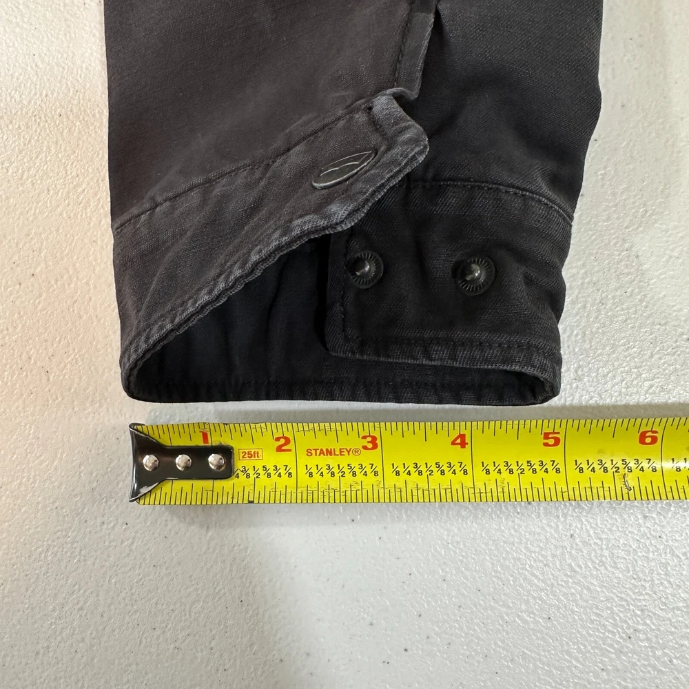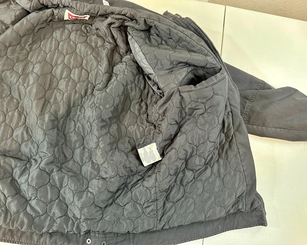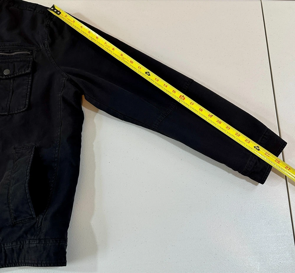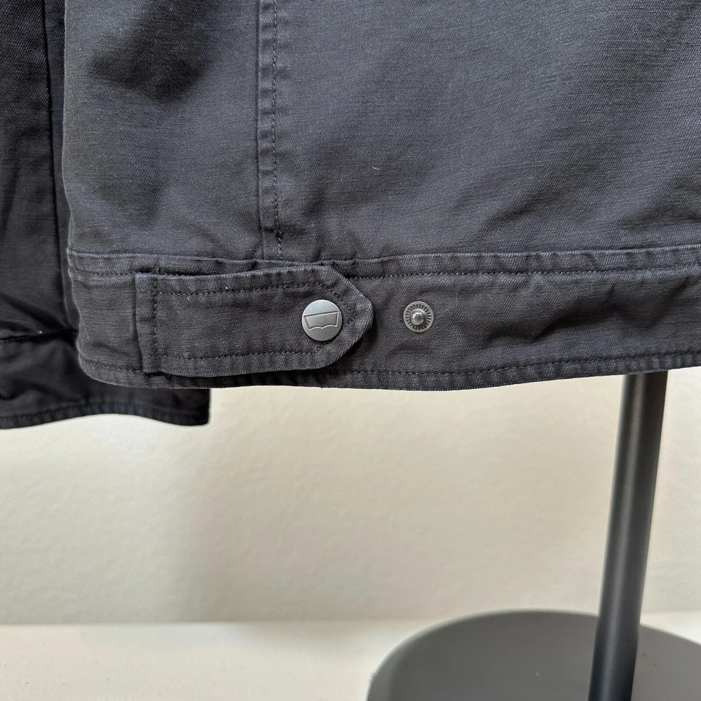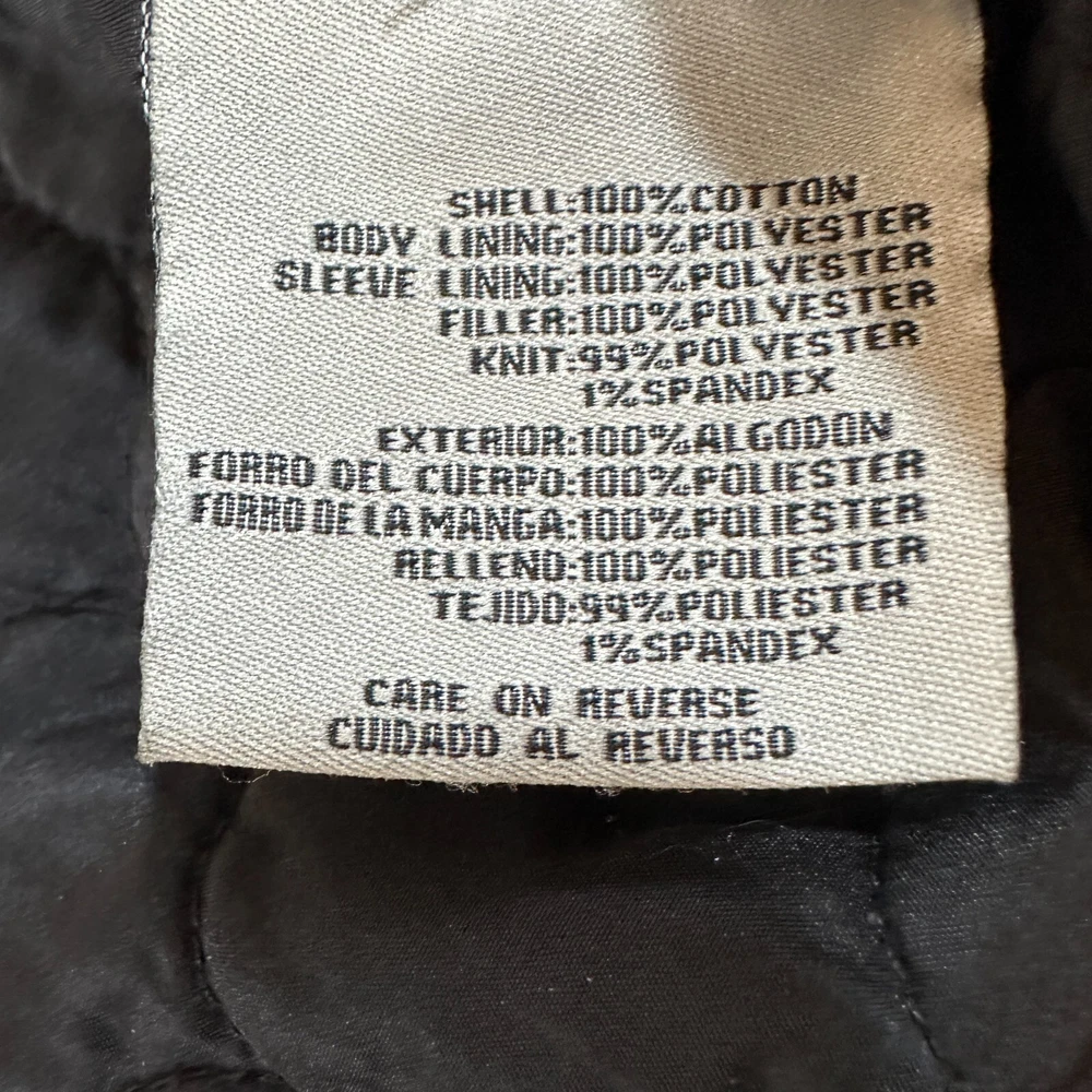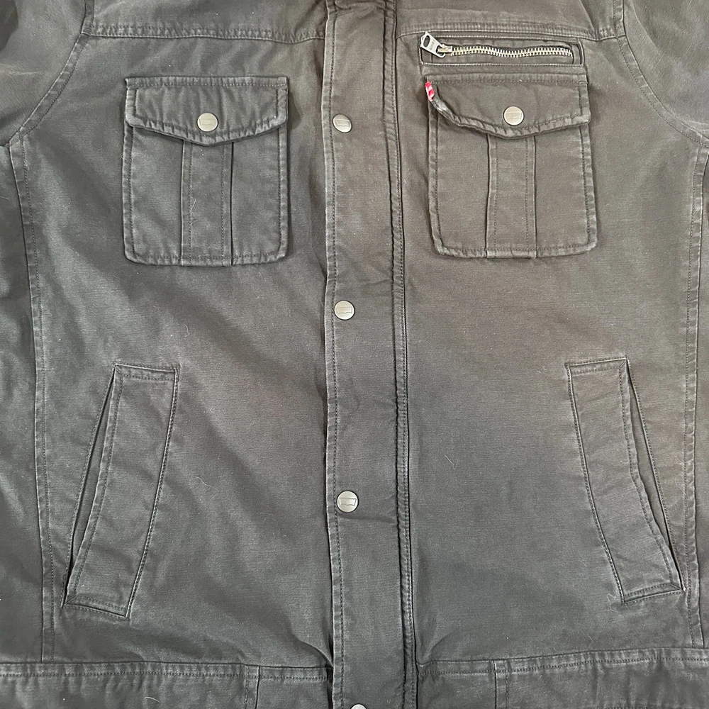 Levi's Trucker Jacket 5 Pocket Black Chore Barn Coat Fall Christmas Men's Size Large Approximate Measurements (inches): Length: 27" Pit to Pit: 24" Sleeve: 26" Shoulder: 18.5" Cuff: 4.75" - 5.5" 100% Cotton shell 100% Polyester lining & filler Machine Washable This jacket is medium to heavy weight, weighing ~2 lbs 8oz itself. Features: - 5 outer pockets; 1 zippered chest pocket, 2 snap closure chest pockets & 2 slip side pockets. - 1 interior chest pocket, left side. - Full zip closure w/ additional snap closure. - Quilted liner Pre-loved & in great condition! Some minimal wear on surface of zipper pull. See photos for close ups & measurements. Freshly laundered & ready to ship!