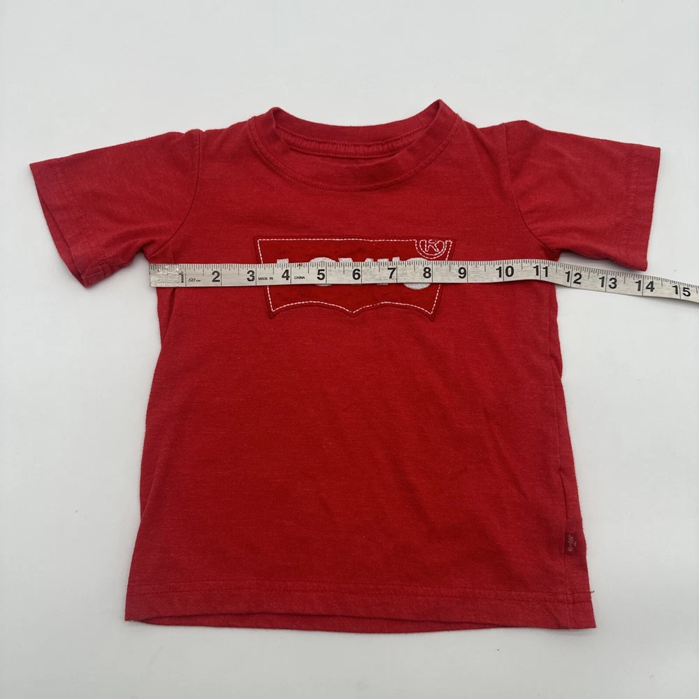 Dress up your little boy in this stylish Levi's T-shirt, featuring a red color with an embroidered logo. The shirt is made of a comfortable blend of polyester and cotton, ensuring a relaxed fit for your child. This short-sleeved crew neck tee is perfect for casual occasions, whether it's a day at the beach or just hanging out. The shirt is available in size 3T, suitable for boys aged 2-3 years. It has a pullover closure and is designed with solid patterns. This T-shirt is a great addition to your child's wardrobe, representing the Levi's brand and style. Check pictures for flaws and measurements