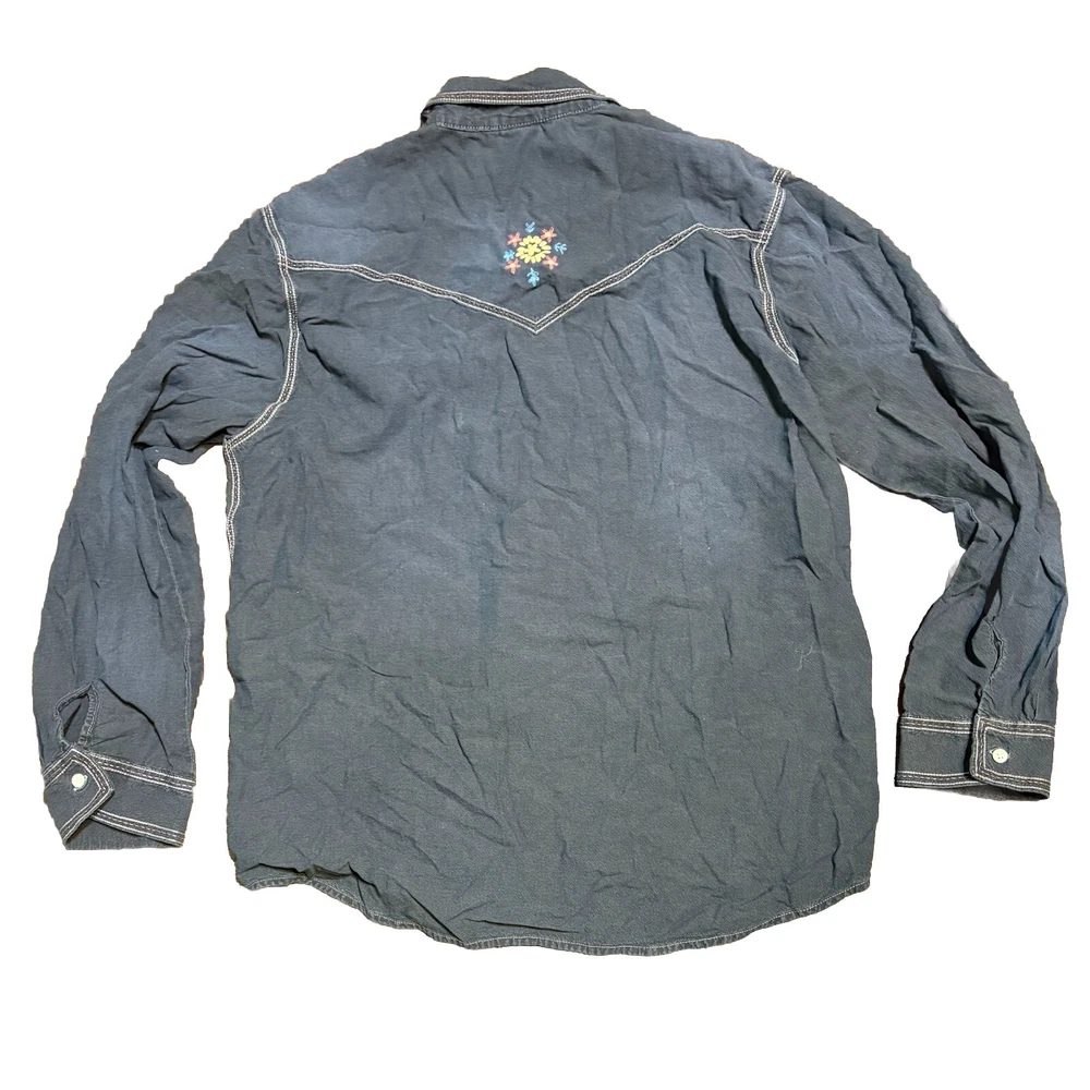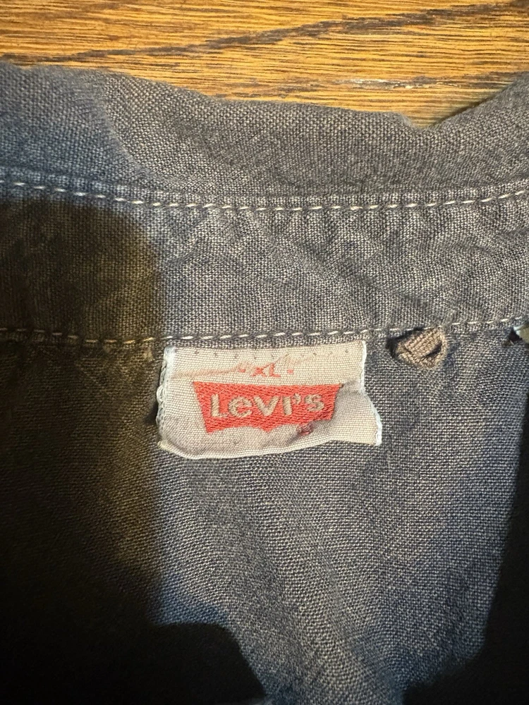 Levis Vintage Clothing LVC Strictly Rockers Chambray Shirt XL Embroidered Floral Patches. Shirt has a nice pre-washed fade to it.