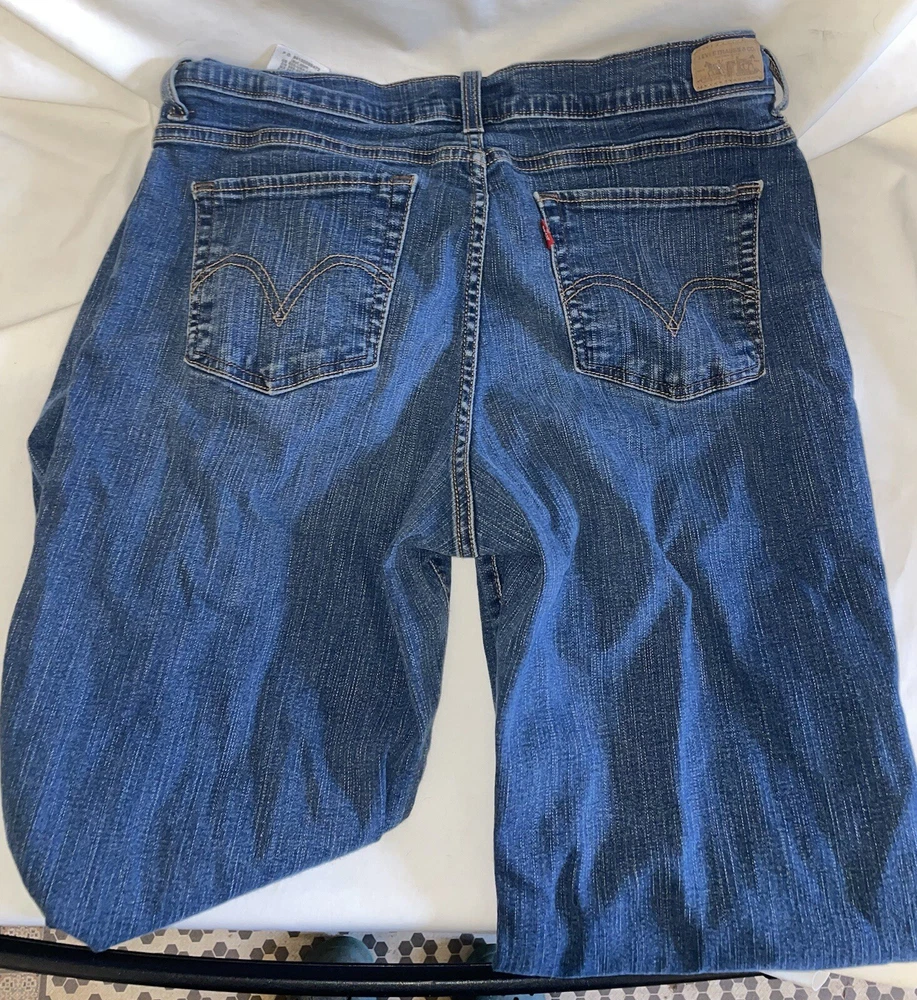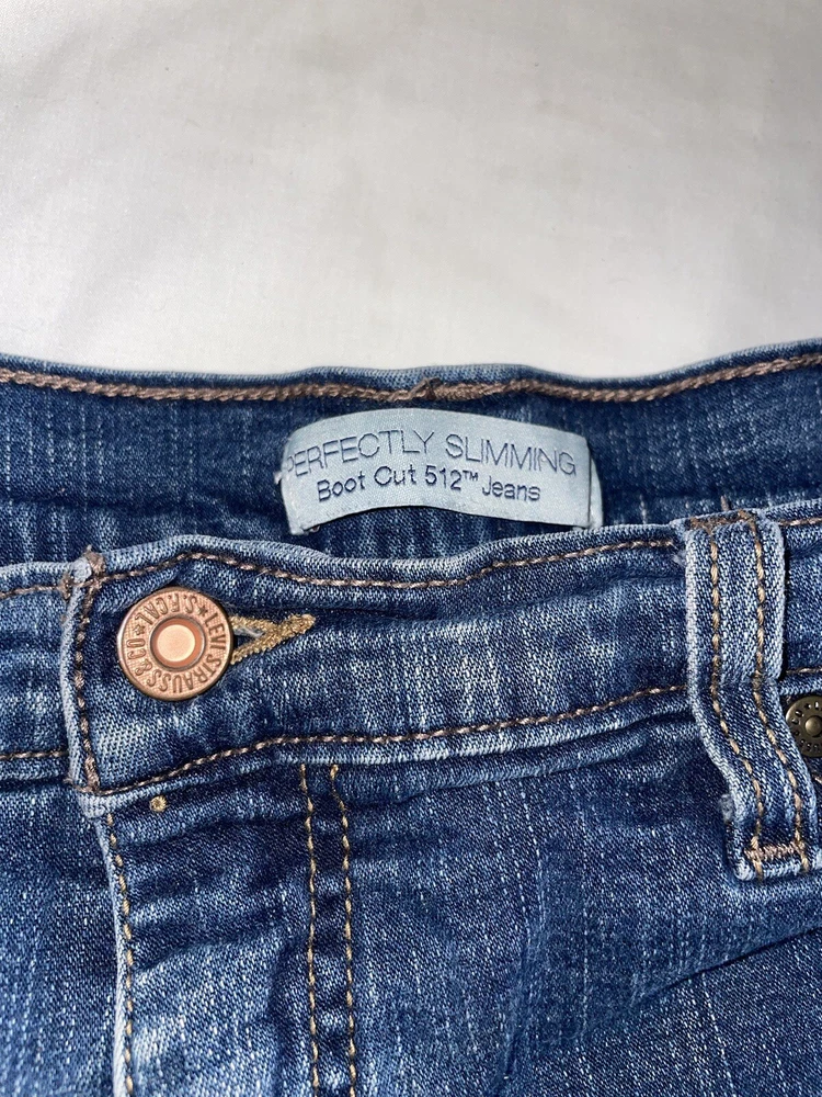 Levi jeans Perfectly slimming boot cut 512 jeans They are size 16M. The waist is 16 1/2 inches wide, the legs inside seam are about 30 inches long and the leg seam at bottom is 10 inches wide. They seem to be pretty stretchy. Please see pictures for condition and details. Thank you so much for looking! If you would like more pictures please let me know.