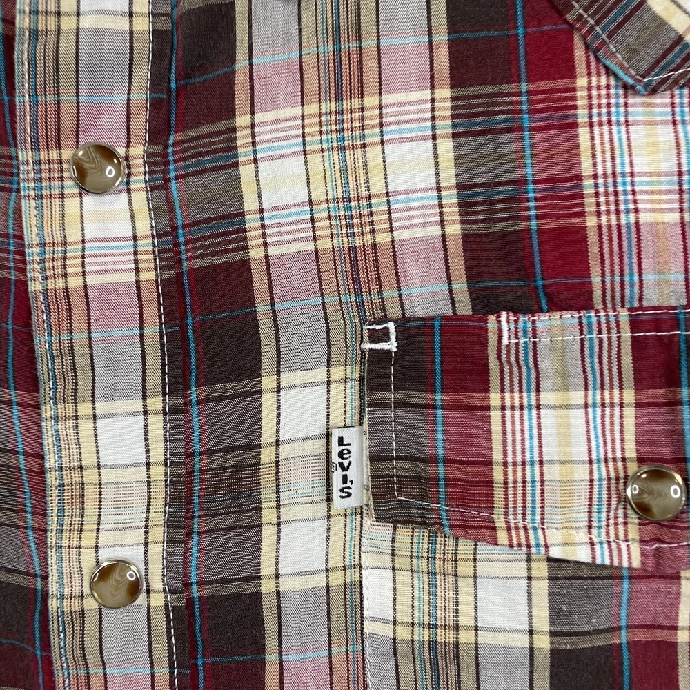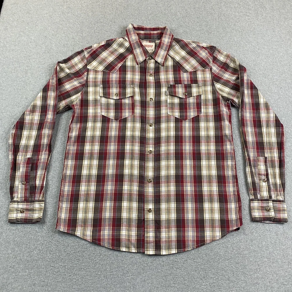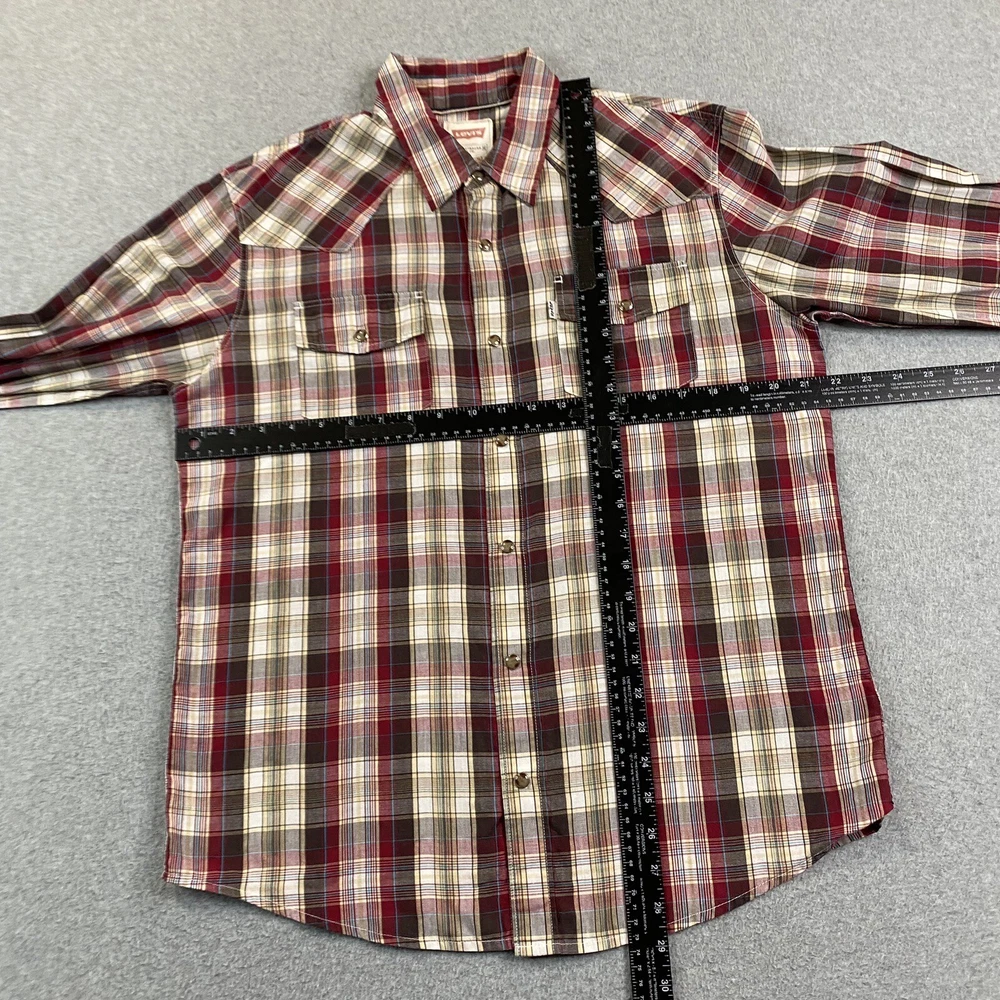 Sleeve Length: Long Sleeve Color: Multicolor Type: Button-Up Pattern: Plaid Collar Style: Point Brand: Levi's Fit: Regular Features: Pockets, Easy Care Size Type: Regular Accents: Button Occasion: Workwear Fabric Type: Woven Size: M Department: Men Vintage: No Material: Cotton, Polyester Closure: Snap 出品者のメモ: “Item is in used condition with no holes or stains.” Theme: City, College, Cowboy, Dad, Outdoor, Preppy, USA, Western, casual, workwear, american, texas\, texas, chore, ranch, barn Neckline: Collared Country/Region of Manufacture: Indonesia