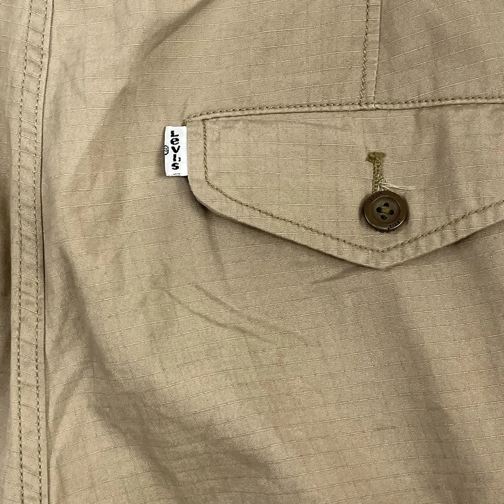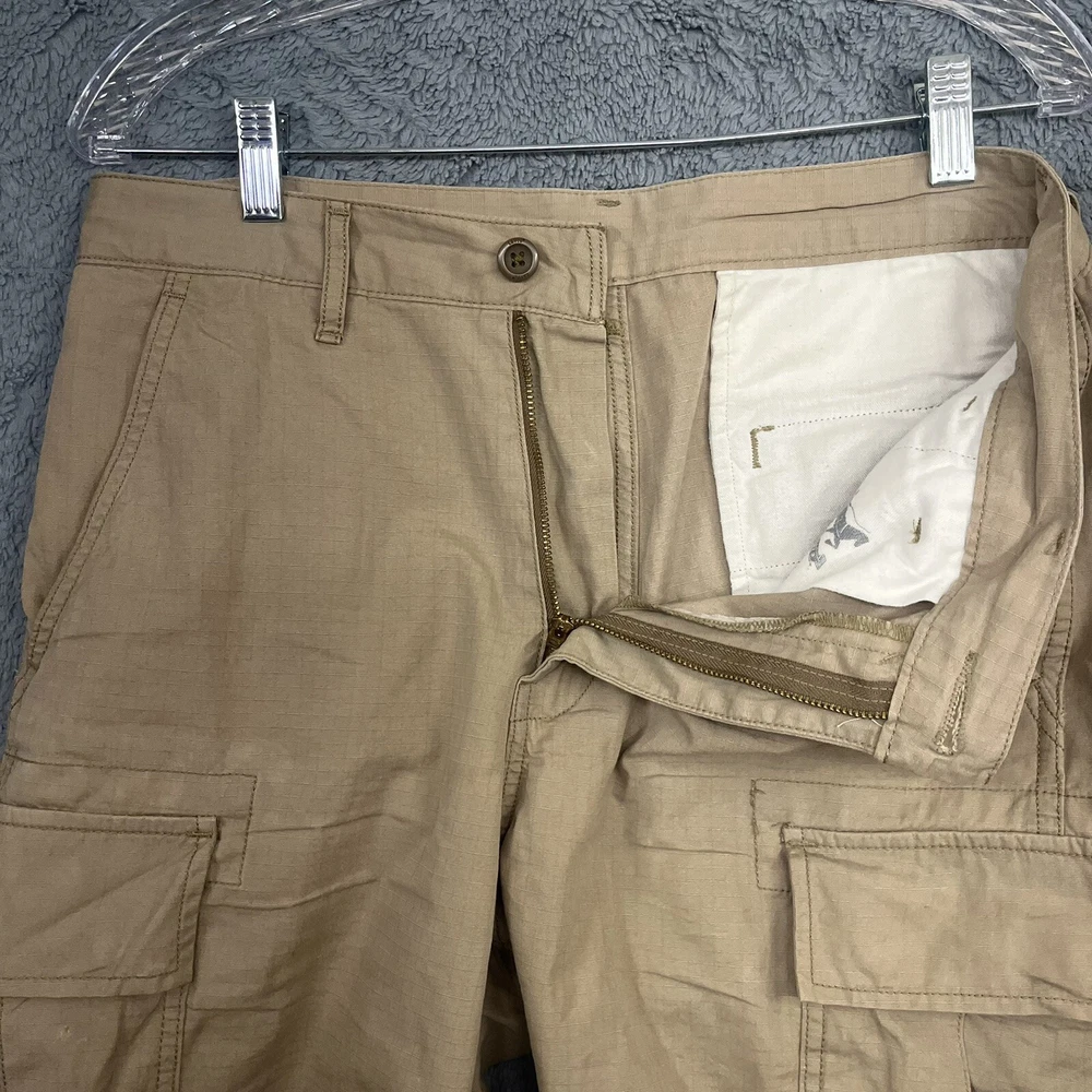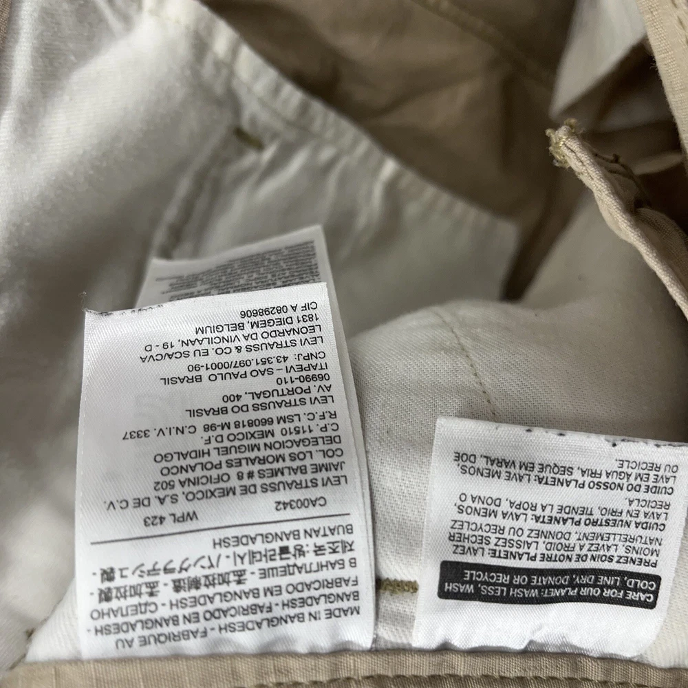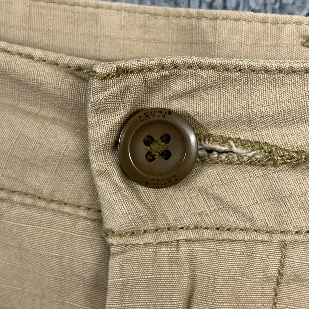 Closure: Zip Brand: Levi's Pocket Type: Cargo Pocket Style: Cargo Garment Care: Machine Washable Color: Beige Country/Region of Manufacture: China Occasion: Casual, Travel Waist Size: 30 in Size Type: Regular Material: Cotton Season: Spring, Summer Pattern: Solid Handmade: No Inseam: 9 in Vintage: No Front Type: Flat Front Department: Men Size: 30 Rise: Mid (10-12 in) Fit: Regular Features: Easy Care, Pockets