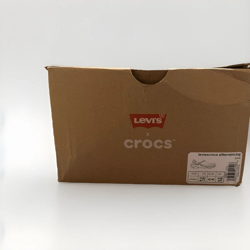 Step into comfort and style with the Levi's x Crocs Classic All-Terrain Clog in Sashiko Light Wash. This limited edition collaboration blends the iconic Crocs design with a fresh, colorful theme, featuring a classic check pattern and the timeless Levi's logo. Perfect for those who value both comfort and style, the clog's lightweight construction and cushioned insole make them ideal for any activity, from walking to gym training. Crafted with a durable rubber upper and designed for year-round wear, these clogs boast a low-top shaft for a casual fit and are equipped with an ankle strap to secure your feet. The versatile blue hue complements a range of outfits, making them a smart addition to any casual ensemble. Whether you're headed to school or enjoying the outdoors, these size 9 Crocs offer a fusion of functionality and fashion. Damaged Box but contains all 3 Jibbitz and wrapping paper inside.