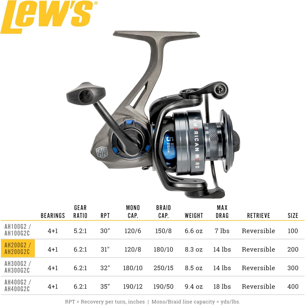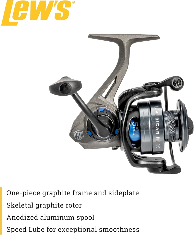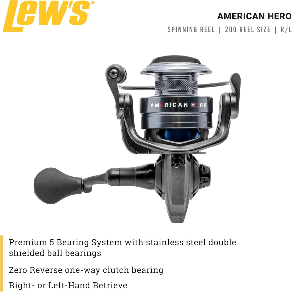 PRIDE AND FISHABILITY: Lew’s American Hero spinning reel blends pride and fishability, delivering exceptional performance in a smooth, durable, size 200 reel. Demanding anglers will appreciate the folding handle and the reel’s reversible retrieve system for a personalized fishing experience. Lew’s American Hero spinning reel is perfect for every angler who has served our great country SMOOTH AND DURABLE: Experience smooth and strong casting and retrieving with Lew’s American Hero spinning reel thanks to a lightweight one-piece graphite frame and sideplate, 5 stainless steel double shielded ball bearings with a Zero Reverse one-way clutch bearing, and high-strength solid brass Speed Gears, precision cut on Hamai CNC machines. To further reduce weight, this reel features a skeletal graphite rotor to help avid anglers fish all day in comfort and style ALL DAY PERFORMANCE: Lew’s American Hero spinning reel is engineered for the versatile angler with a 6.2:1 gear ratio and 31-inches of line recovery per turn. Its oiled felt multi-disc drag system provides 14-pounds max drag to help bring trophy fish to hand. The anodized, braid-ready aluminum spool and Speed Lube system provide exceptional smoothness and performance under all conditions BUILT FOR SUCCESS: With a capacity of 120-yards of 8-pound-test fluorocarbon or 180-yards or 10-pound-test braid fishing line, this top-rated reel is the best choice for anglers fishing for bass, panfish, trout, catfish, or walleye using artificial lures or live baits ROCK SOLID RELIABILITY: Anglers who hit the water with Lew’s American Hero spinning reel fish with the confidence that their gear is backed by a one-year limited warranty and supported by the dedicated Customer Service team at Lew's Delivering on the promise of Lew’s quality and performance, the American Hero Spinning Reel is engineered with top-tier components for exceptional operation day in and day out. The reel boasts power and precision with a 5-bearing system and high strength, solid brass, Hamai CNC precision cut Speed Gears, all lubricated with Speed Lube for exceptional smoothness and performance in all weather conditions. The construction of the American Hero Spinning Reel is a masterful blend of lightweight design and durability. The graphite frame and sideplate, coupled with a skeletal graphite rotor and an anodized aluminum braid-ready spool, contribute to an overall lightweight feel without compromising strength. Experience comfort and customization with the folding aluminum handle with paddle knob and reversible retrieve. In every detail, the American Hero Spinning Reel reflects Lew’s commitment to delivering a superior fishing experience. Embrace the confidence that comes with a reel engineered for excellence, ready to tackle any challenge you throw its way. Lew’s pledges a portion of profits from the sale of every American Hero reel, rod, and combo for the purpose of supporting and helping organized programs that benefit the mind, spirit, soul, and body of our veterans in their return to enjoying recreational opportunities outdoors, such as fishing.