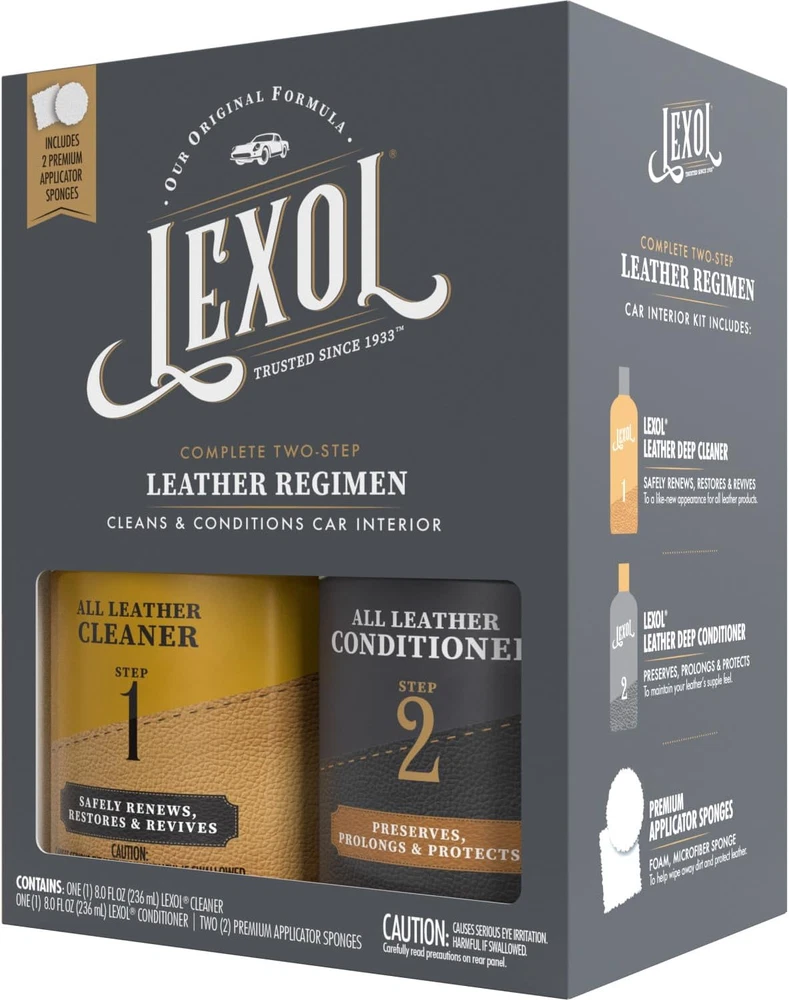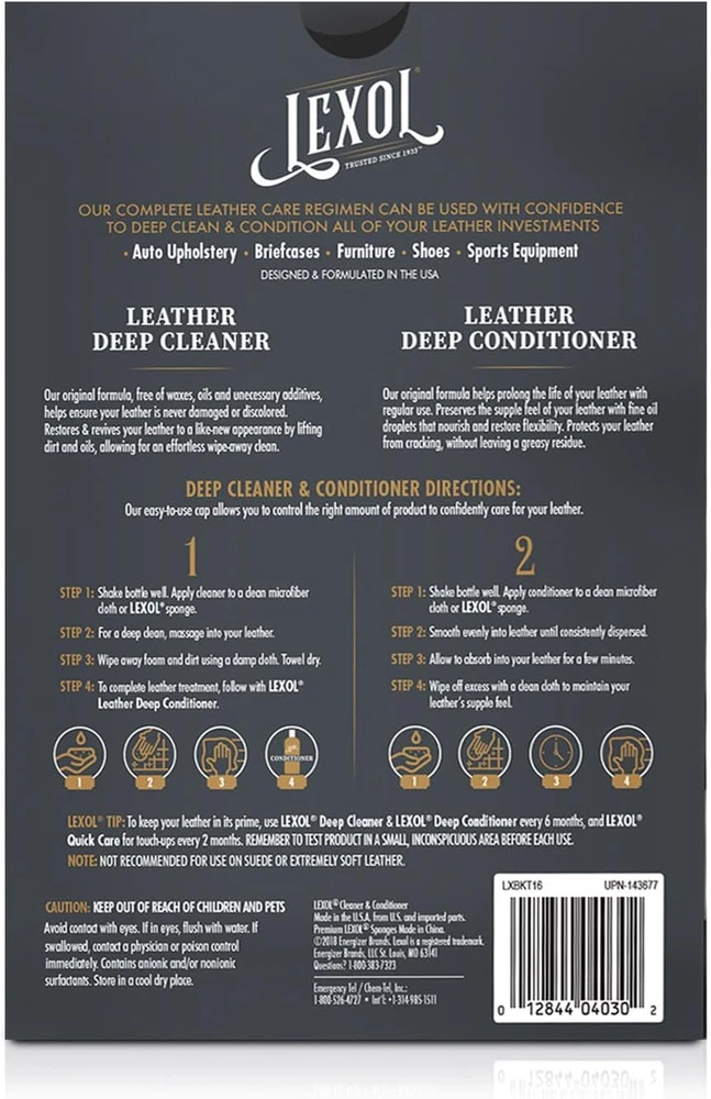 Store New Arrivals Add to Favorite View Feedback Contact Lexol All Leather Cleaner and Conditioner Kit for Car Seats and Interiors, Couches and Furniture, Shoes and Boots, Baseball Gloves and Horse Saddles, Two 8 Oz Bottles and Two Sponges Description Item model number LXBKT08 Brand Lexol Country of Origin USA Manufacturer Part Number LXBKT08 Item Weight 1.3 pounds Position Outside Model LEX Cln Cond w/ Spng Kit Btl 6/8oz US Product Dimensions 4 x 5.37 x 7.13 inches Manufacturer Lexol This leather care kit includes one 8 oz bottle of Lexol All Leather Cleaner, one 8 oz bottle of Lexol All Leather Conditioner, and two application sponges The pH-balanced leather cleaner gently lifts away dirt and oil, while the leather conditioner restores a soft, supply feel to a variety of leather surfaces The perfect leather cleaner and conditioner for car seats; goes beyond auto care to prolong the life of all your finished leather investments Try it as a leather couch cleaner and conditioner or on other leather furniture; can also be used as a leather boot care kit, leather jacket cleaner and conditioner, baseball glove conditoner, and more Start with the cleaner, then follow with the conditioner to safely restore and protect your leather goods The elements are not kind to your leather investments. Fortunately, you can protect them with the Lexol All Leather Cleaner and Conditioner Kit. This leather care kit includes Lexol All Leather Cleaner, Lexol All Leather Conditioner, and two application sponges. With one application sponge, massage the leather cleaner into your leather and wipe dirt and oils away to restore a like-new appearance. Then, with the other sponge, apply the leather conditioner—in minutes, fine oil droplets are absorbed, nourishing and preserving flexibility without leaving greasy residue. This kit is the perfect leather cleaner and conditioner for car seats, but it also goes beyond auto care to protect other finished leather items. Use it as a leather couch cleaner and conditioner or on other leather furniture such as chairs and ottomans. Try it as a leather shoe cleaning kit or to breathe new life into your favorite leather boots. It can also be used as a leather jacket cleaner and conditioner or to restore leather handbags, and it’s great as a baseball glove conditioner or on other leather sporting goods such as horse saddles. To keep your leather in top condition, treat it every 6 months. From Lexol, trusted since 1933. ABOUT US We offer the best prices around on high quality products. Our E-store includes media such as books, movies, music and games while offering electronics, toys, sporting apparel, clothing, tools, general home, garden items and more. SHIPPING We are always working hard to ensure your package arrives as soon as possible. Please understand that some factors like weather, high postal traffic, and the performance of shipping companies are outside of our control. We offer free shipping to the lower 48 states and ship within 2 business days of payment, usually sooner. We do not accept P.O. Boxes. Please provide a physical address. RETURNS We offer a 30-Day Return Policy on items which you are not completely satisfied with. You have the option for a full-refund or an exchange of the item. No returns are available on items shipped outside of the USA. PAYMENT We accept PayPal. CONTACT US This page content is yet to come Please ad us to your favorite seller and visit again later Thank You CUSTOMER SATISFACTION We try our very best to make sure every customer is completely satisfied. If there's a problem, message us! We're happy to help.