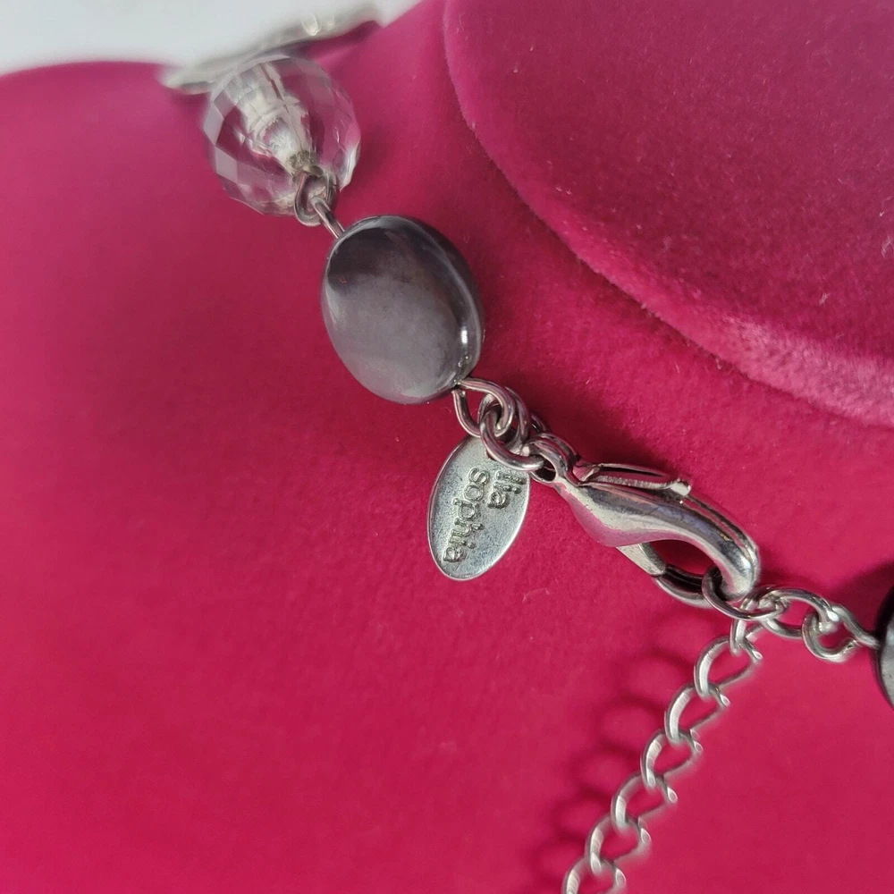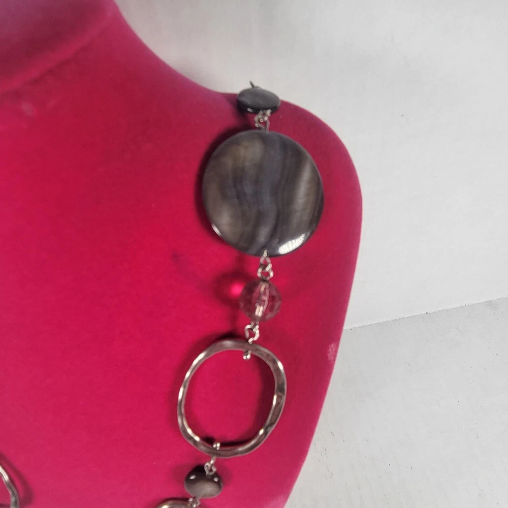This is a Lia Sophia "BUNGALOW" necklace featuring abstract retro design with mother-of-pearl and resin beads. The necklace is 36" long and comes in a silver color. It has a chain style and makes a statement with its unique and eye-catching design.