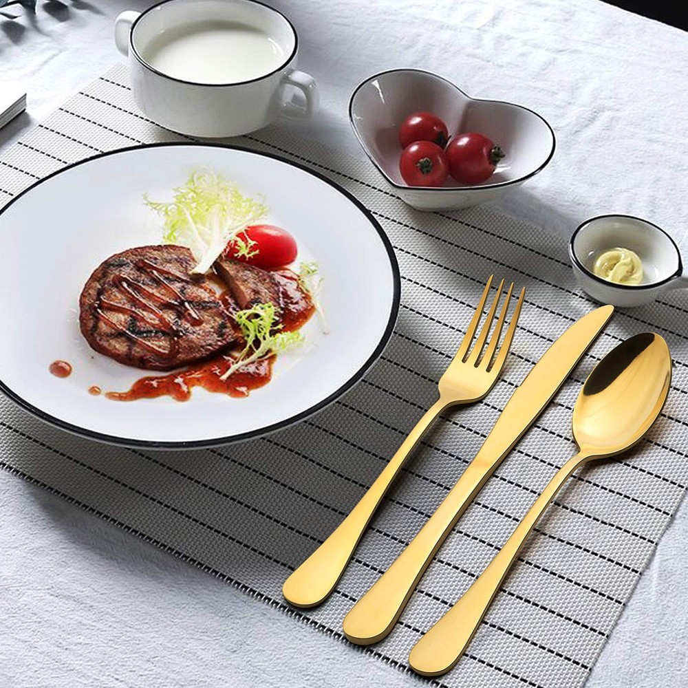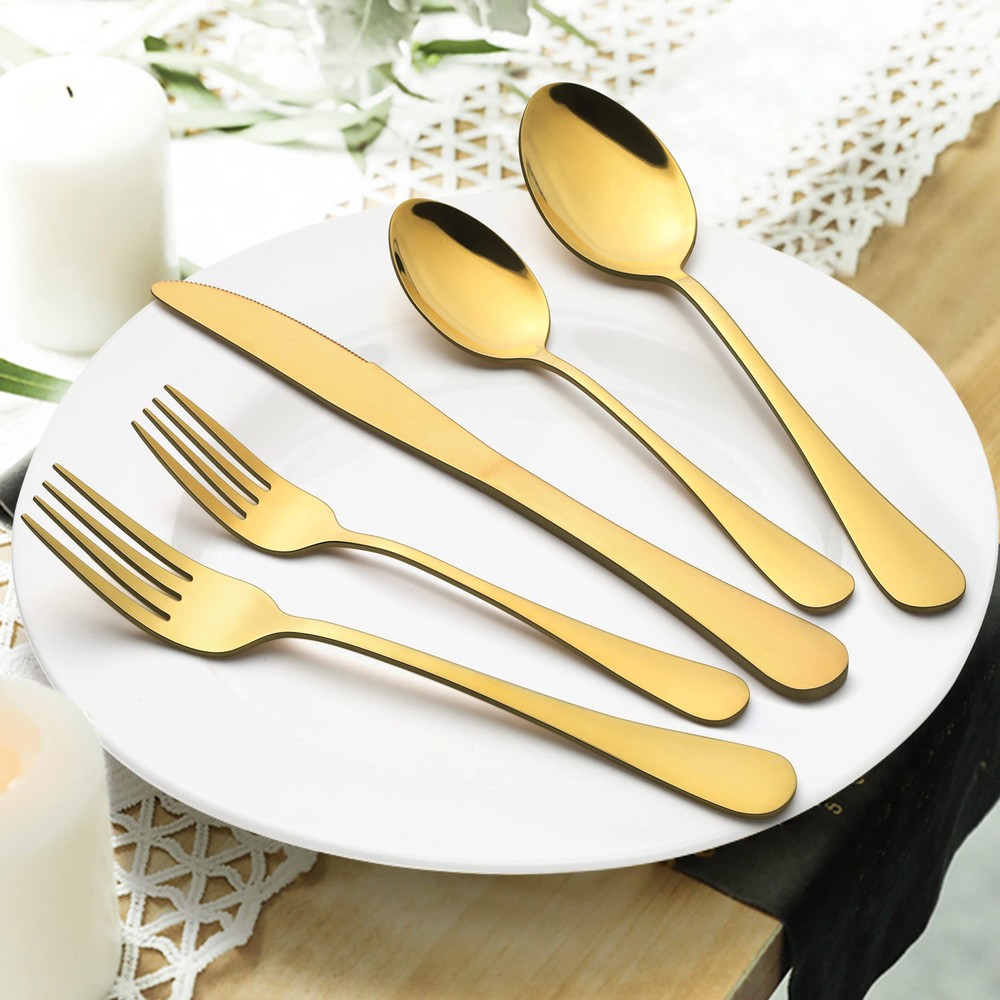 60 Piece Gold Silverware Set, is made of high quality stainless steel. Vacuum electroplating technology ensure the durability of the gold painting. Bright mirror finish always stay shining. Elegant enough to match your high ending tableware. This beautiful flatware set is good for daily use and special occasions, like friends gathering, wedding, parties, buffets, festivals. Also a great gift for your families or friends. What Include 12 X Dinner Knife 12 X Dinner Fork 12 X Dinner Spoon 12 X Desert Fork 12 X Tea Spoon Specification Material, Stainless Steel Color, Gold Mirror Finish Craft, Vacuum Electroplating Package, Bubble Pack + Gift Box Feature, Smooth edges, Dishwasher safe Using Instruction 1. Please wash the silverware set before first use to make sure no manufacture residue. 2. Please clean the silverware set after using and dry the pieces for their durability. 3. Please do not use iron wire to scratch the pieces to keep their gold surface. 4. The silverware set is dishwasher safe so you can run it through dishwasher to save your labor. Service for 12, this silverware set includes 12 of each, butter knife, dinner fork, dinner spoon, salad fork, tea spoon, meet all of your daily needs Healthy material, made of premium stainless steel without toxic substance into your food, durable and healthy for your everyday use Crafted design, vacuum electroplating technology ensures the durability of the gold painting, no worry about color fading or chipping, dishwasher safe Classic look, bright gold mirror finish, simple but elegant enough to match your high taste tableware, proper weight to provide good balance grip Multipurpose, luxury flatware set, good for home daily use, restaurant, hotel, gathering, party, buffet, great gift for housewarming, wedding, Christmas, festivals
