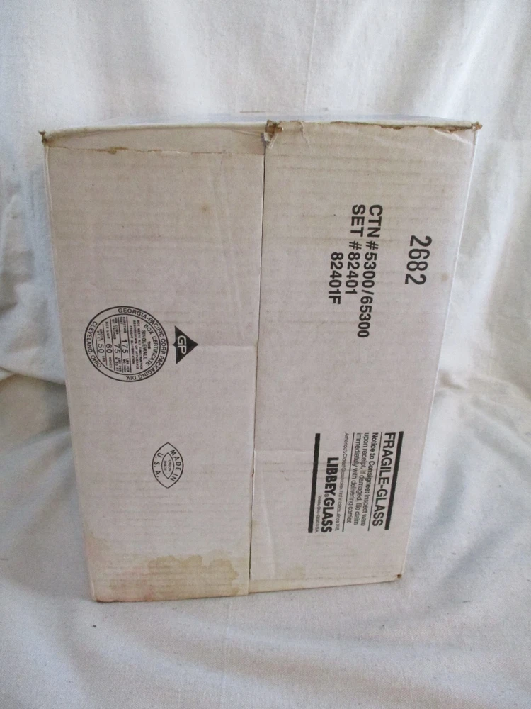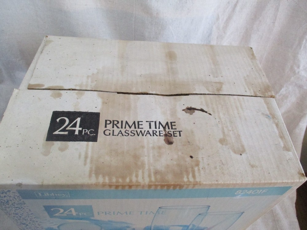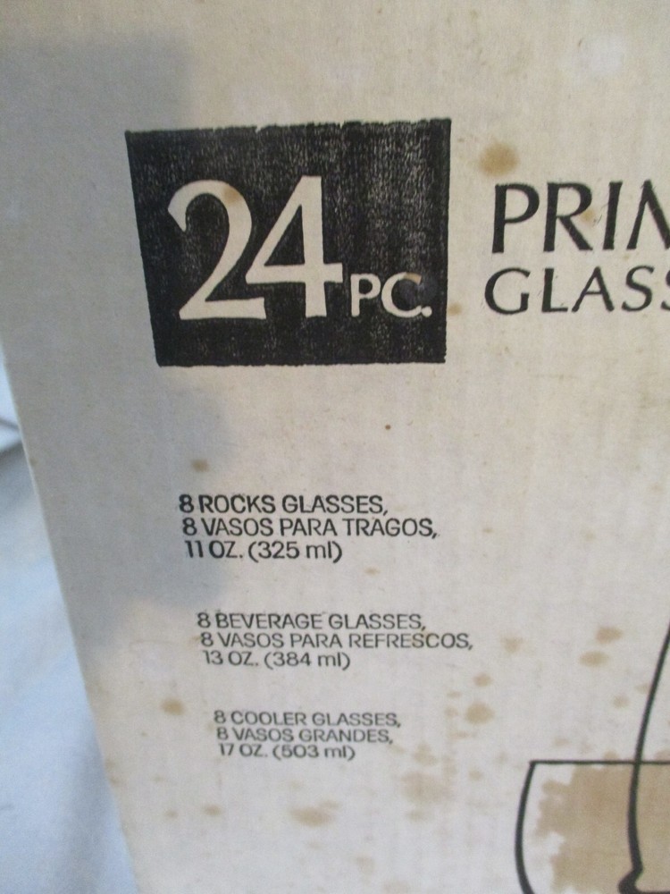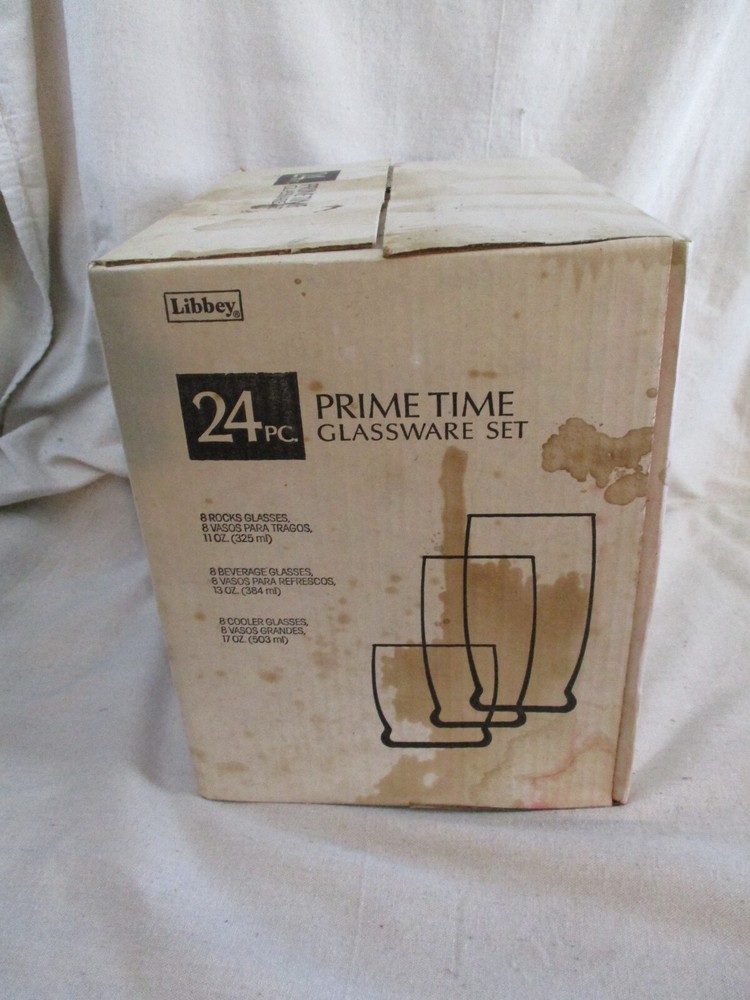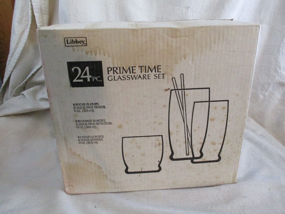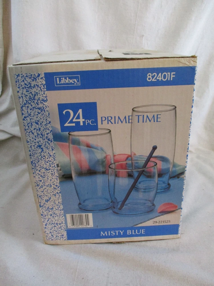 VintageLibbey 24 Piece Prime Time Glassware Set. Misty Blue. Model 82401F. New In Box. The box has some discoloration and spots from storage. 8-11 ounce Rock Glasses 8-13 ounce Beverage Glasses 8 Cooler Glasses MADE IN THE USA