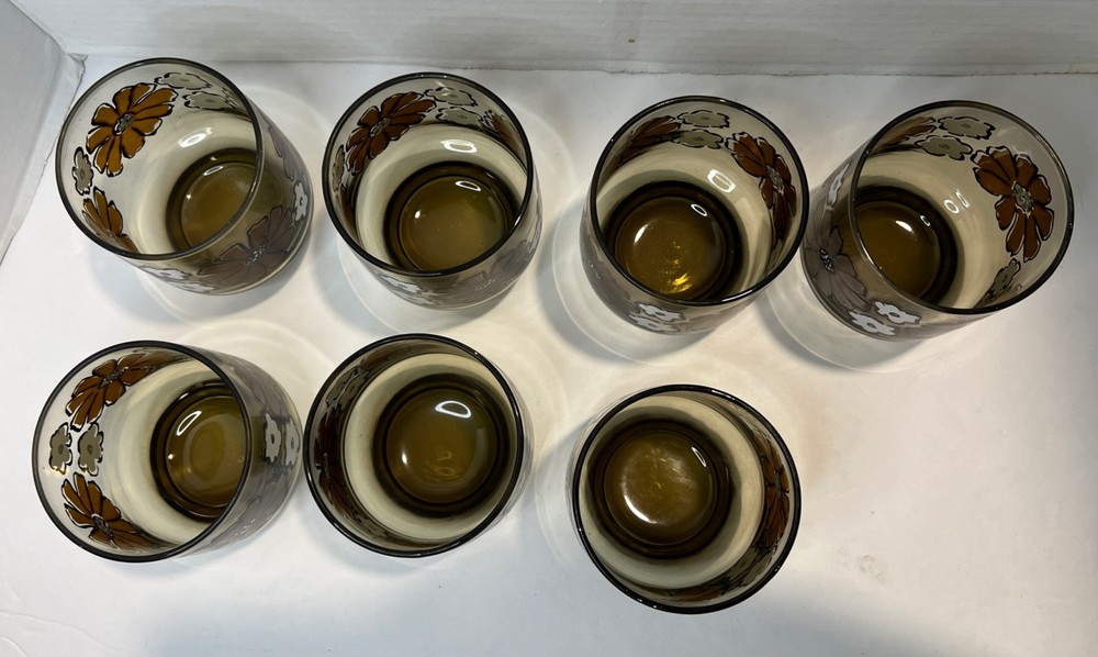 Libbey Camellia Daisy Tawny Brown Glasses Juice Set of 7 Vintage 1970s. Please see pictures. In great used condition. Check out the rest of the Libby Camellia glasses I have listed. BF L28