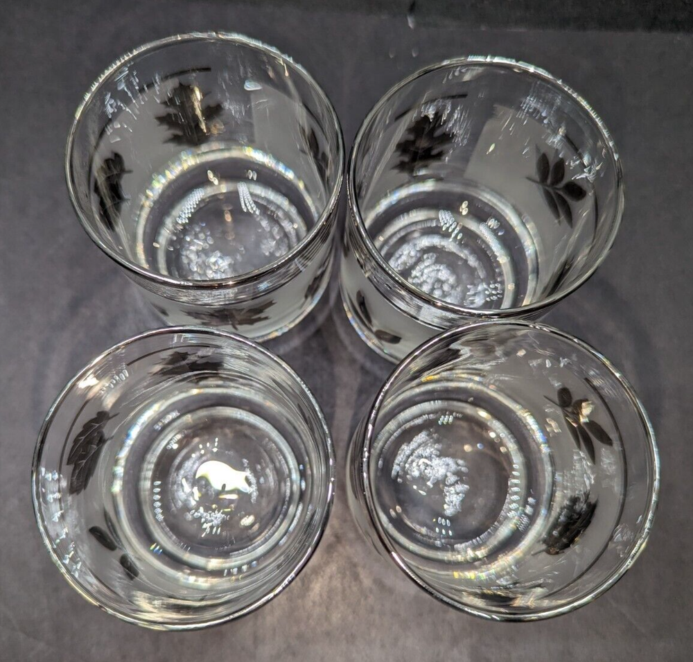 Libbey Silver Foliage Leaf 5 oz. Flat Tumbler Juice Glasses Set of 4 Drinkware. These tumblers are in lovely pre-owned condition with no damage. Please see the photos. All of my items are carefully packed for shipping, no matter their value - $5 items are wrapped with the same care as a $200 item. My goal is to have your purchase arrive safely. Large, heavy and fragile items are harder to use combined shipping with but just ask if you would like to purchase more than one item and I am more than happy to do so if feasible. Measurements are approximate or as close as I can get. Also, the color you see many not be the exact color depending on your computer or phone settings. Unpaid items will result in the buyer being blocked from further purchases. Please remit payment right away so we can get your item shipped out quickly.